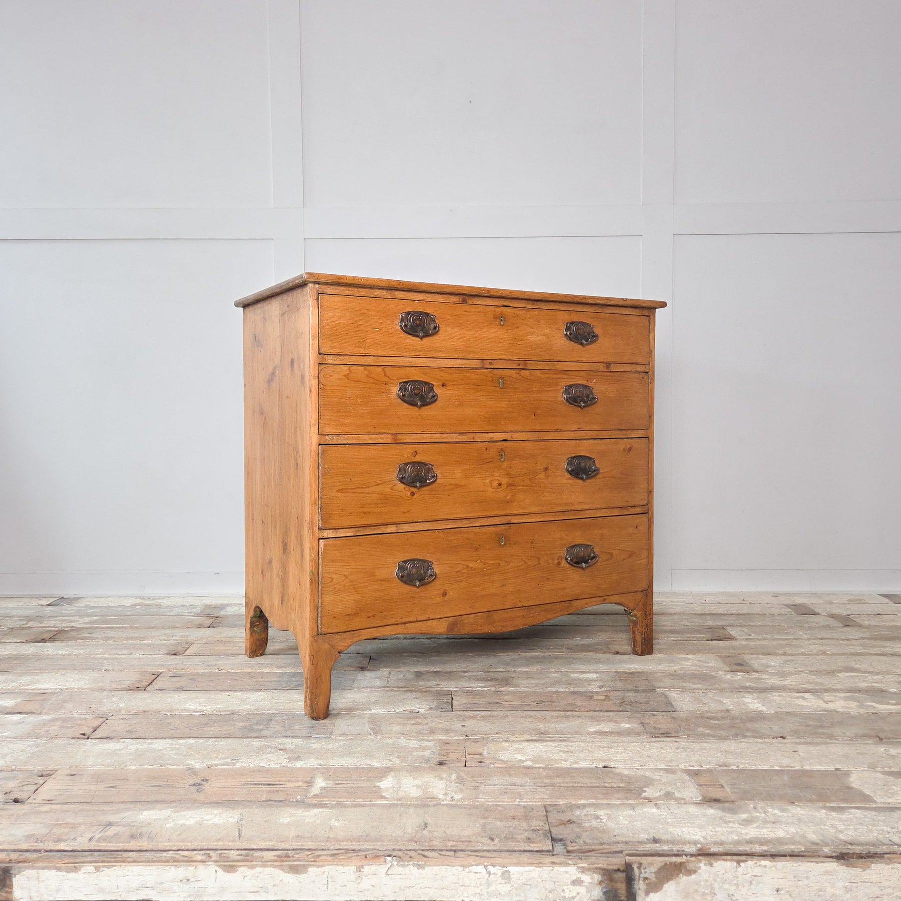 A solid and well-proportioned chest with the simple lines typical of Georgian furniture, offering good storage across five drawers. Each one is fitted with oval brass pulls that complement the mellow tone of the pine,while the shaped apron and bracket feet complete the piece with a simple, traditional finish.