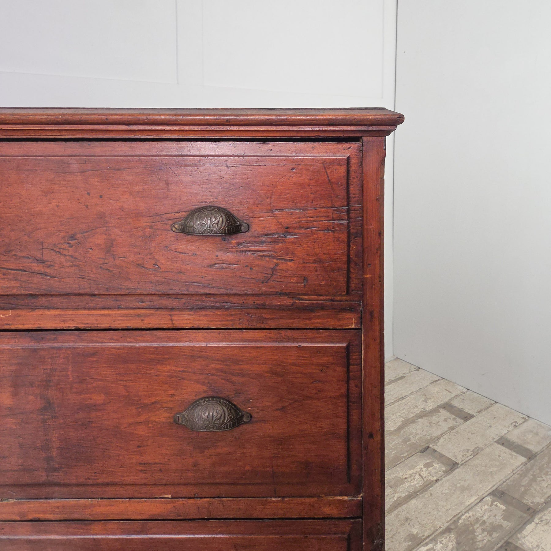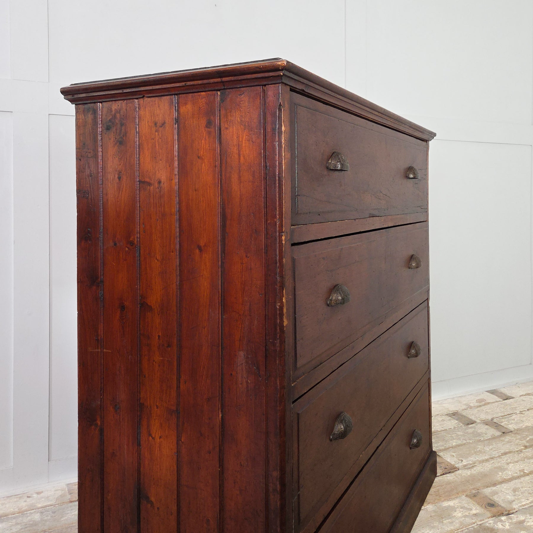 A handsome early 20th-century pine chest of drawers featuring four drawers and finished in a rich dark stain.