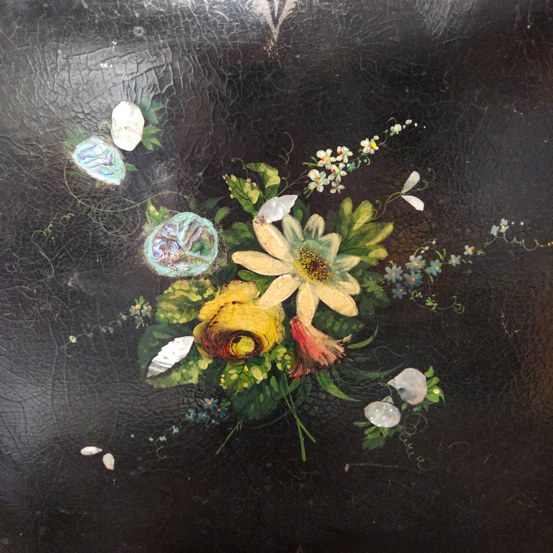 This beautiful Victorian tray features a black lacquered finish with overpainted detailing, typical of Victorian papier-mâché work. The shaped ogee (scalloped) shaped rim is decorated with painted and gilt patterns while the centre is finished with a vibrant floral bouquet accompanied by delicate mother of pearl inlay.