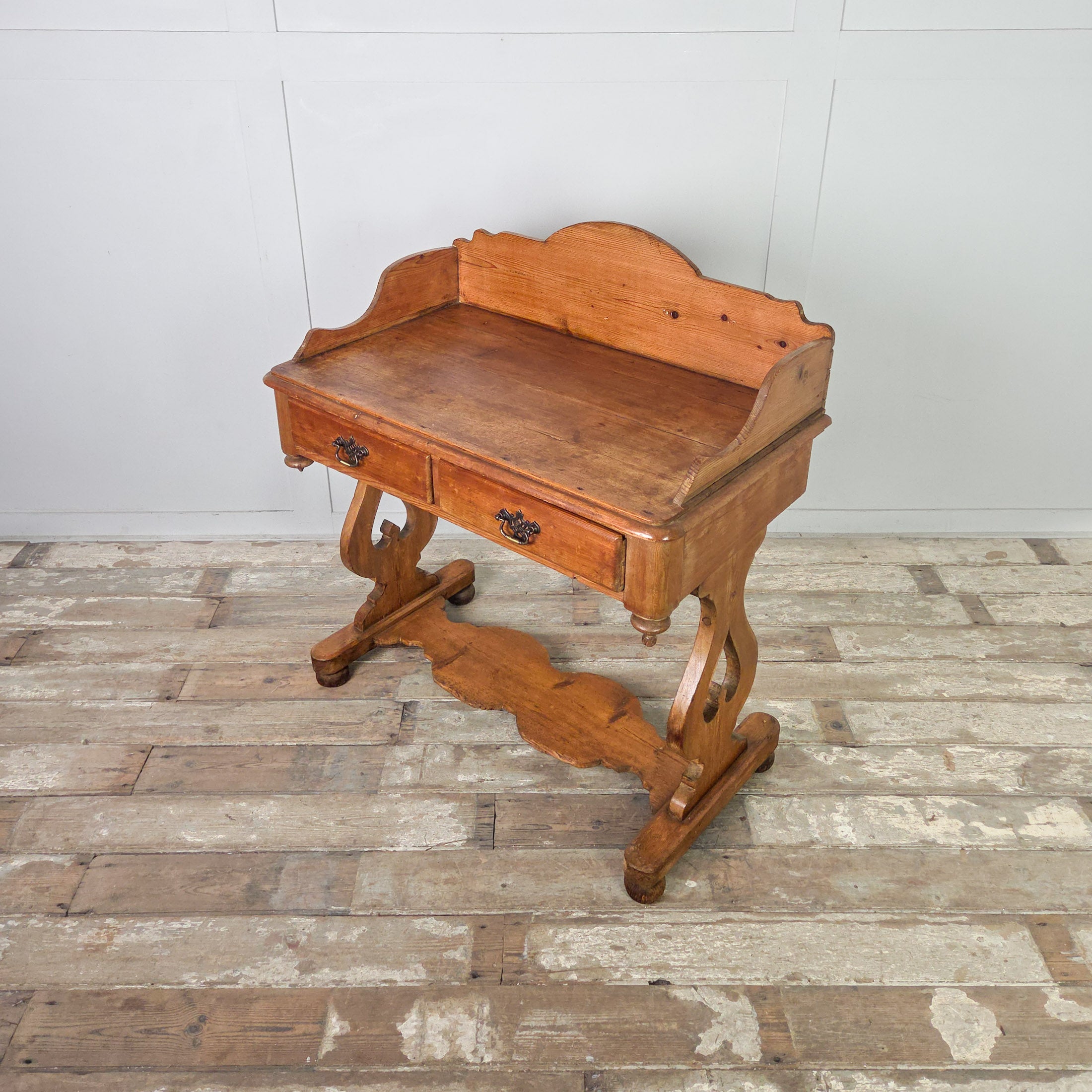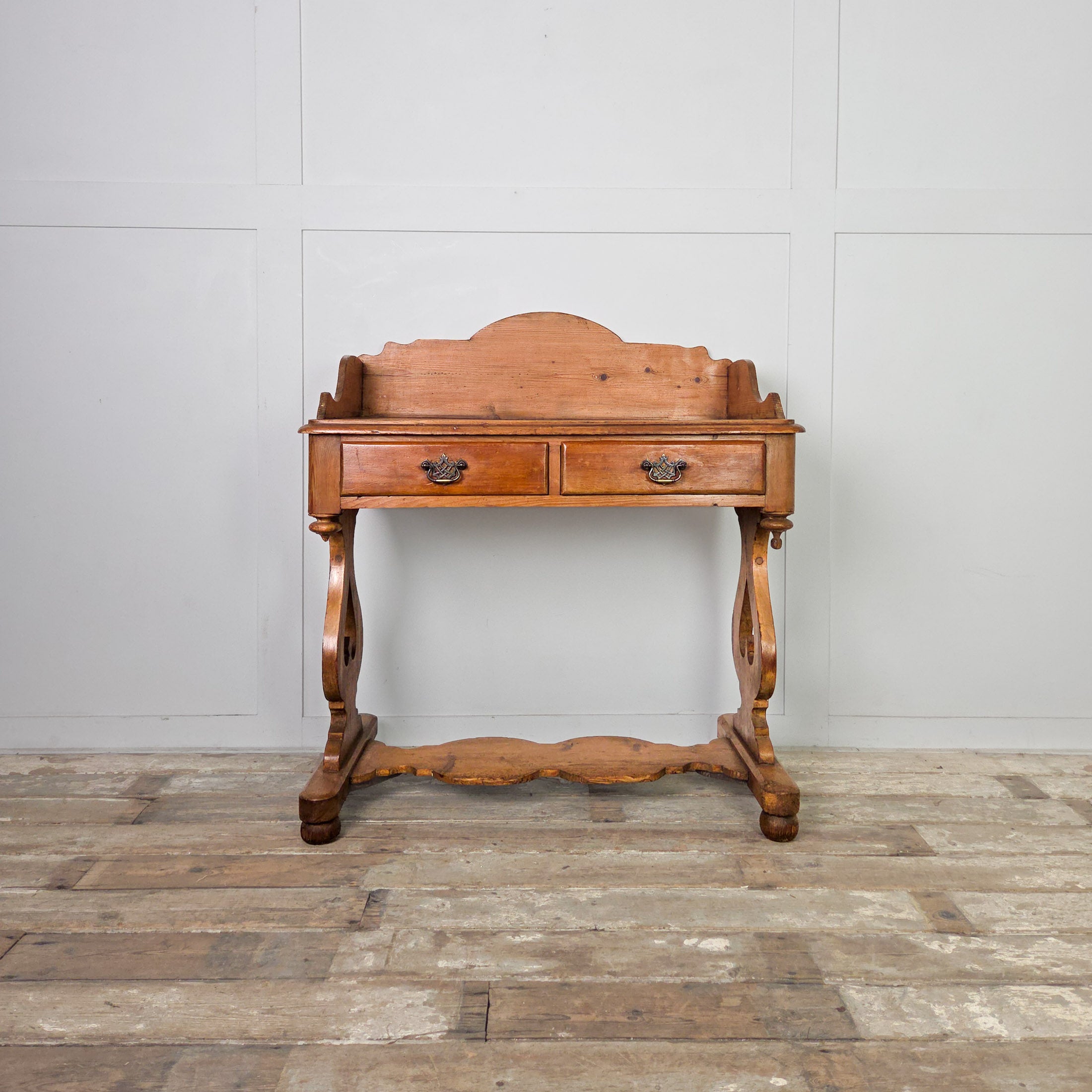 An elegant antique pine washstand dating to the late 19th century, with a shaped gallery back, two drawers and a lower shelf.