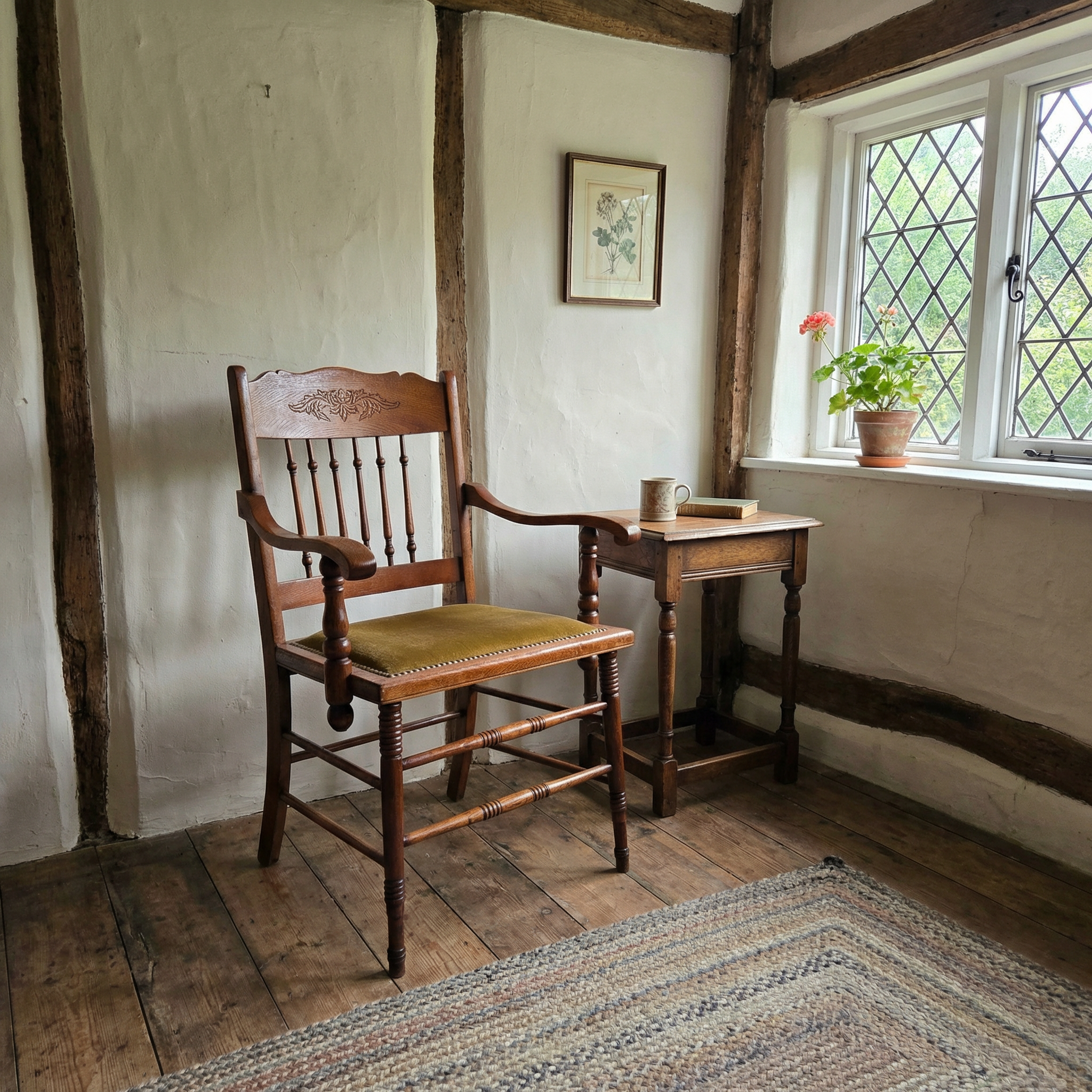 This beautiful armchair features a warm oak patina and is formed with sweeping armrests and decorative ring-turned front legs, joined by lower stretchers at the base. The seat is upholstered in mustard-coloured velvet and finished with stud detailing.
