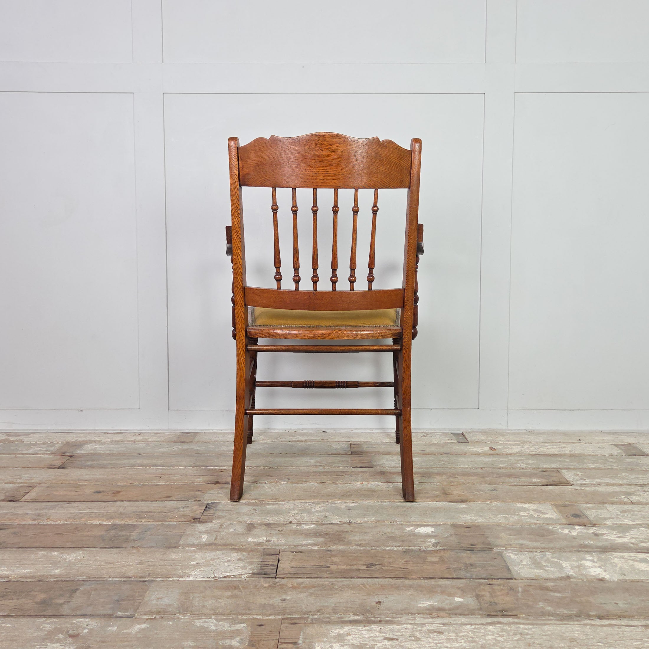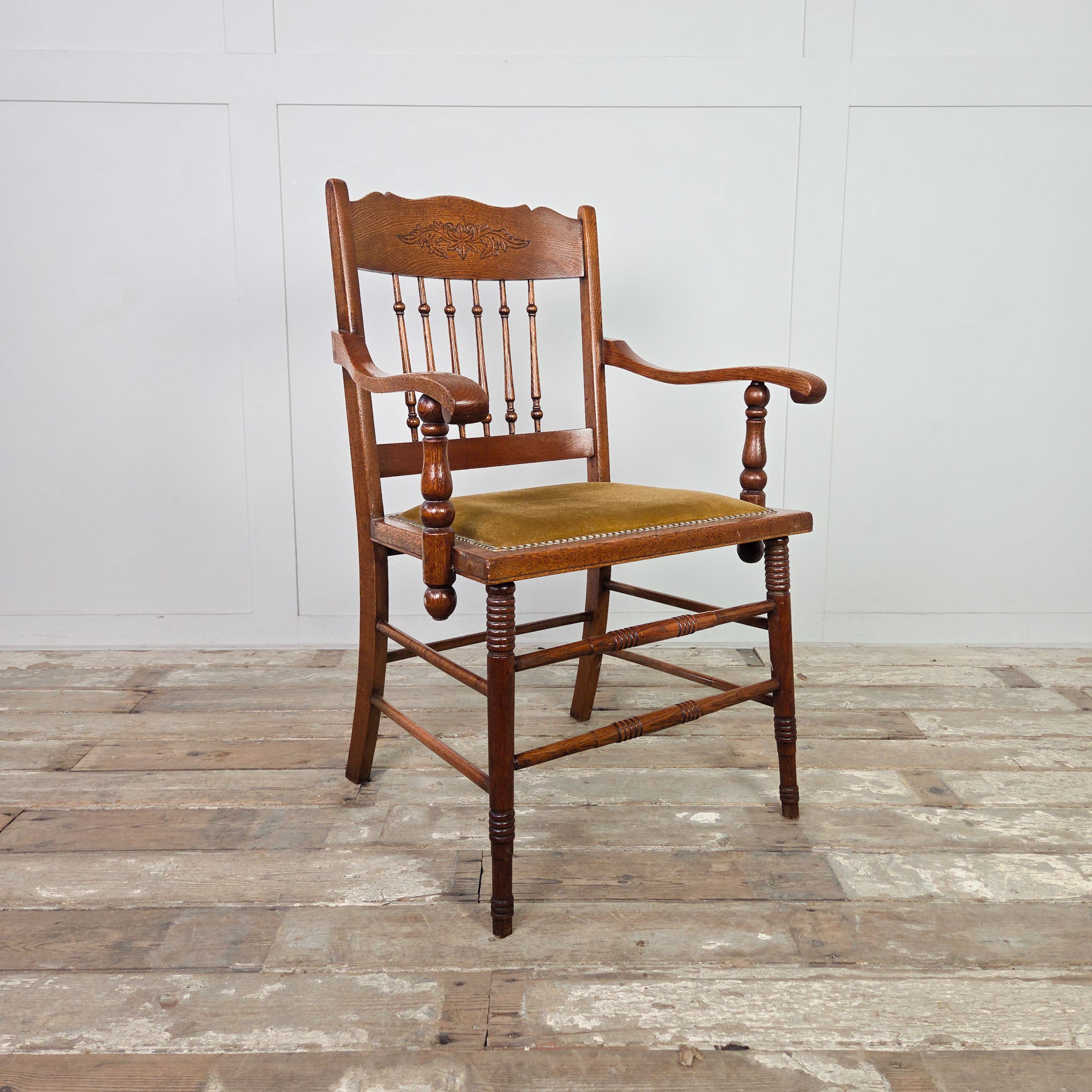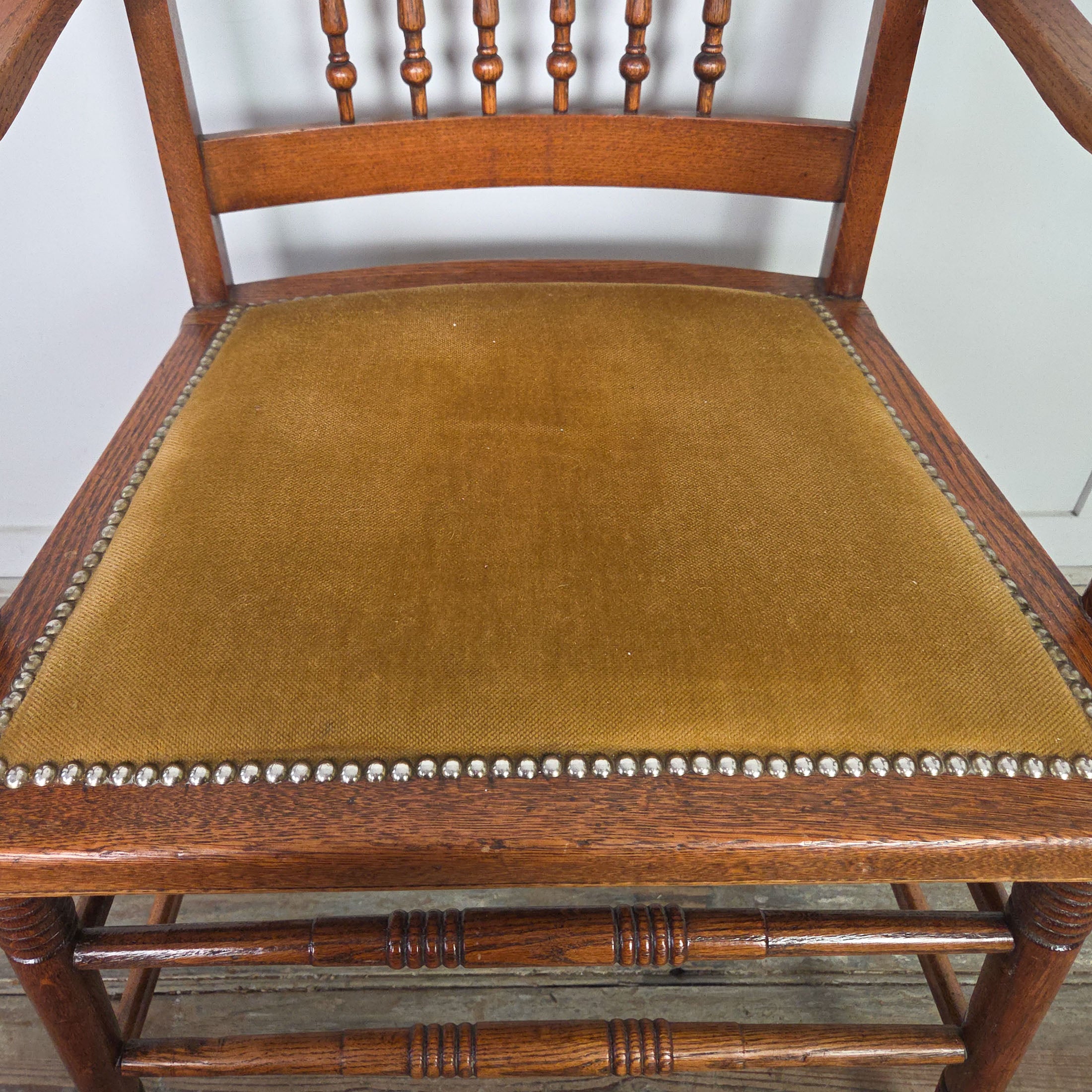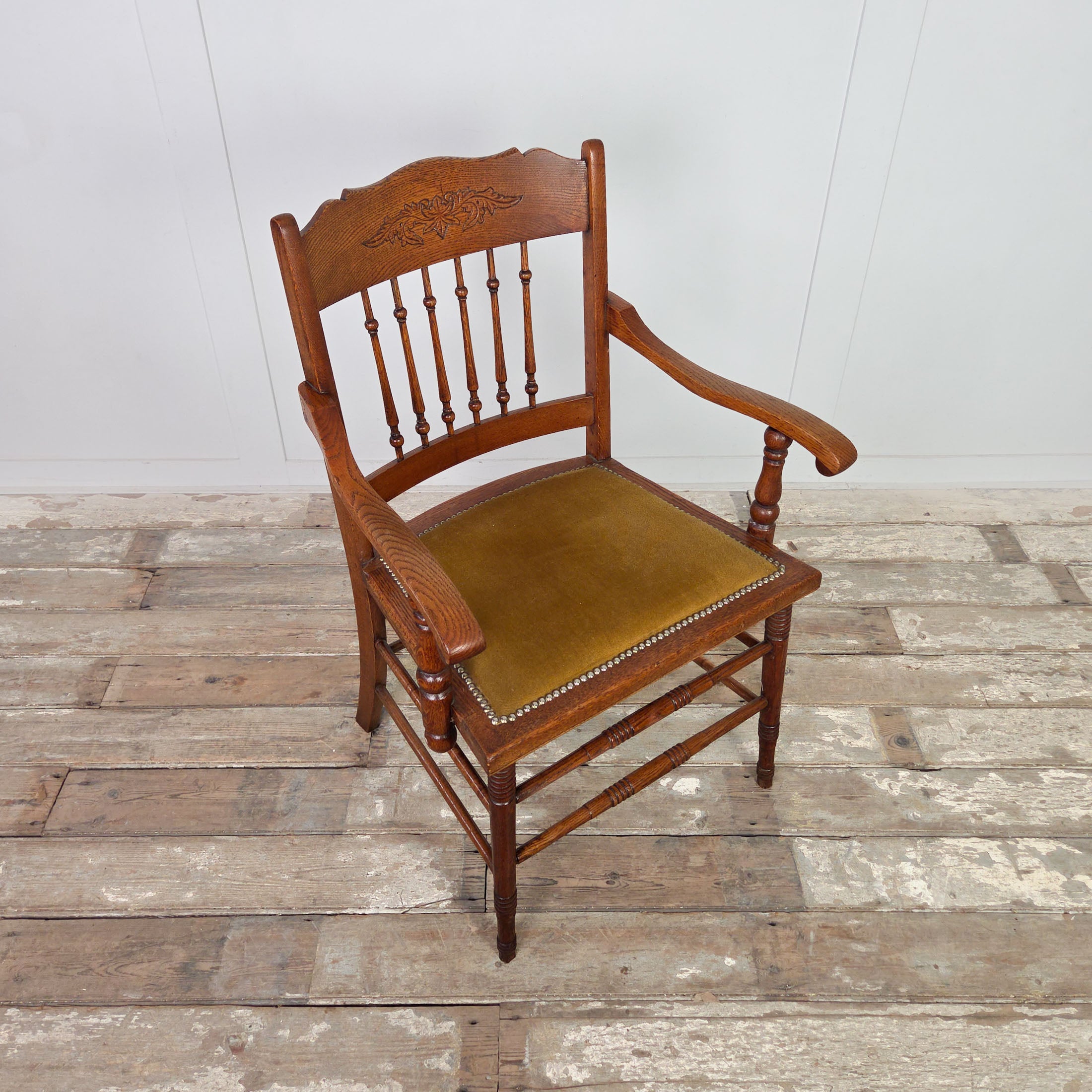 An English Edwardian oak armchair (circa 1900-1909) featuring a spindle back and upholstered velvet seat.