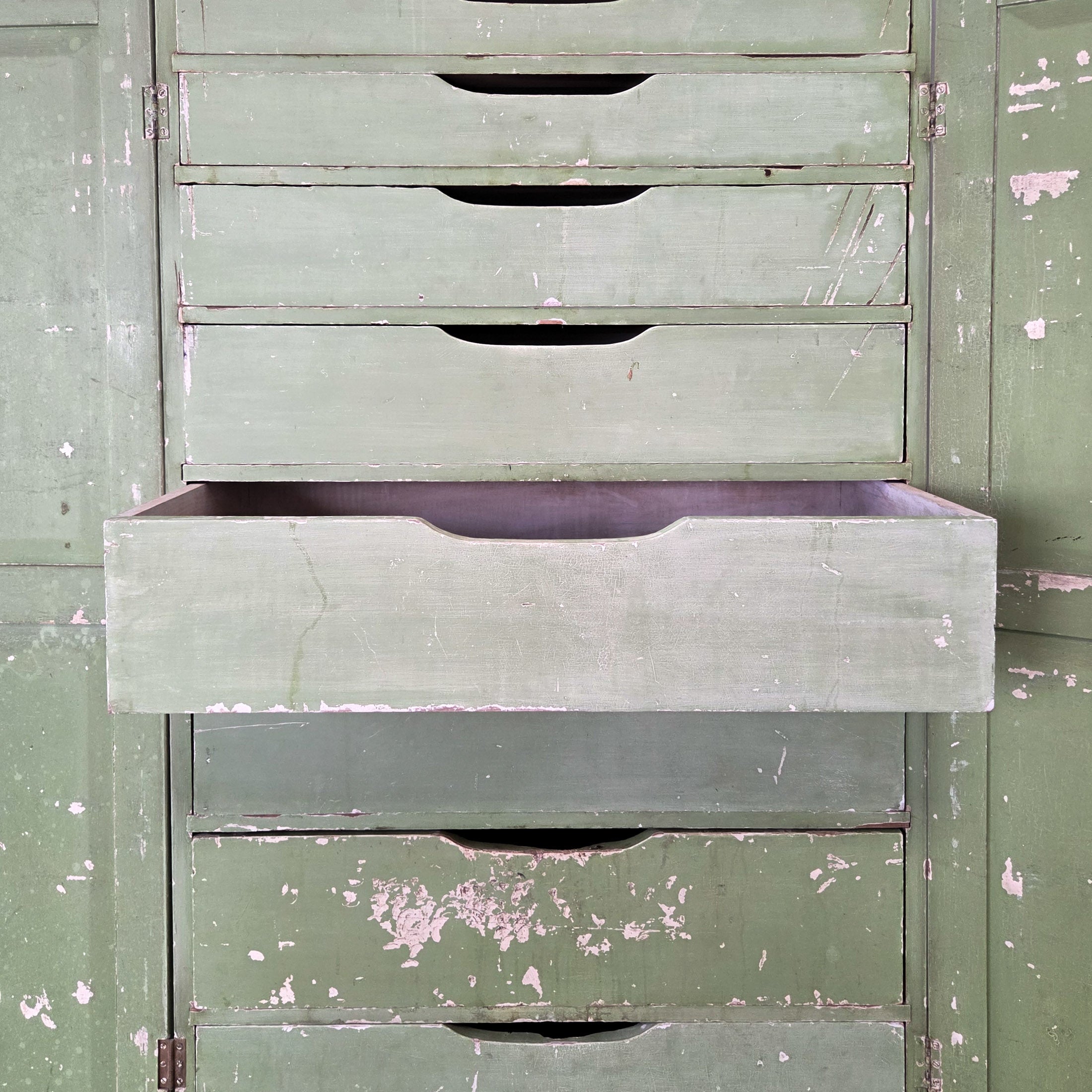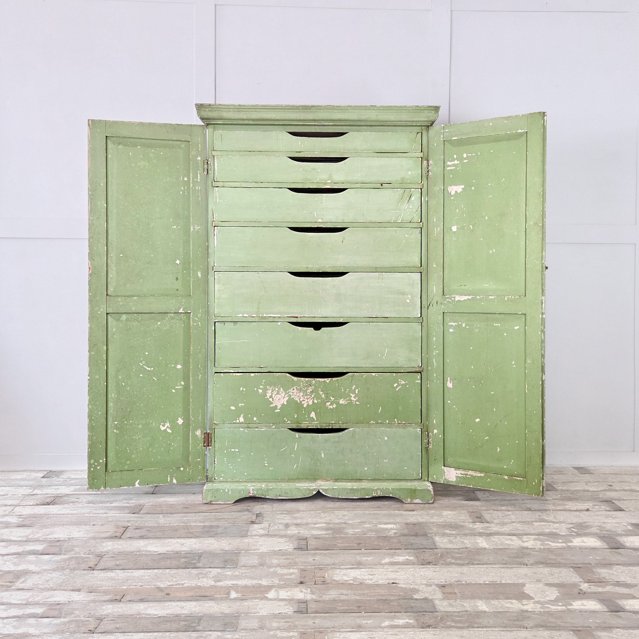 Inside, this country cupboard houses a bank of eight drawers with slatted bases, each graduating in depth with the largest at the bottom.