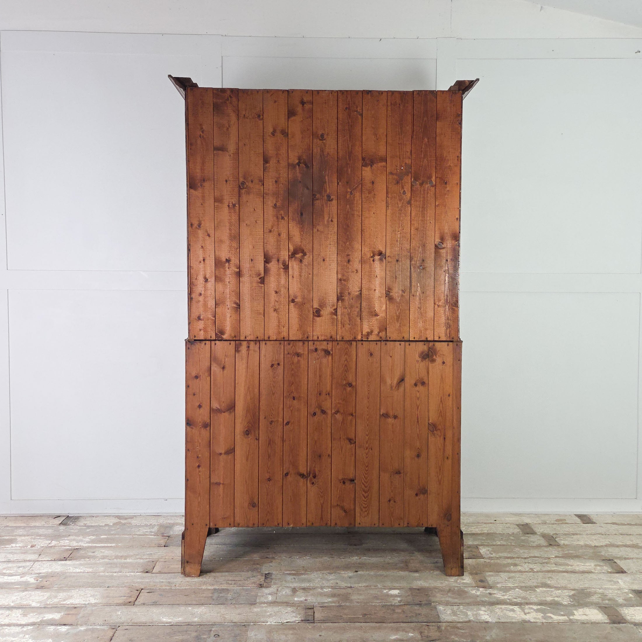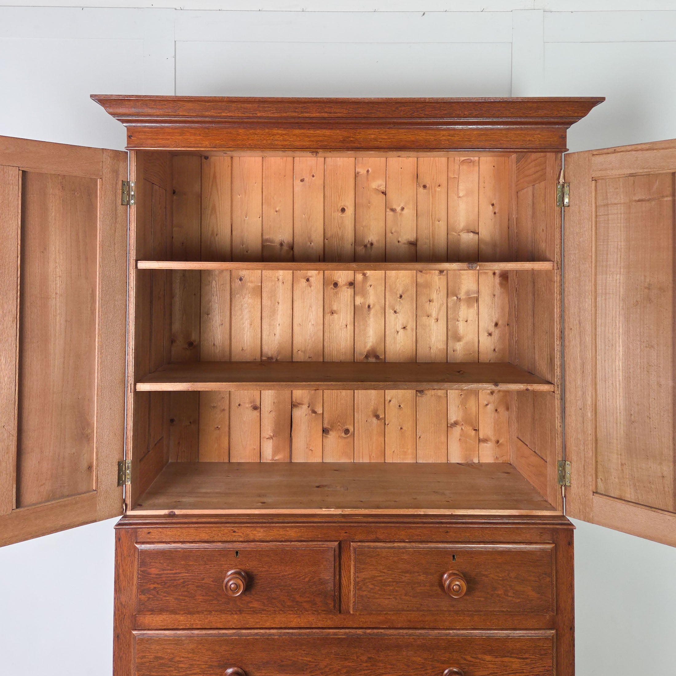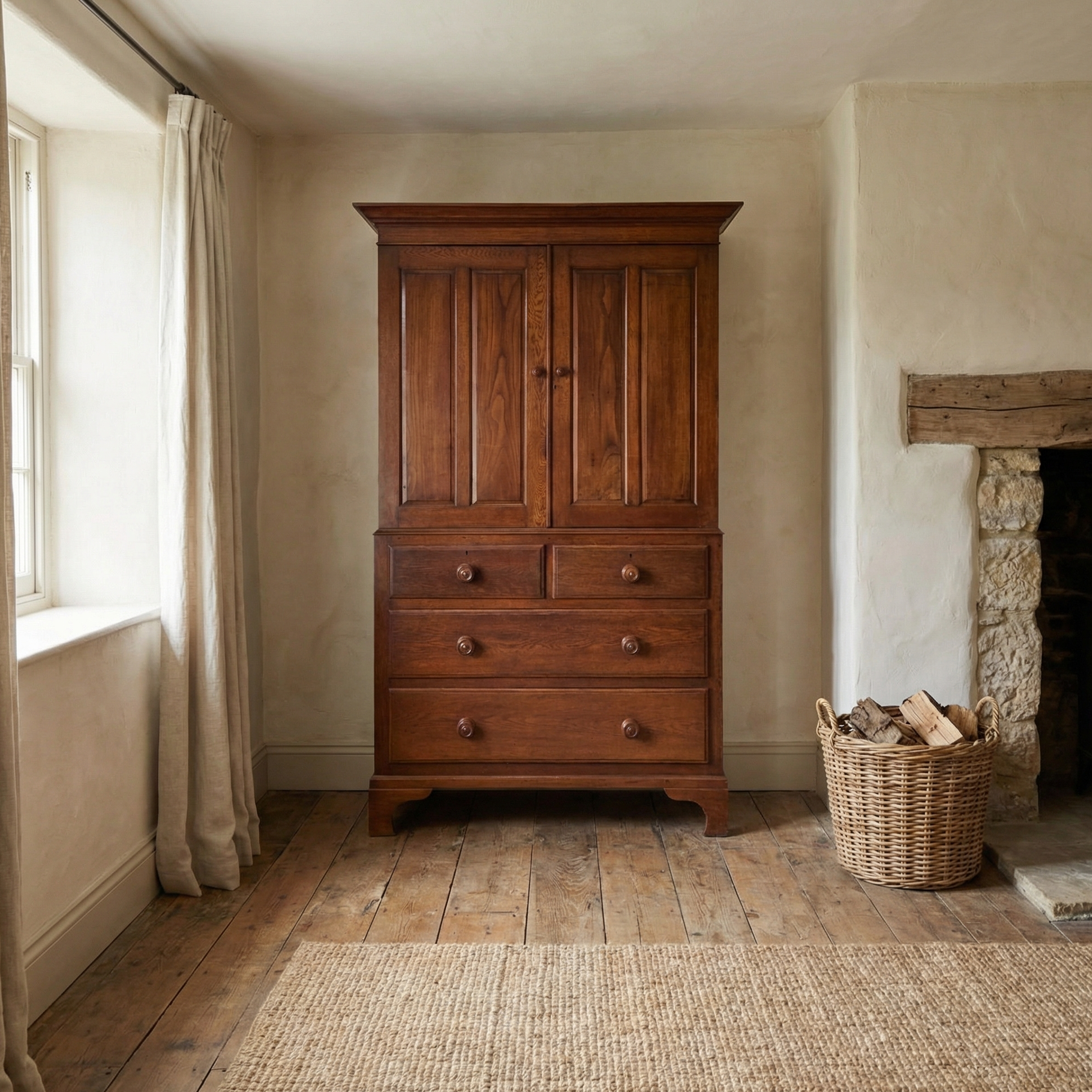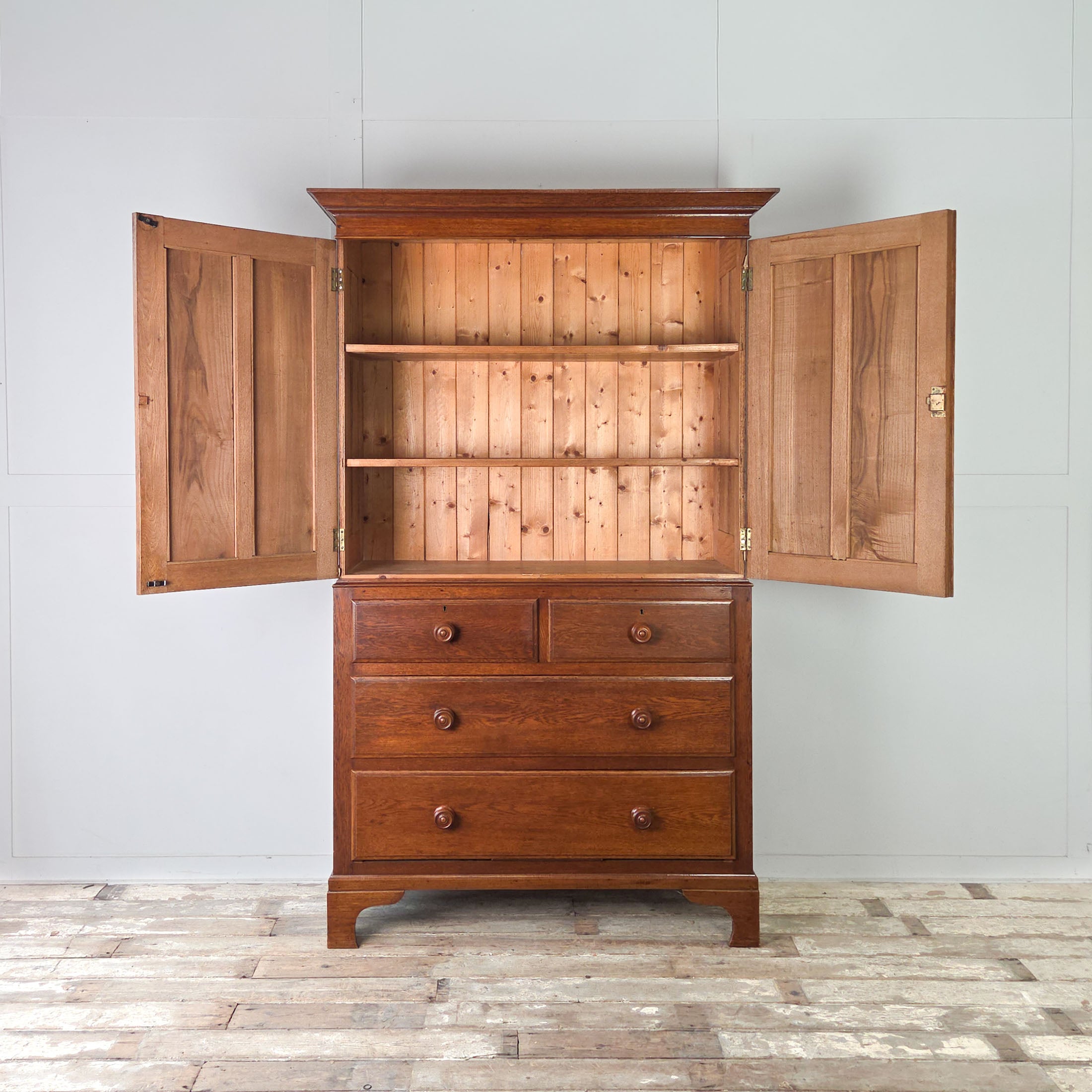 Dating from the 1920s–1930s, this piece reflects the influence of the Arts & Crafts style and the design associated with Heals and the Cotswold School. The upper section is fitted with two panelled doors which open to reveal internal shelving, while the base is arranged with two short drawers over two full-width drawers. Each drawer is finished with turned wooden knobs, and the whole piece stands on bracket feet.