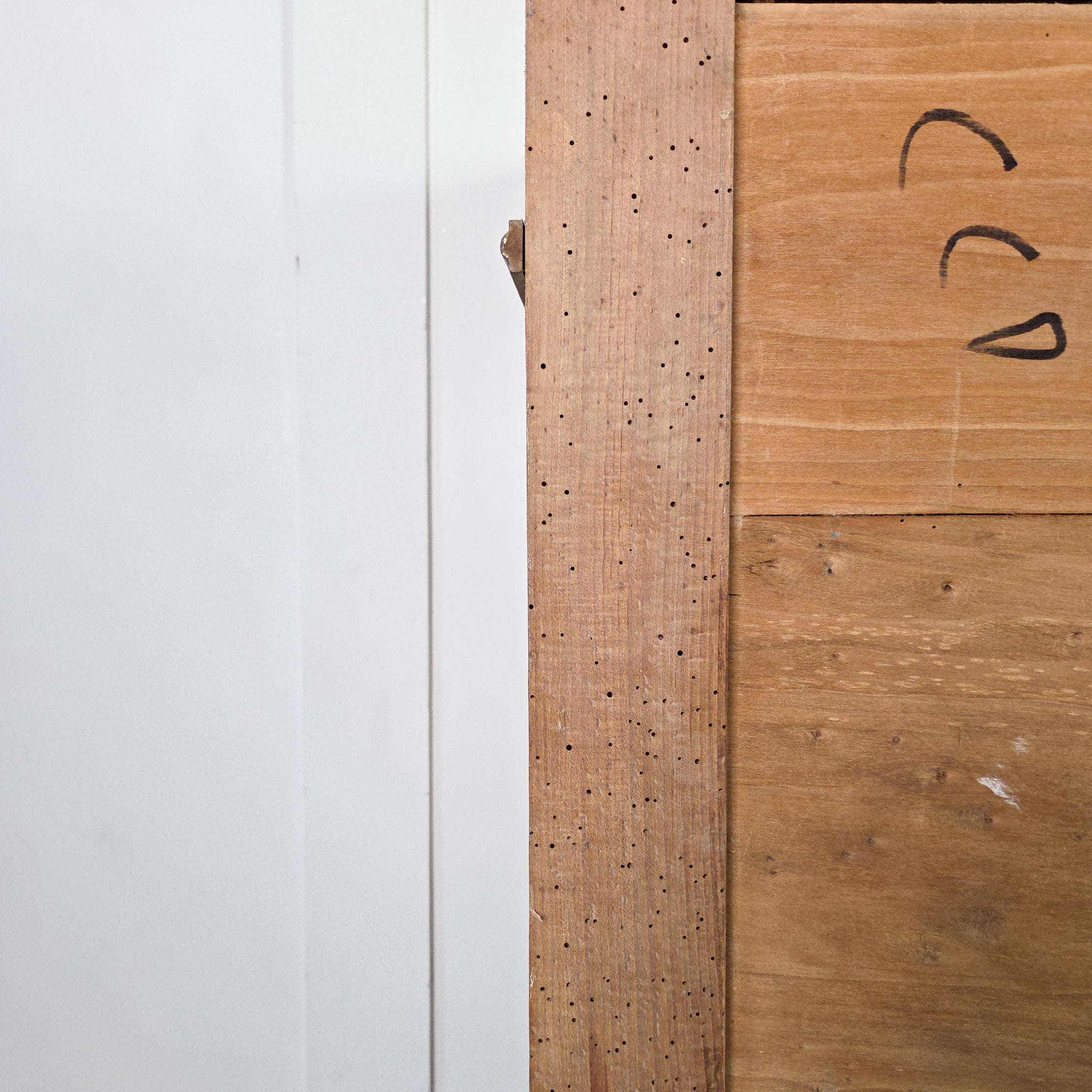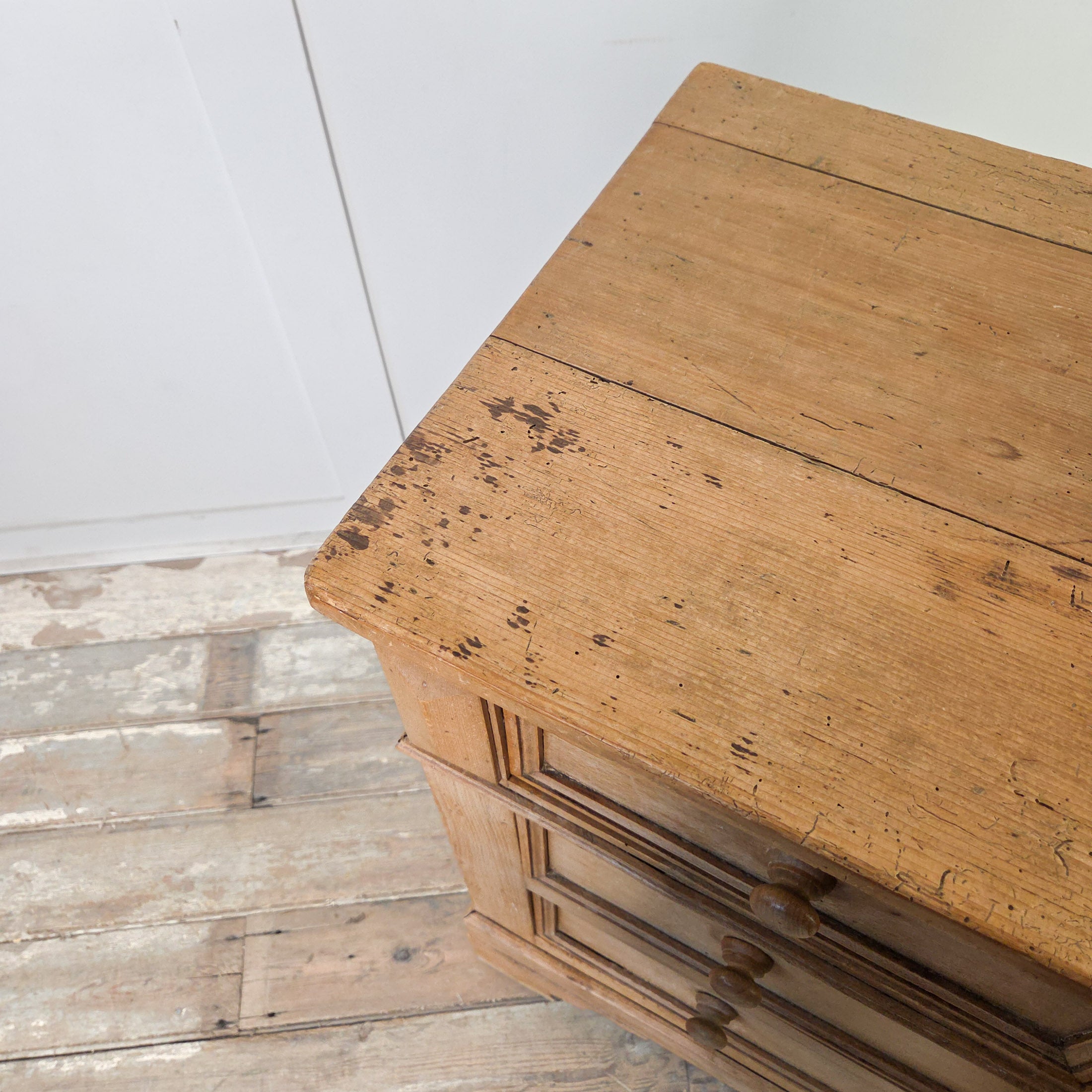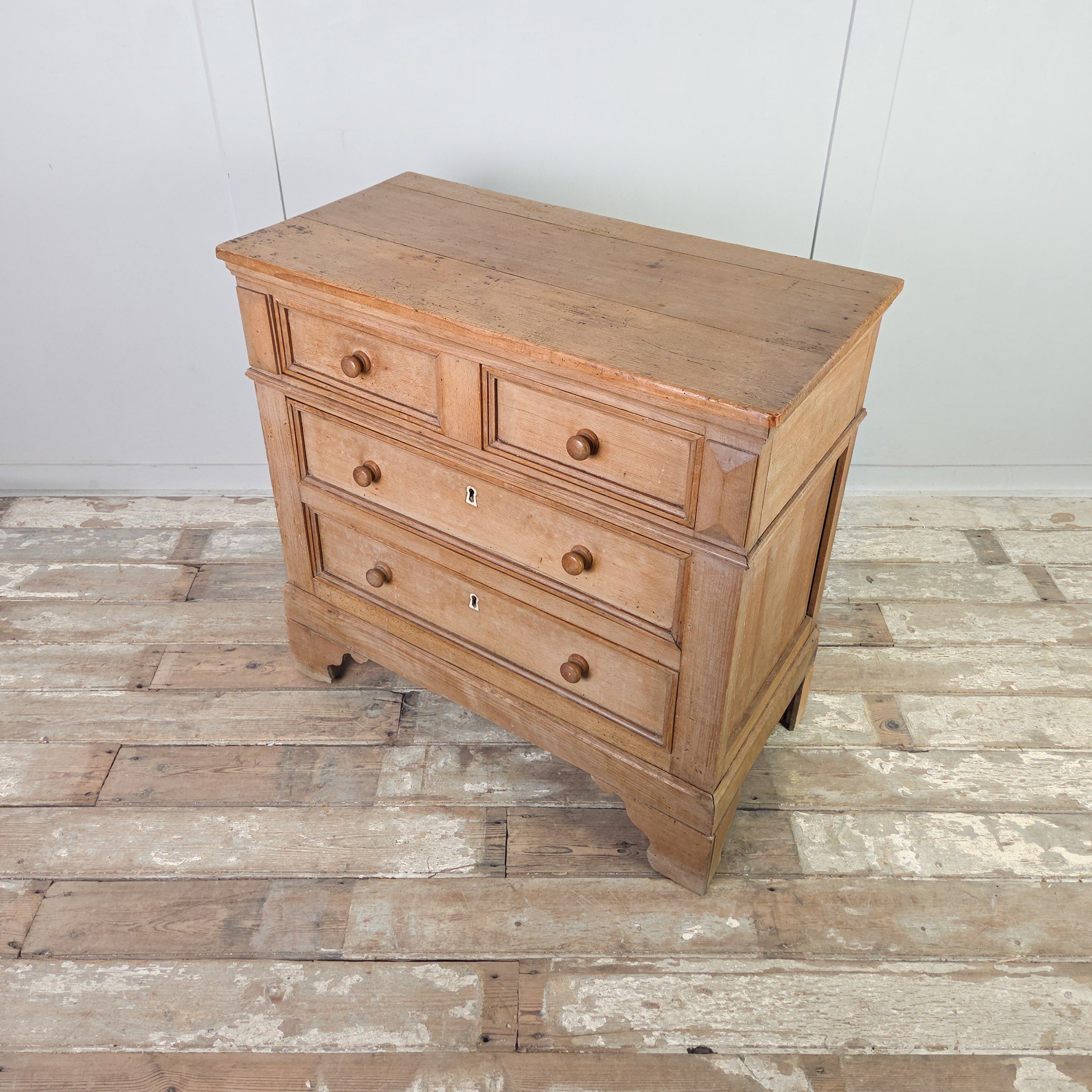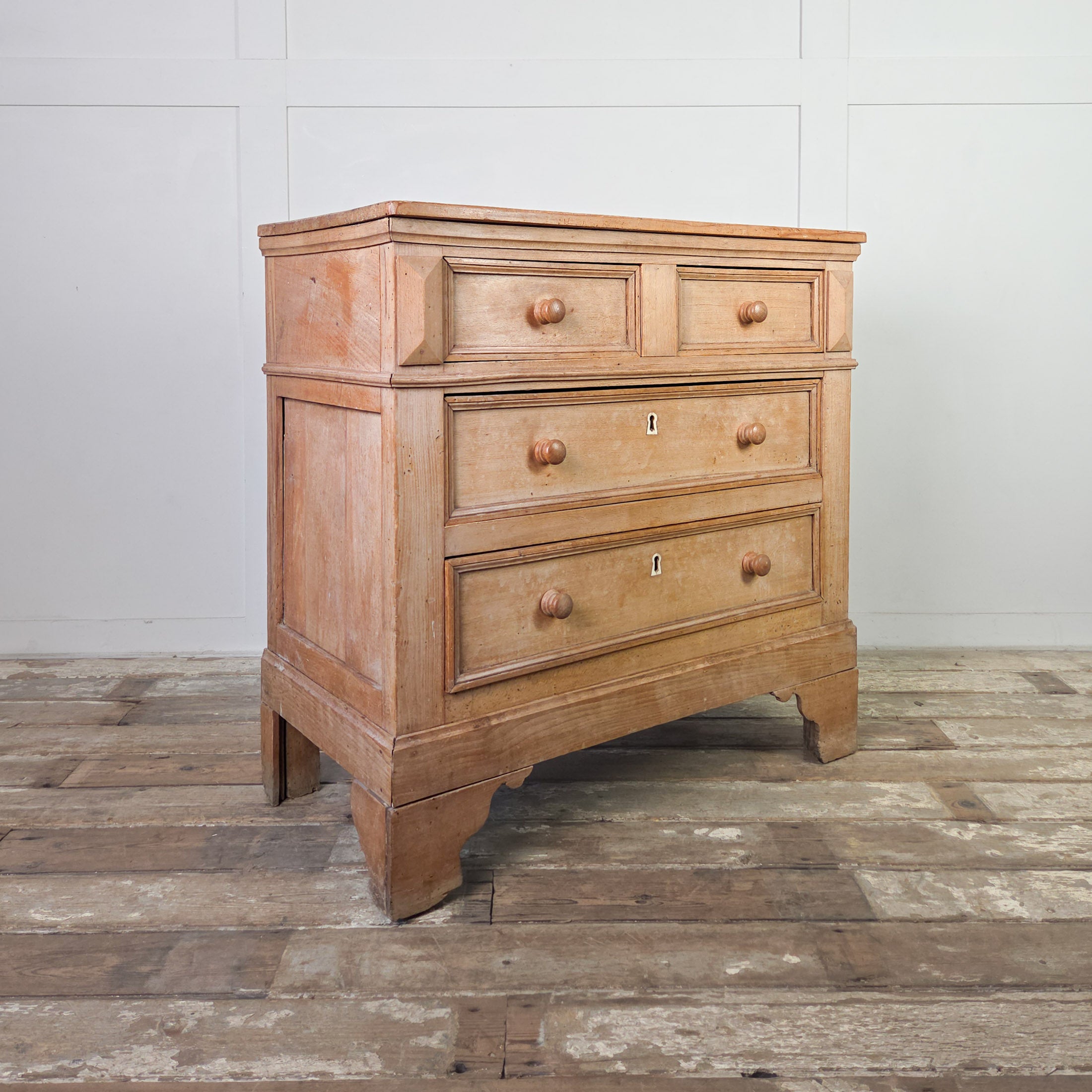 A well-proportioned piece combining pine and ash, with simple lines and neatly panelled sides. The two short drawers sit above two long, all fitted with round wooden knobsand ivory escutcheons, while the shaped bracket-style feet lift the piece and give it height.
