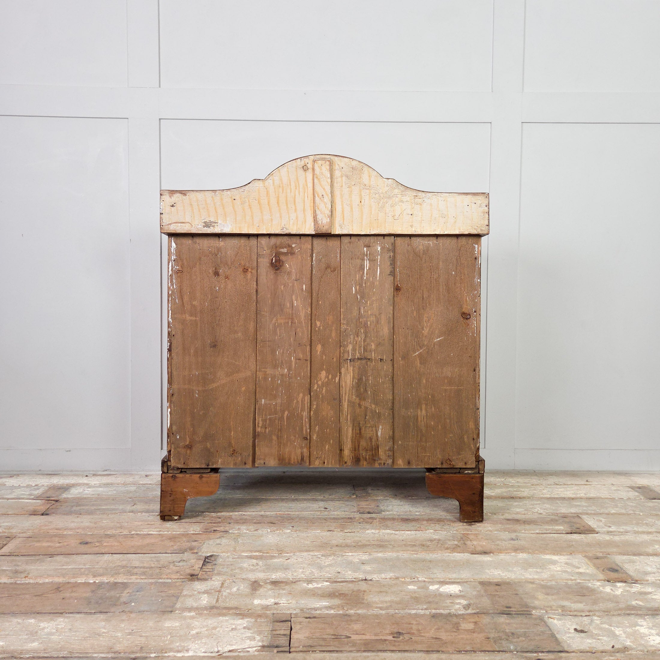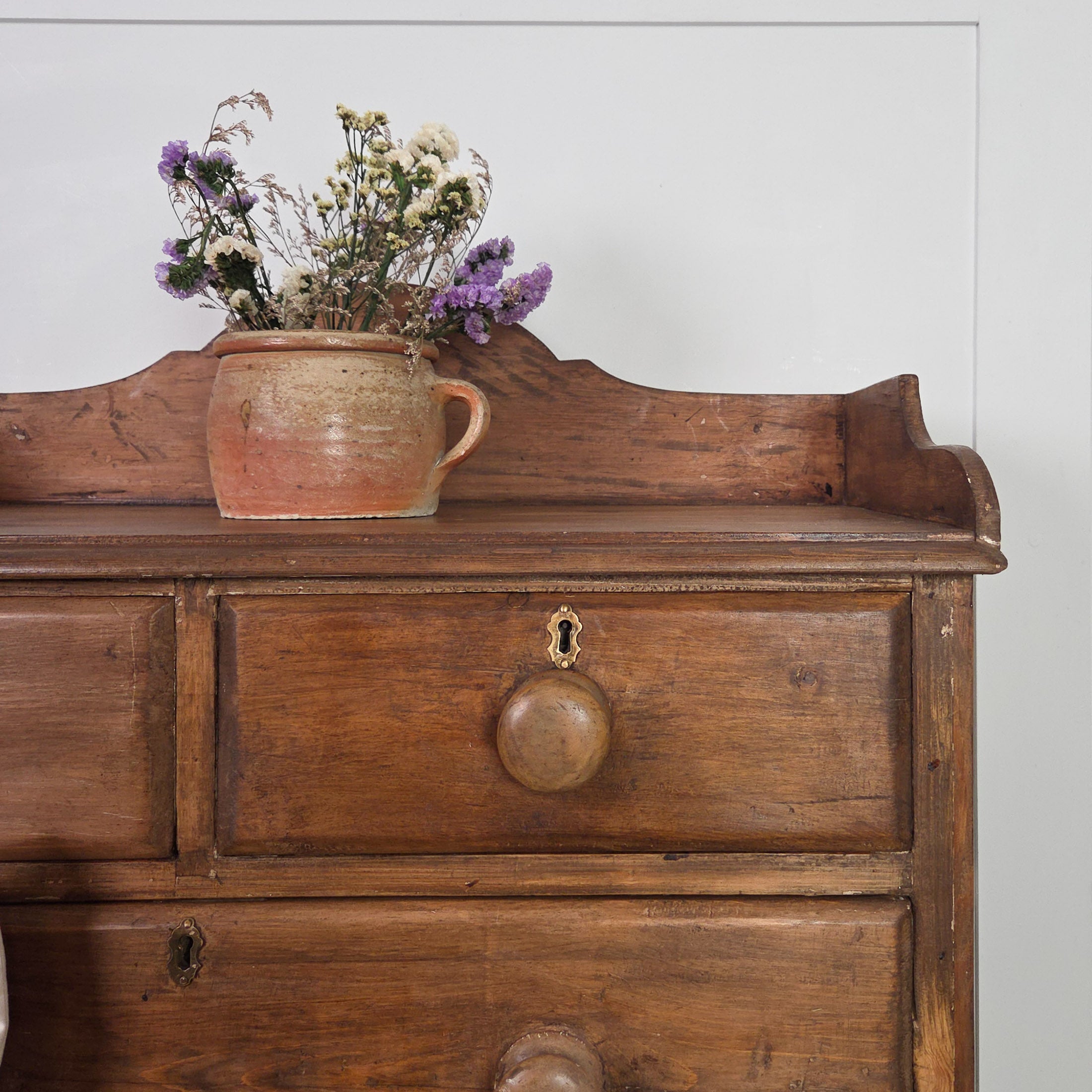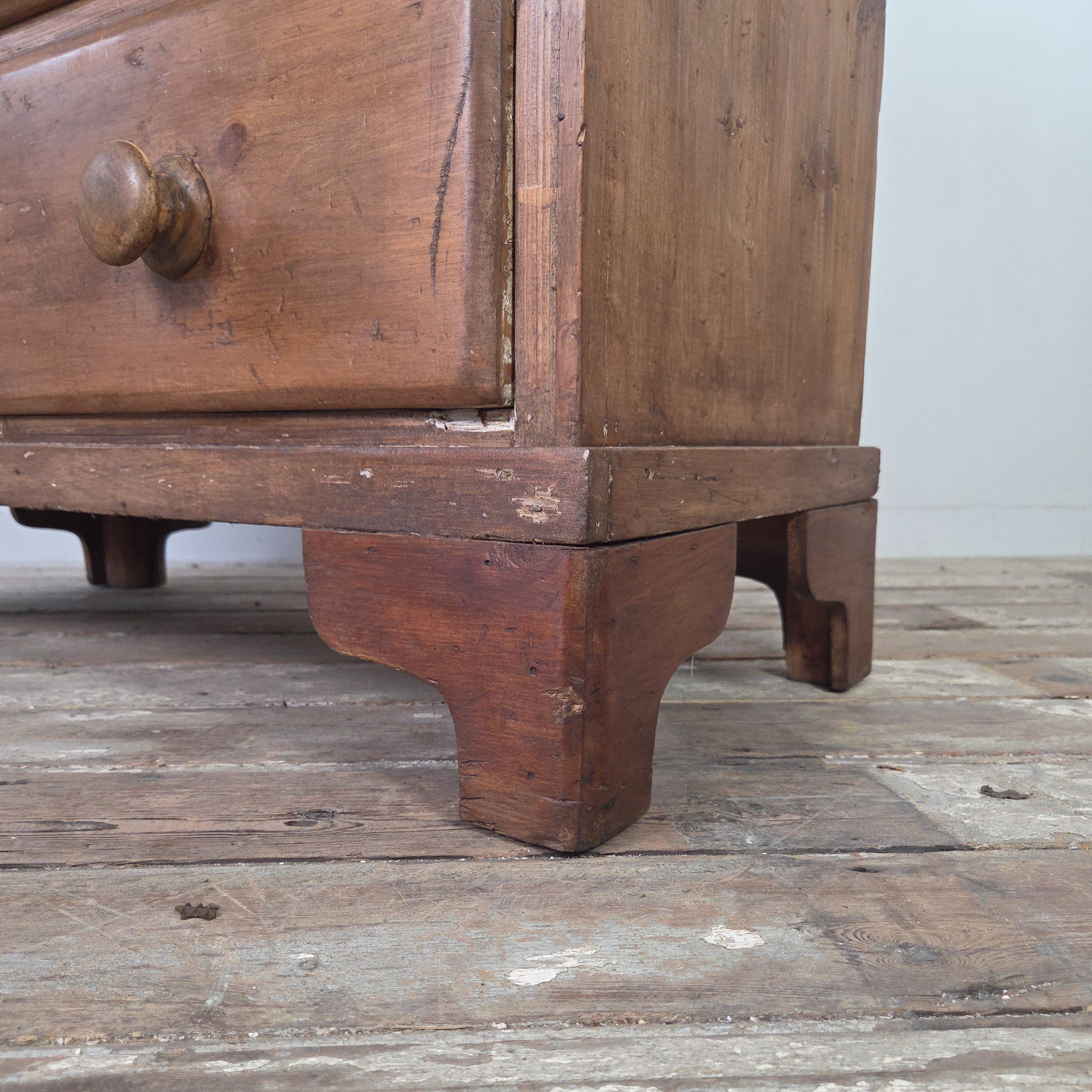 A well-proportioned chest with two short drawers above two long, each with matching wooden knobs. Raised on later added bracket style feet, this piece also features a shaped gallery top, designed to keep items from falling off the back and sides.