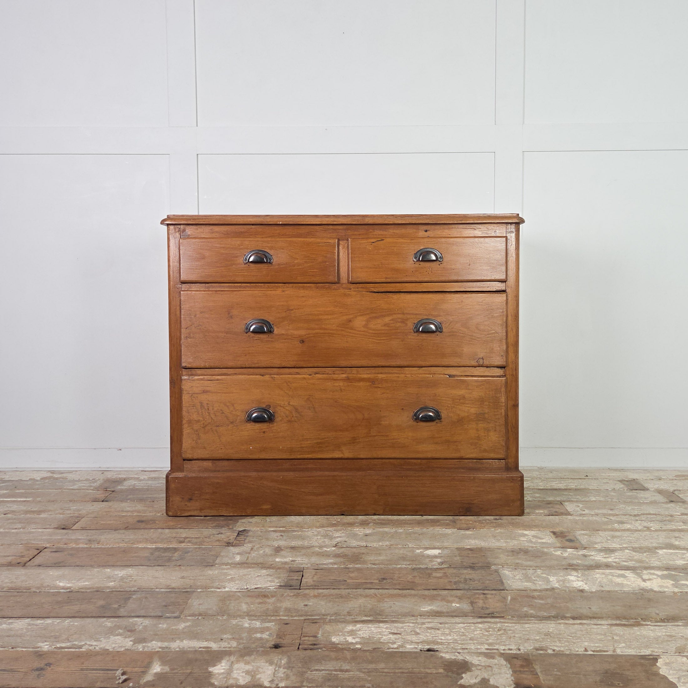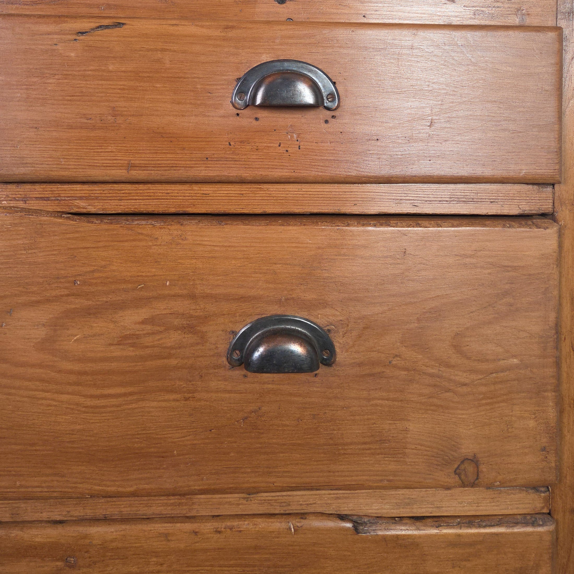 This antique chest provides ample, practical storage with its four generously sized drawers. The drawers are fitted with later-added cup handles that remain sympathetic to the piece’s original style. It has been sealed with a pine wax to enhance and protect the natural patina.