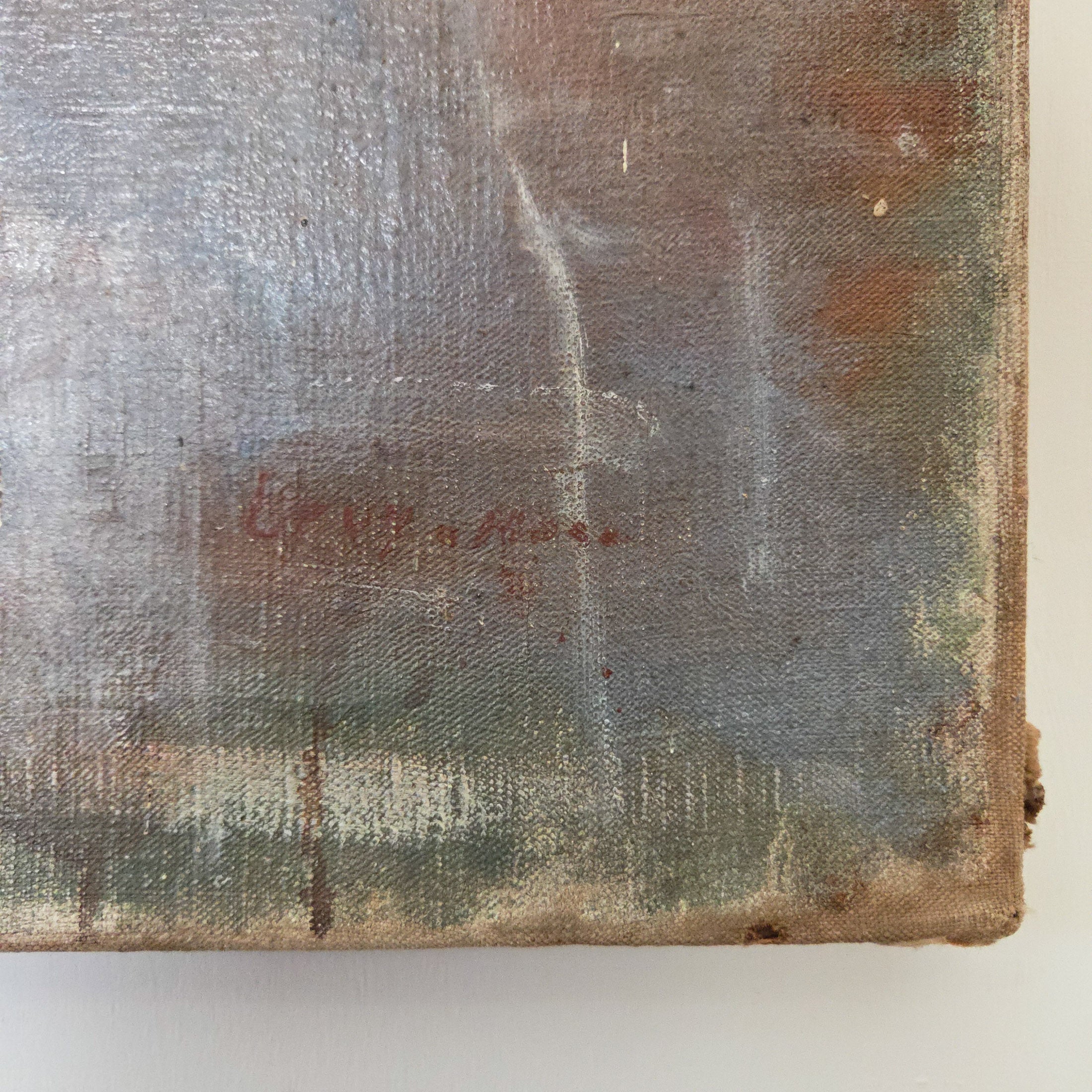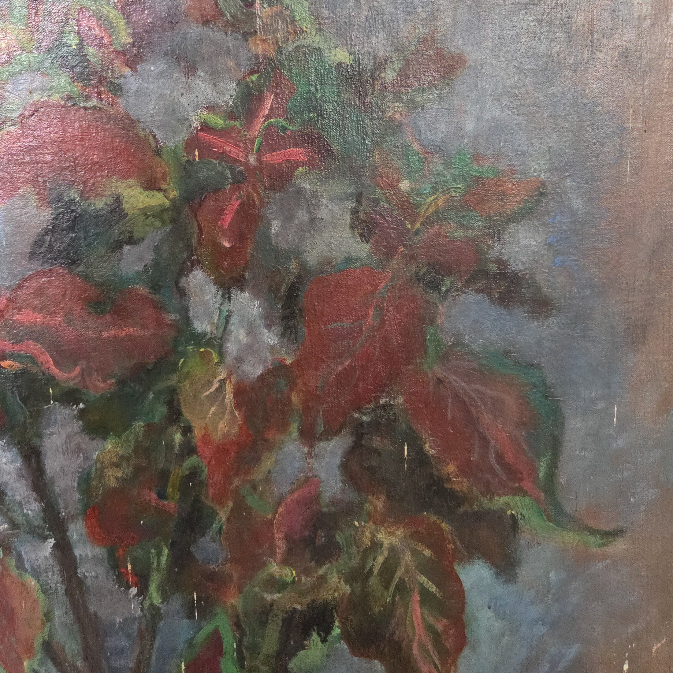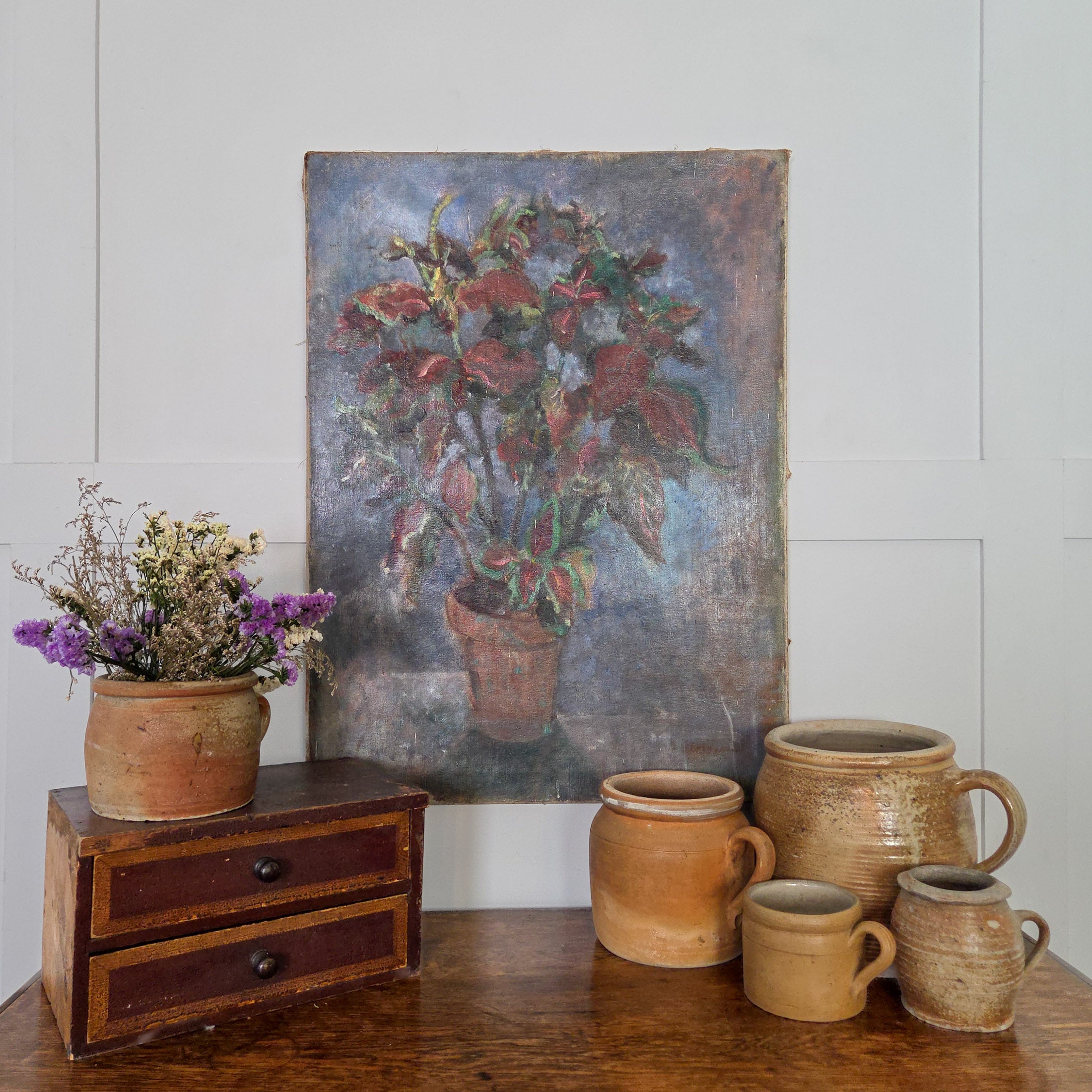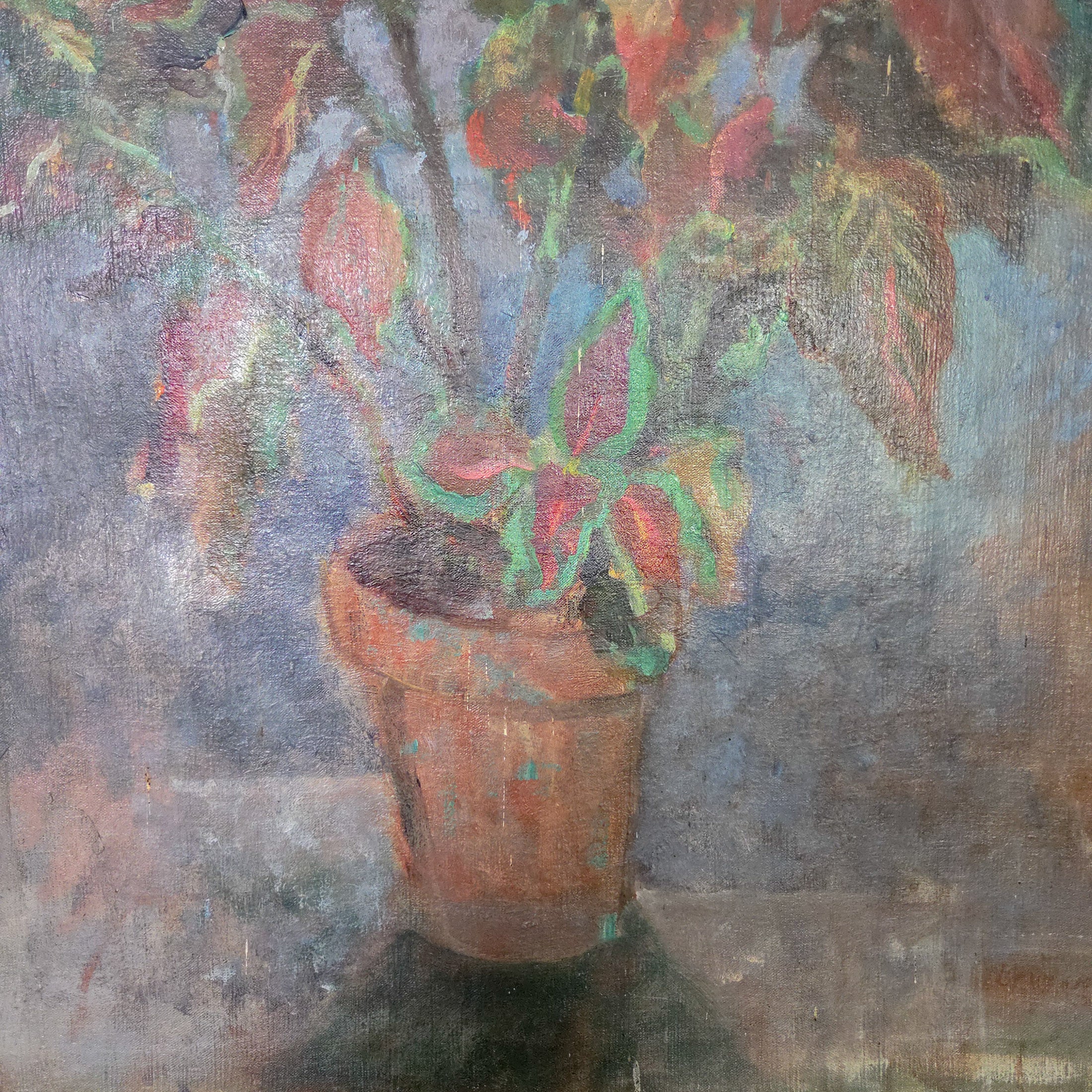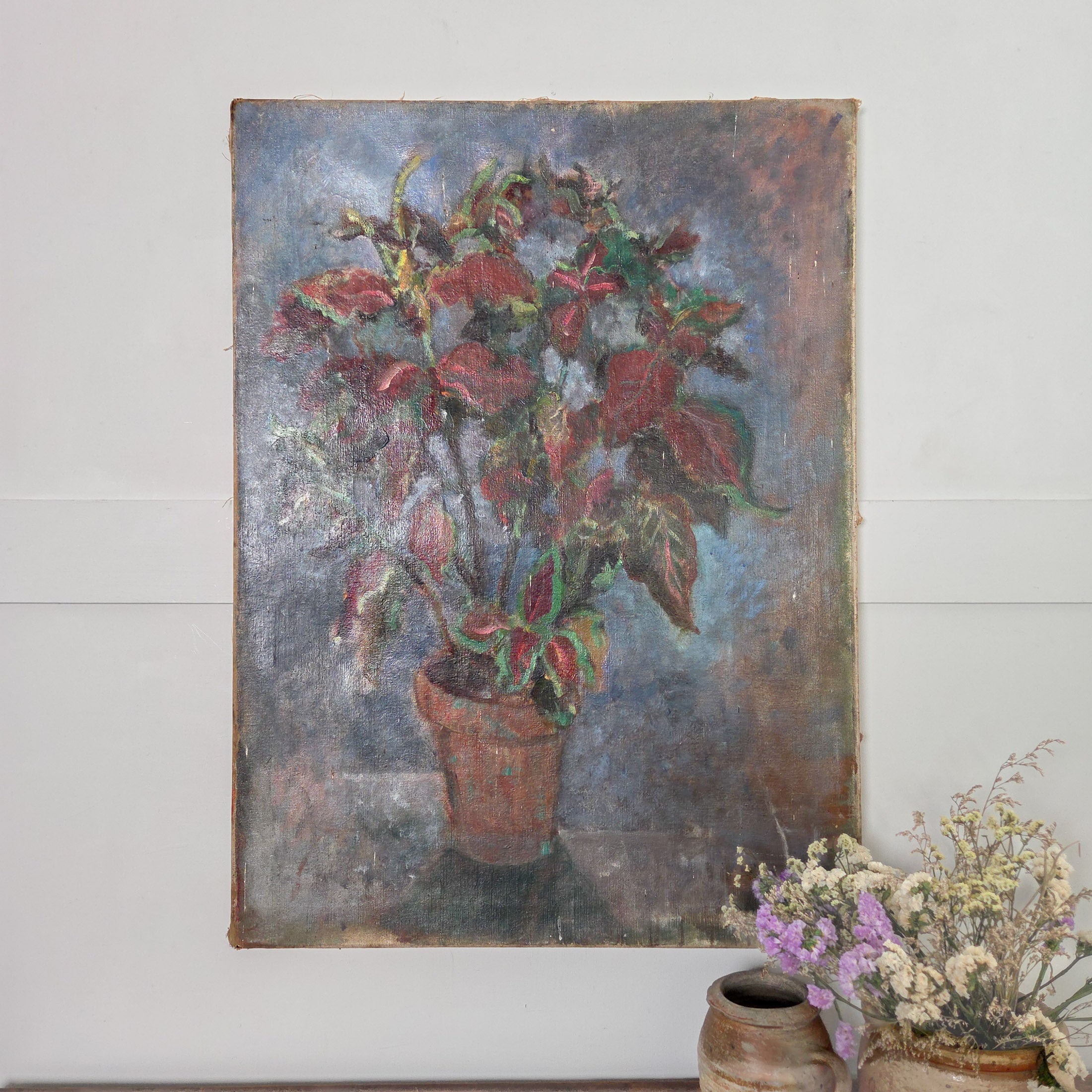 The plant, likely a coleus or similar variety, sits in a simple terracotta pot, positioned slightly off-centre. The expressive brushwork adds texture and movement to the leaves, while the muted yet rich palette balances warm earthy tones against the cooler background.