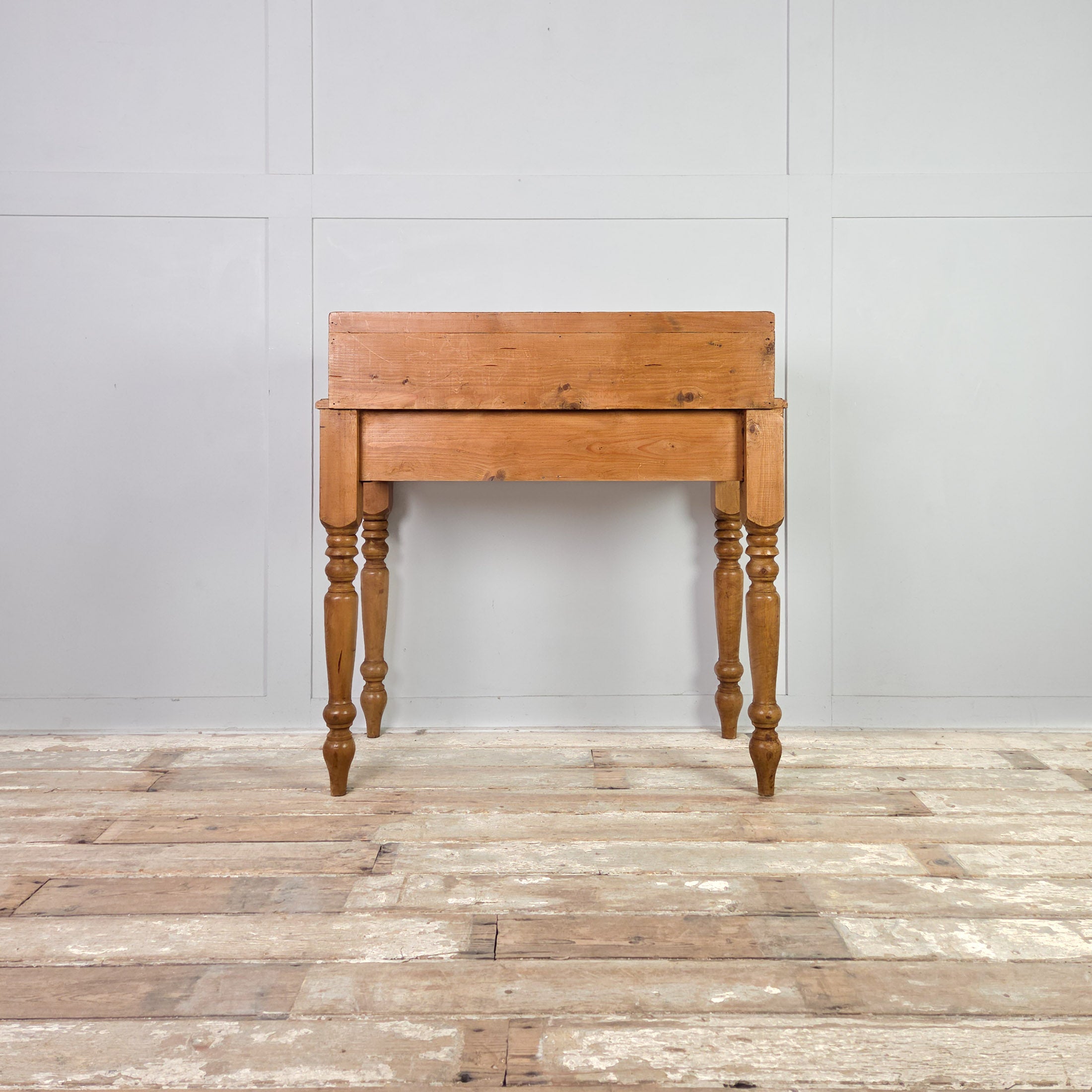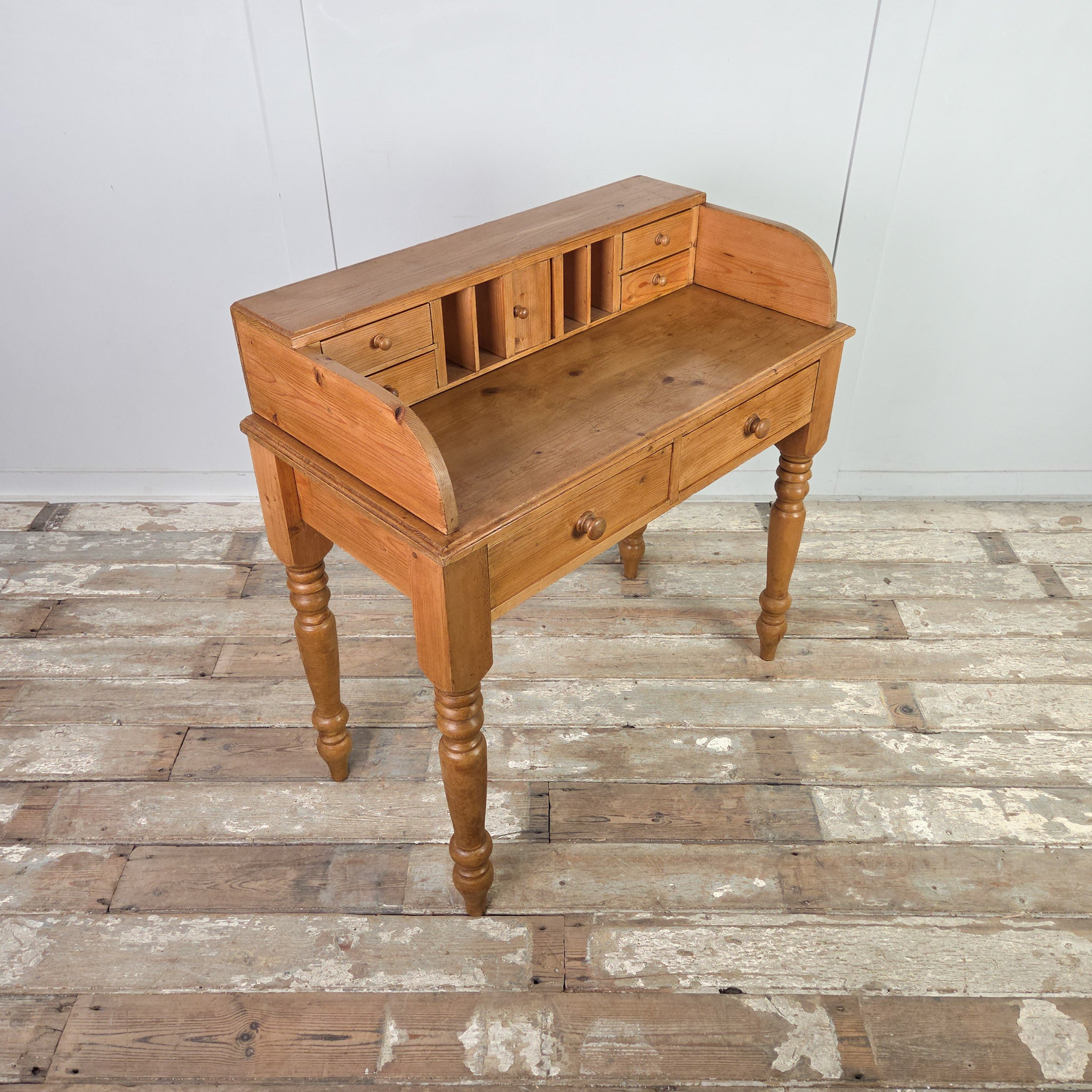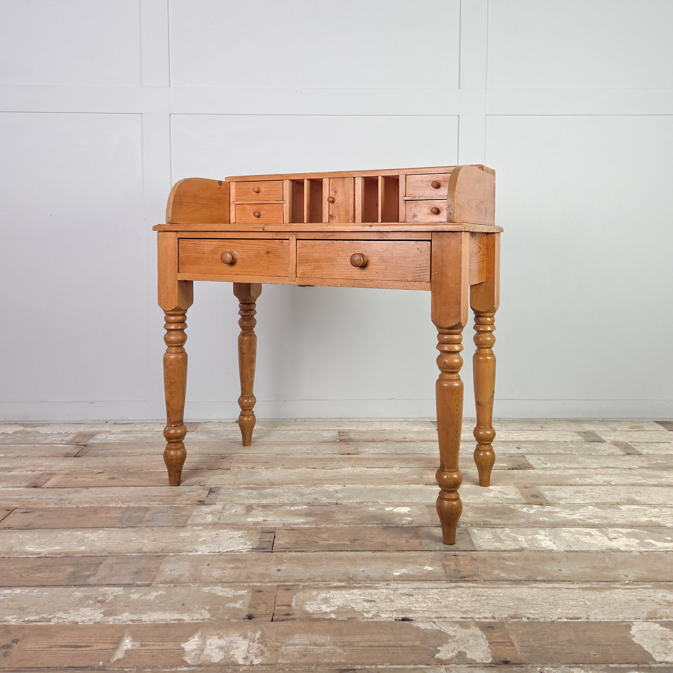 A sweet little vintage pine desk or console table with turned legs and a gallery style top fitted with pigeonholes and drawers.