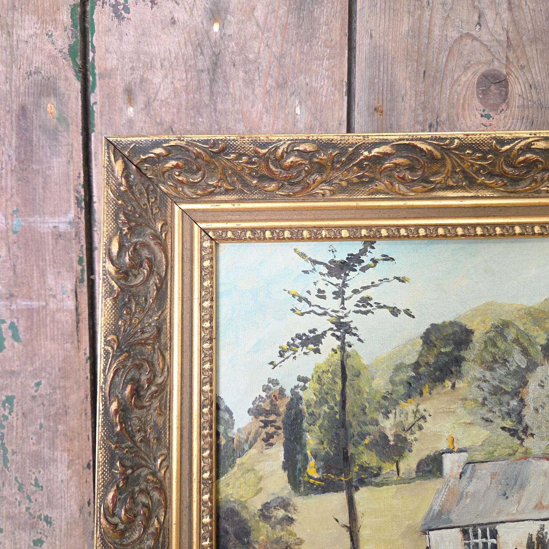 A charming vintage oil on board featuring a rustic countryside view, presented in its gilt frame.