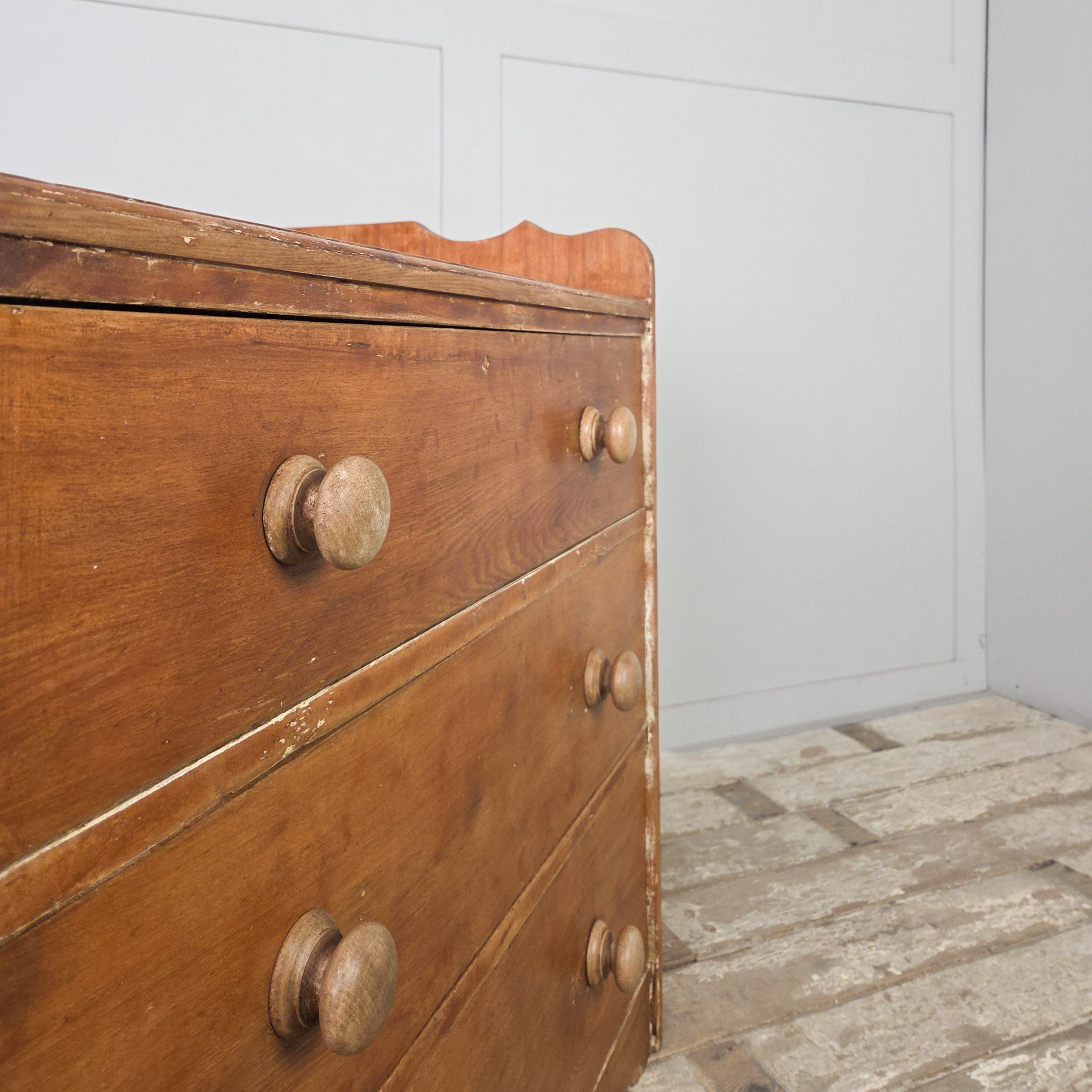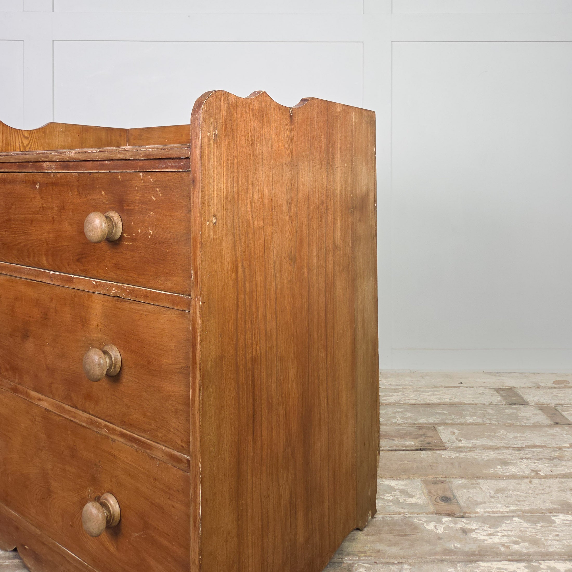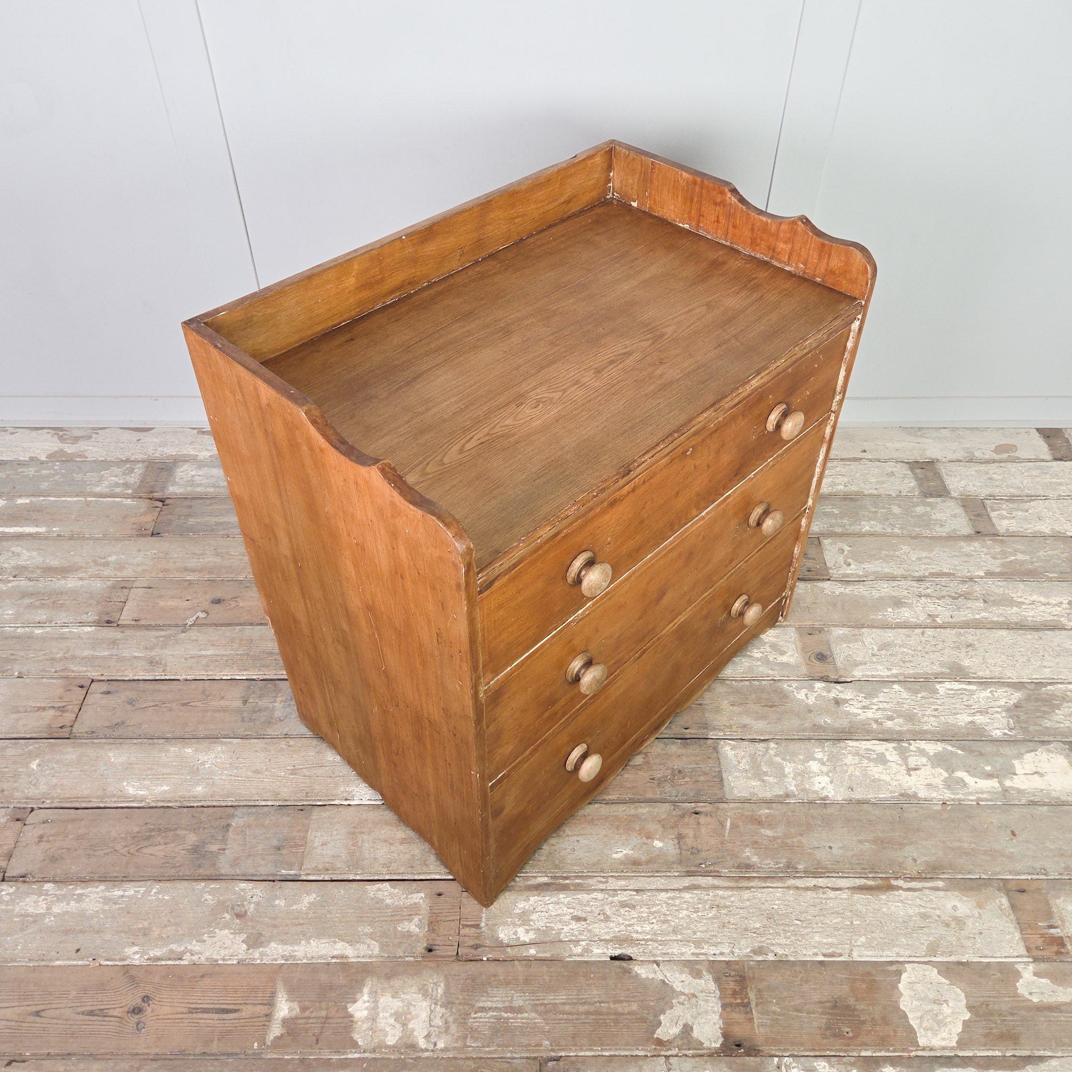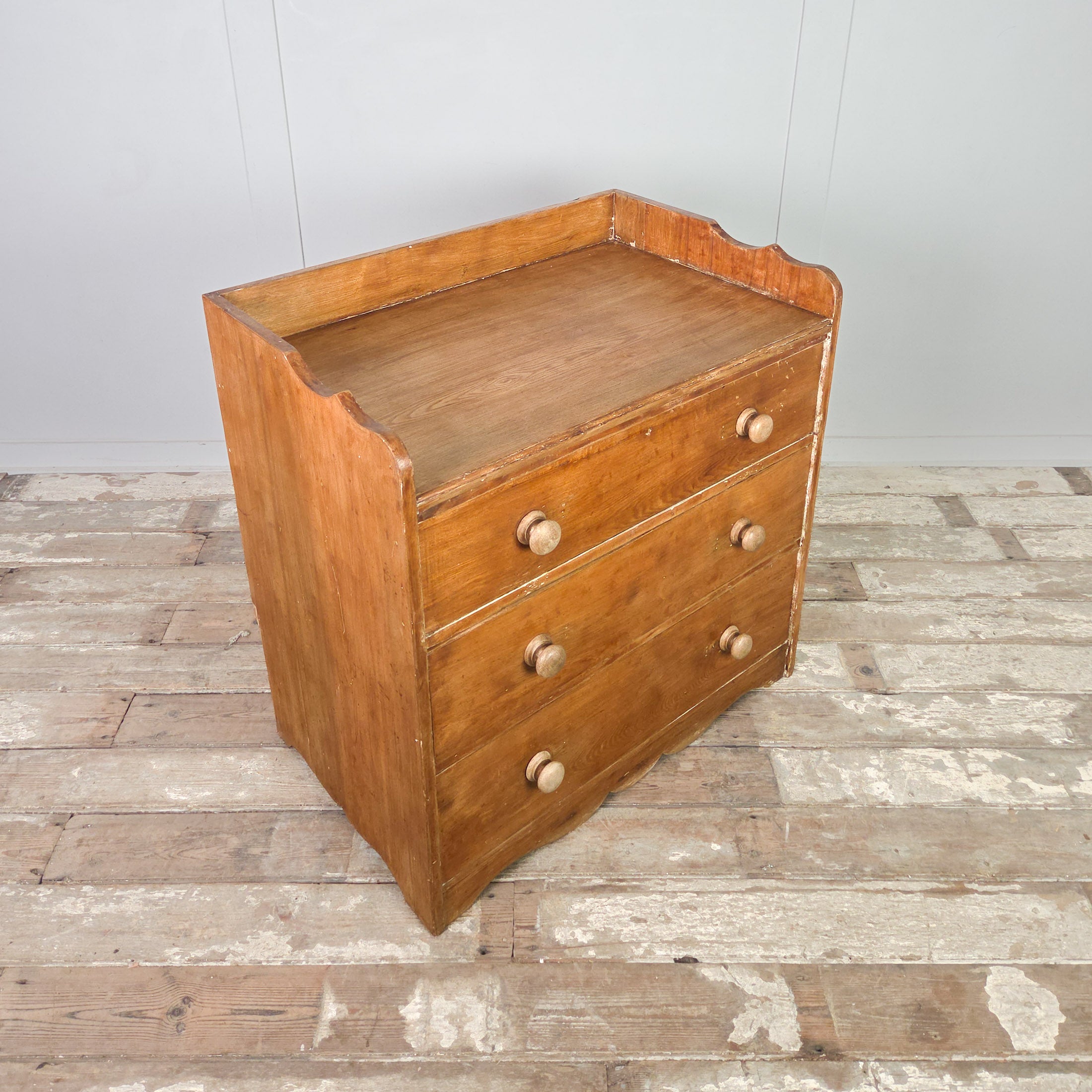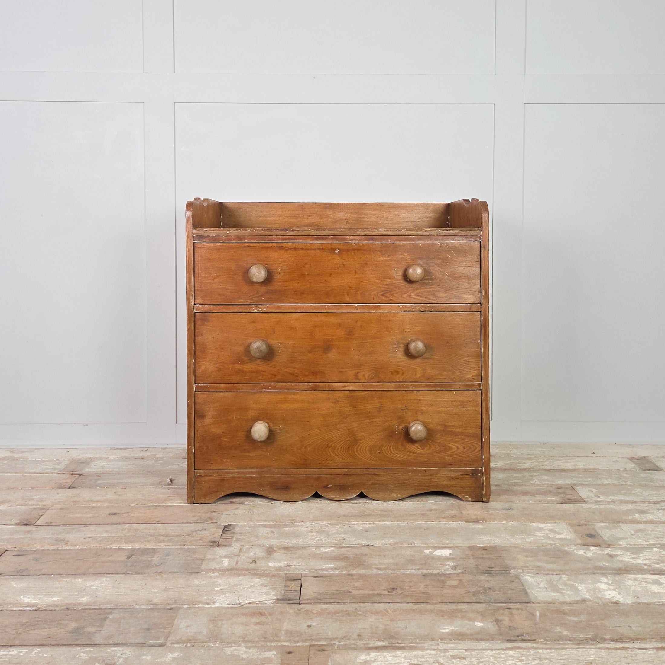 This practical ash chest of drawers dates from the early 20th century. It features three deep, long drawers that graduate in depth, each completed with simple, round wooden knobs. The piece is characterised by a gallery back and a shaped plinth base.
