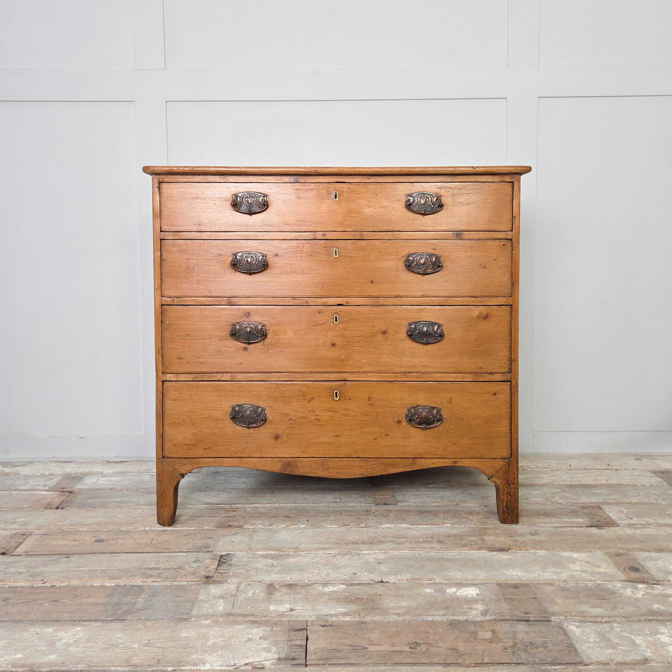 This beautiful Georgian pine chest of drawers has a straightforward, well-proportioned layout, with four drawers that graduate in depth and are fitted with decorative brass plate drop handles. The piece features a shaped lower apron and is raised on ogee-style feet. It has been sealed with a rustic pine wax to protect and enhance the existing patina.