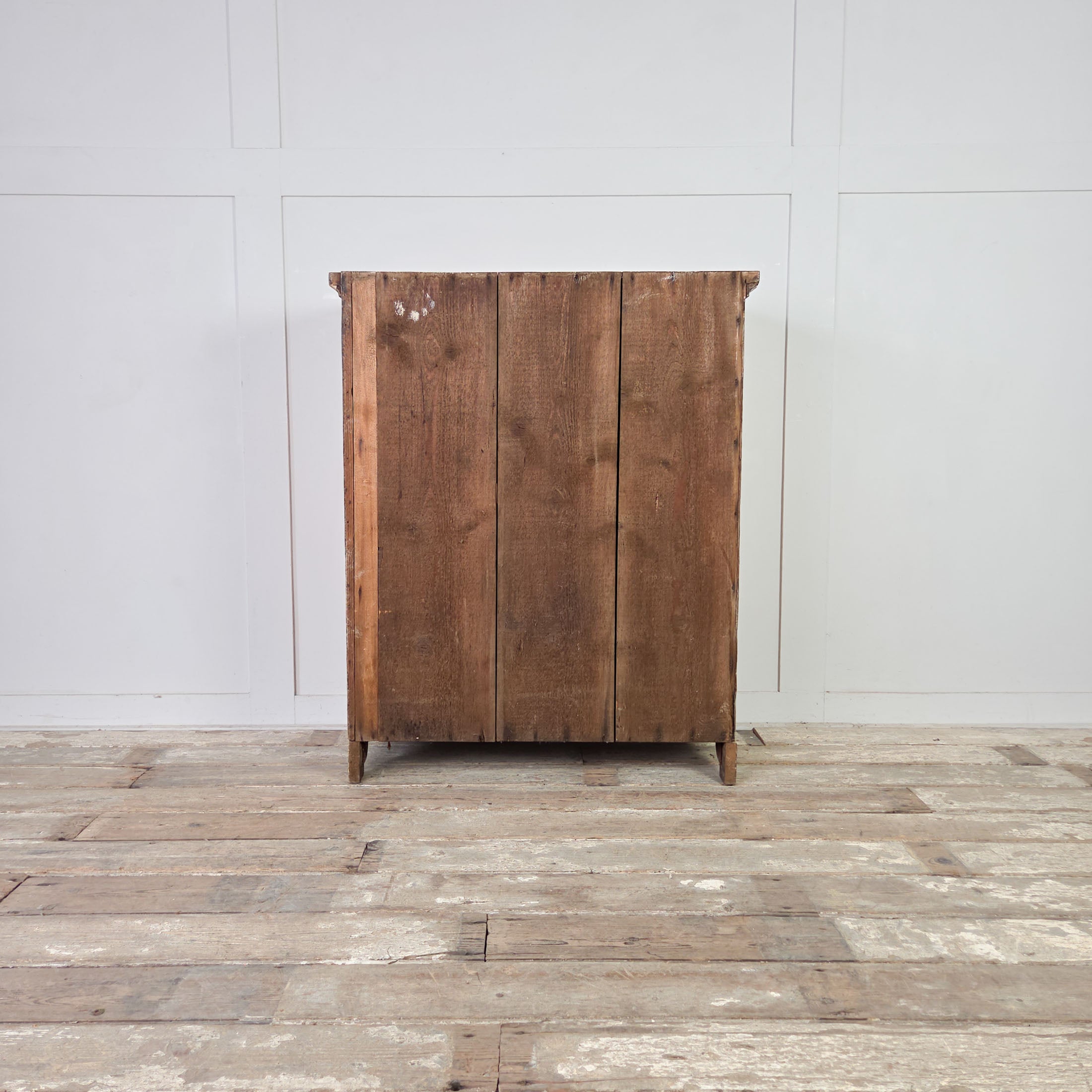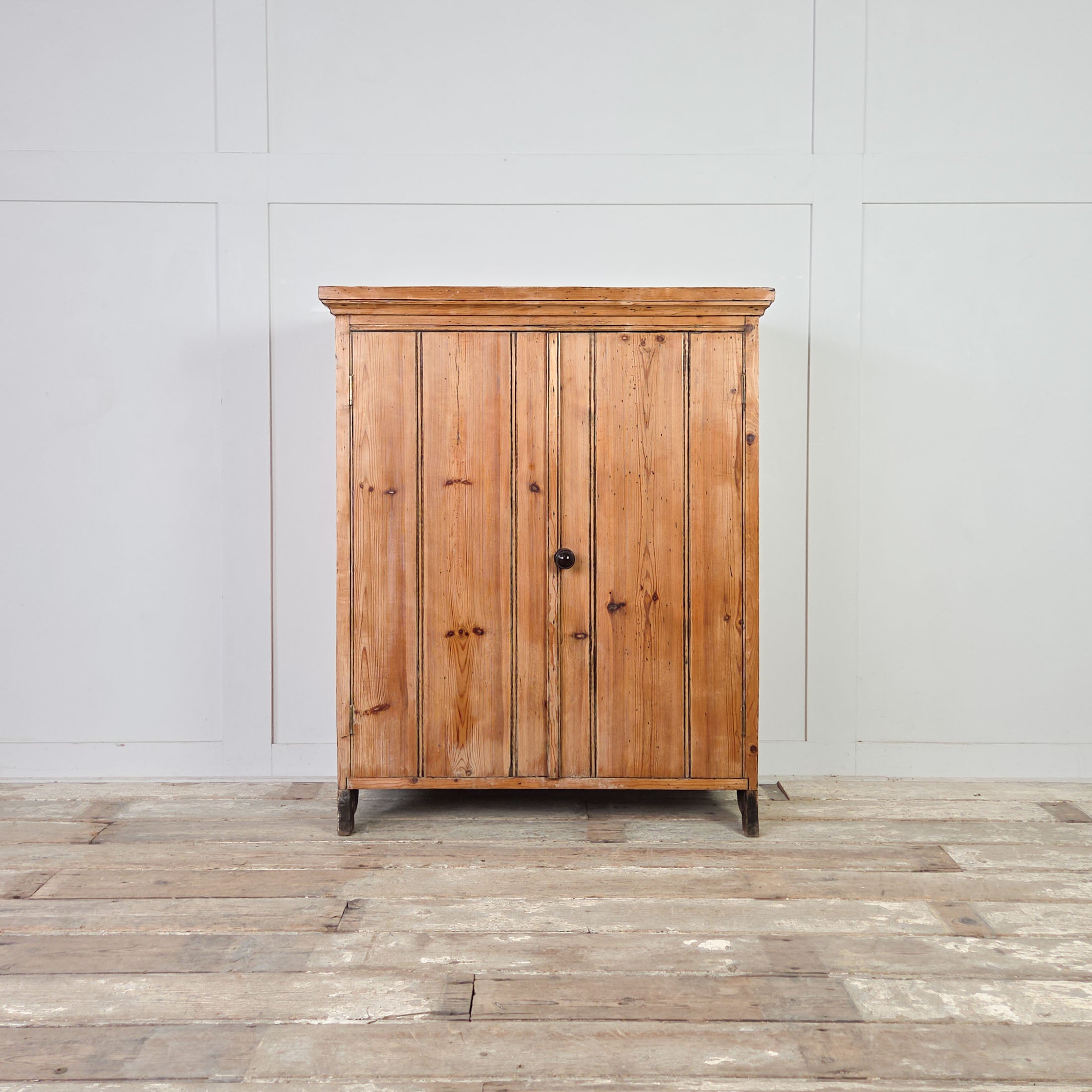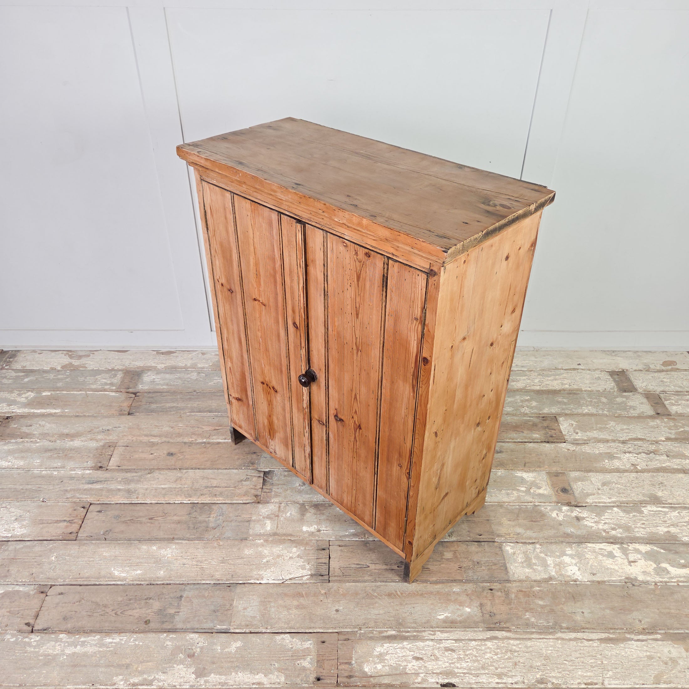 The front is defined by two full-length doors made from vertical planking, which are centered by a single, dark Bakelite knob that provides a nice contrast to the honey-toned pine. Inside there is a series of internal shelves that offer storage across the full width of the cabinet. An overhanging cornice defines the top edge, while bracket style feet support the base.