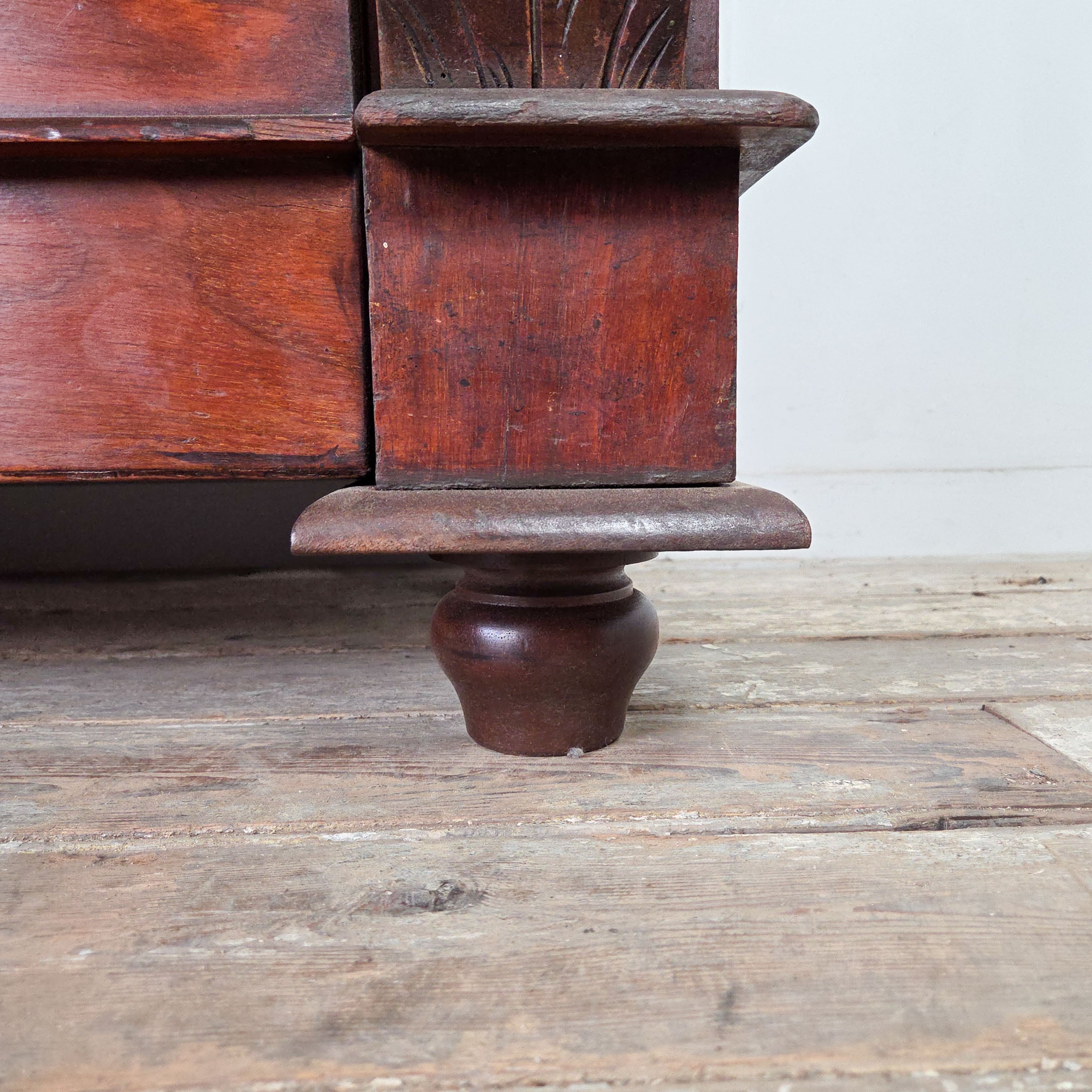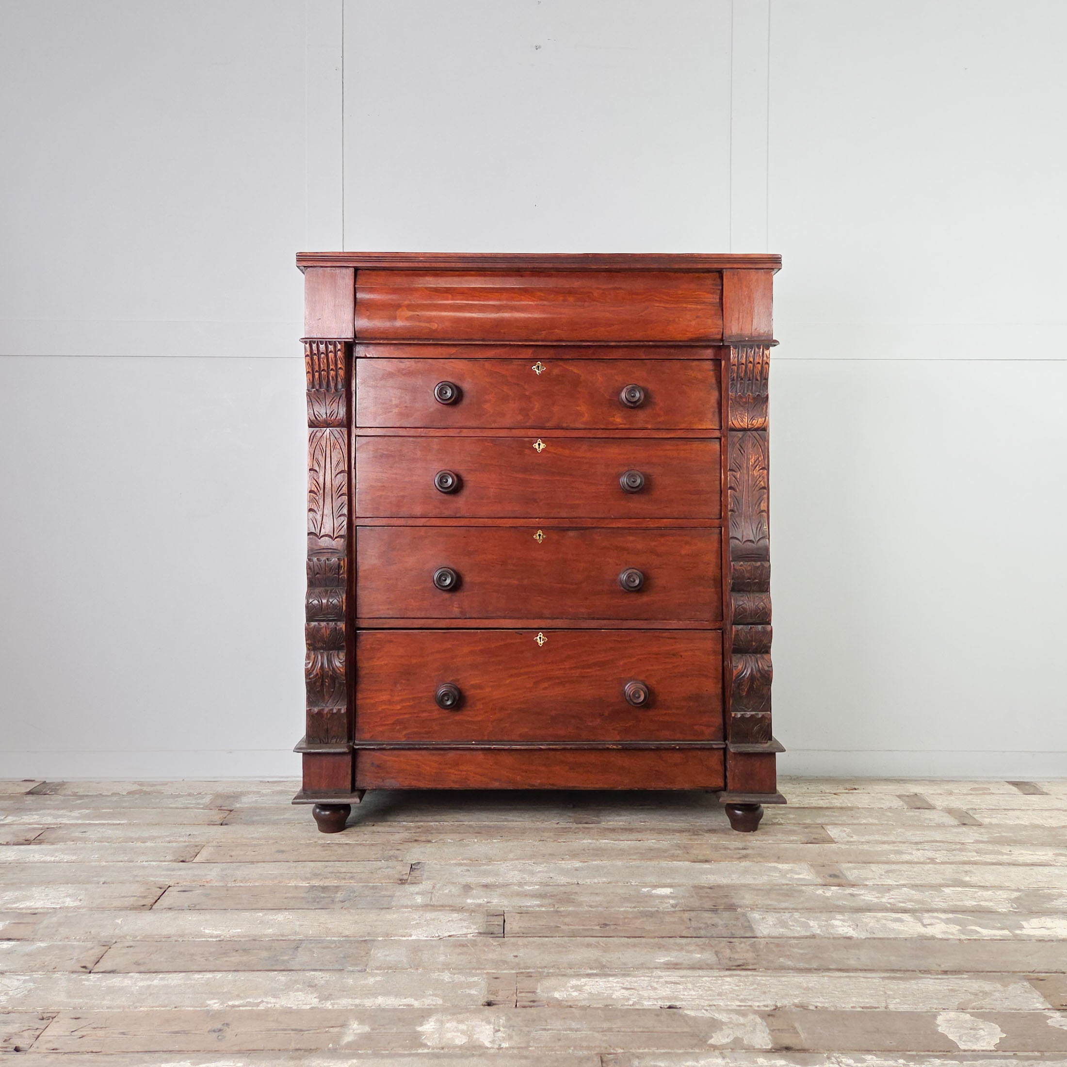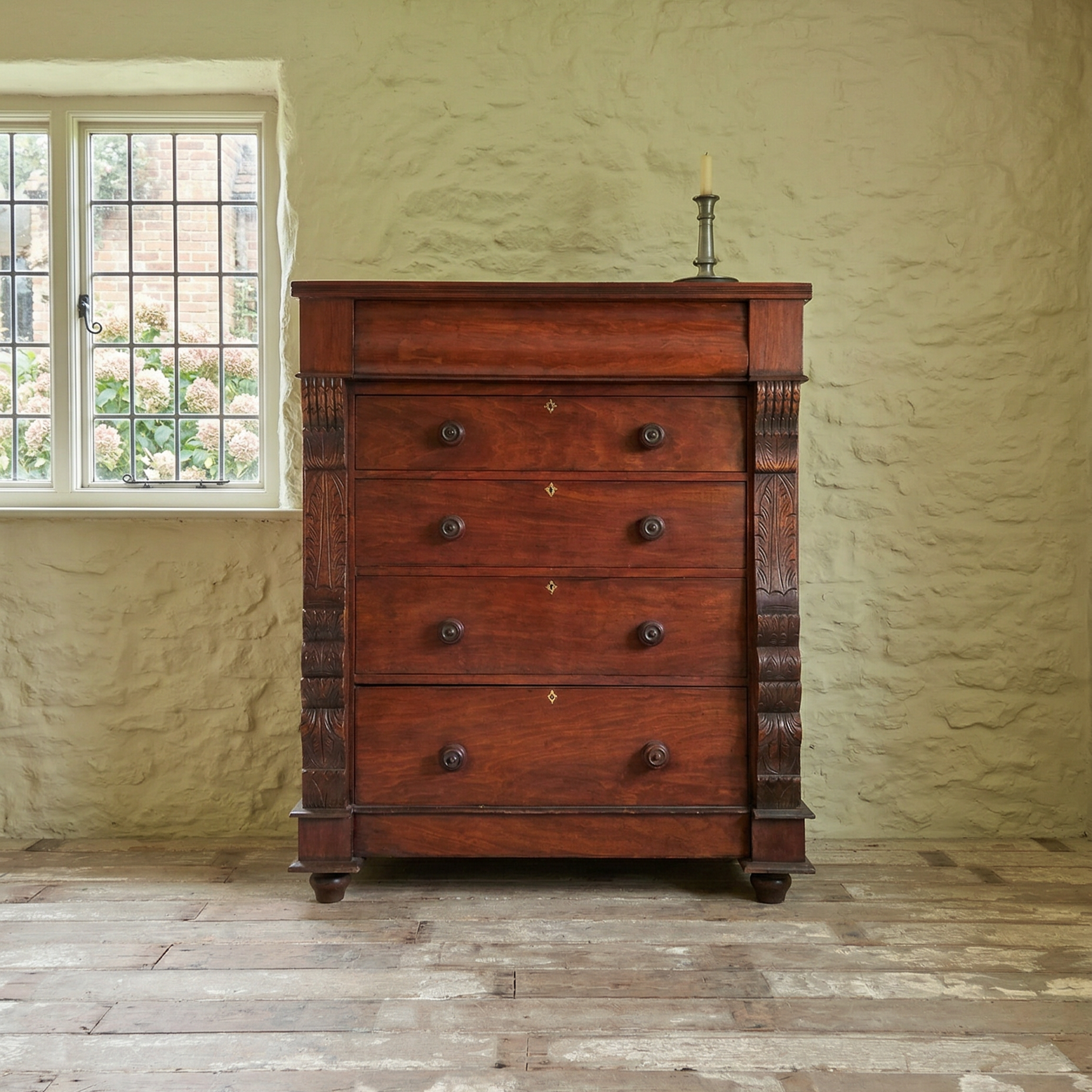 The design offers significant storage with four deep, graduating drawers and a hidden top drawer built into the upper moulding. It is finished with hand-carved leaf details on the side pillars and stands on its original, sturdy bun feet.