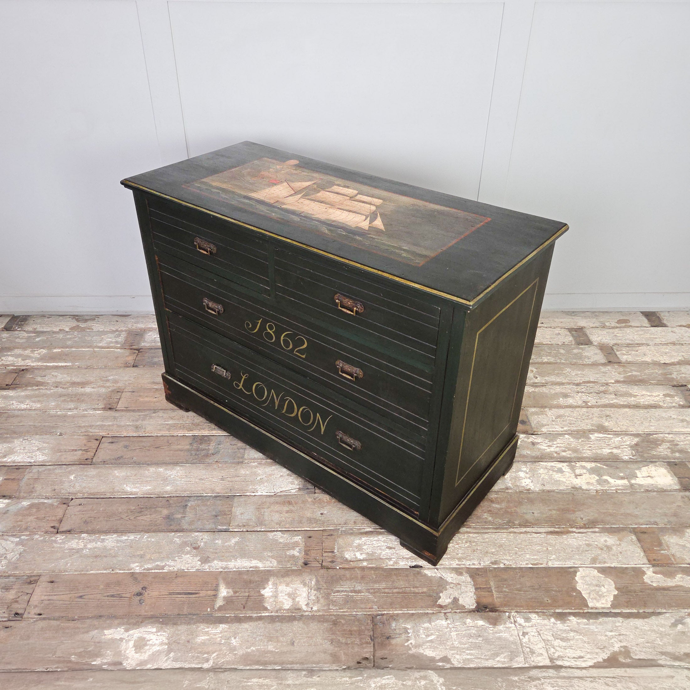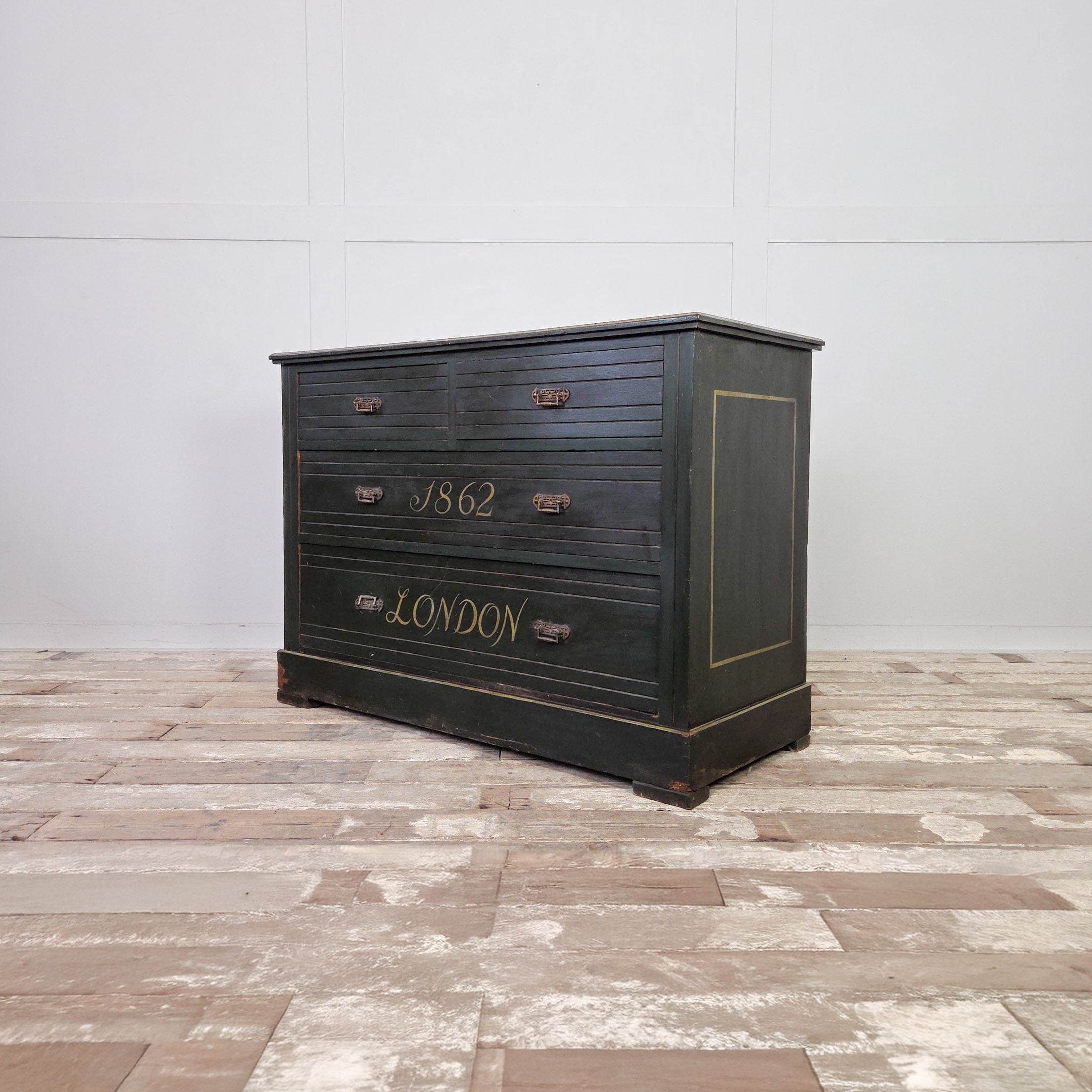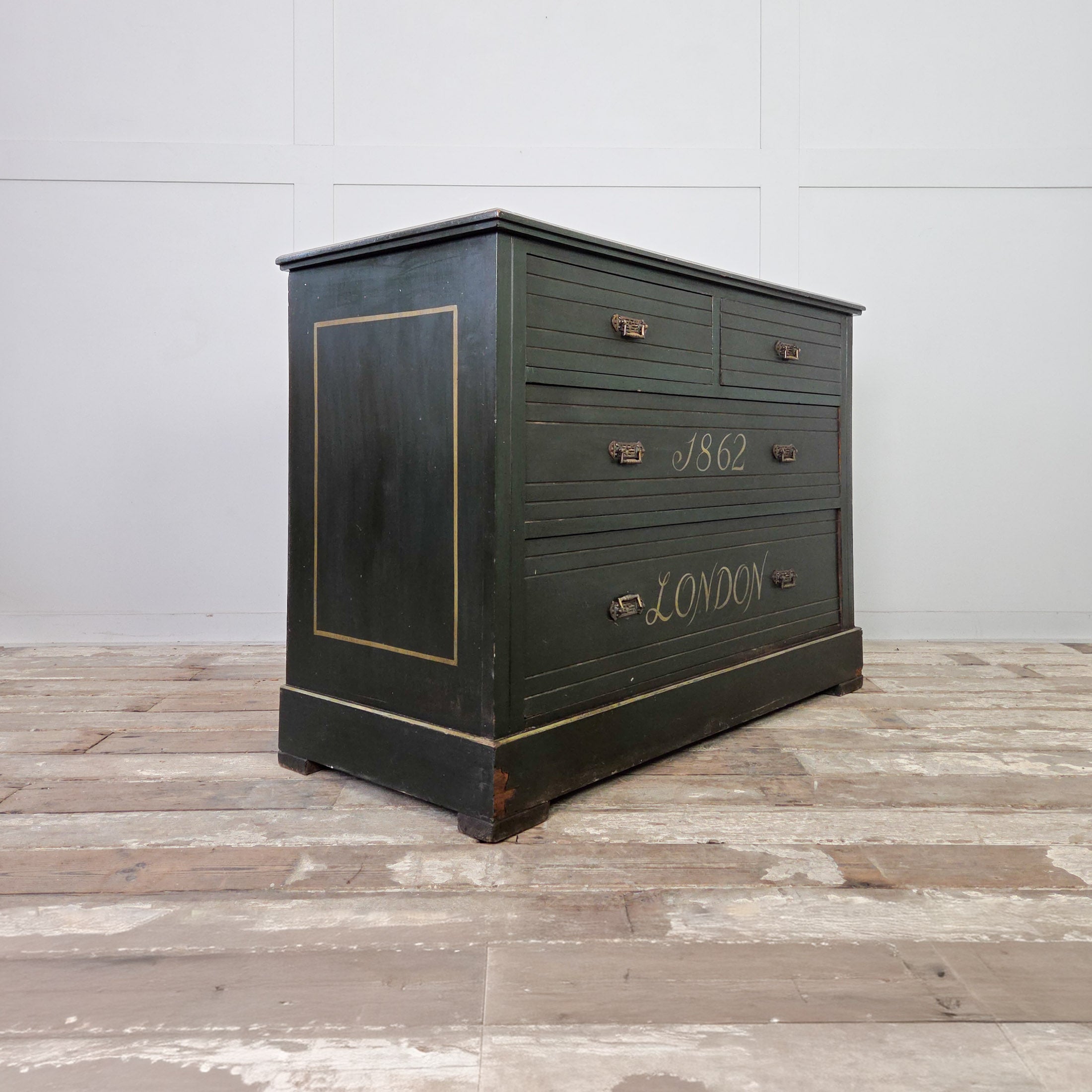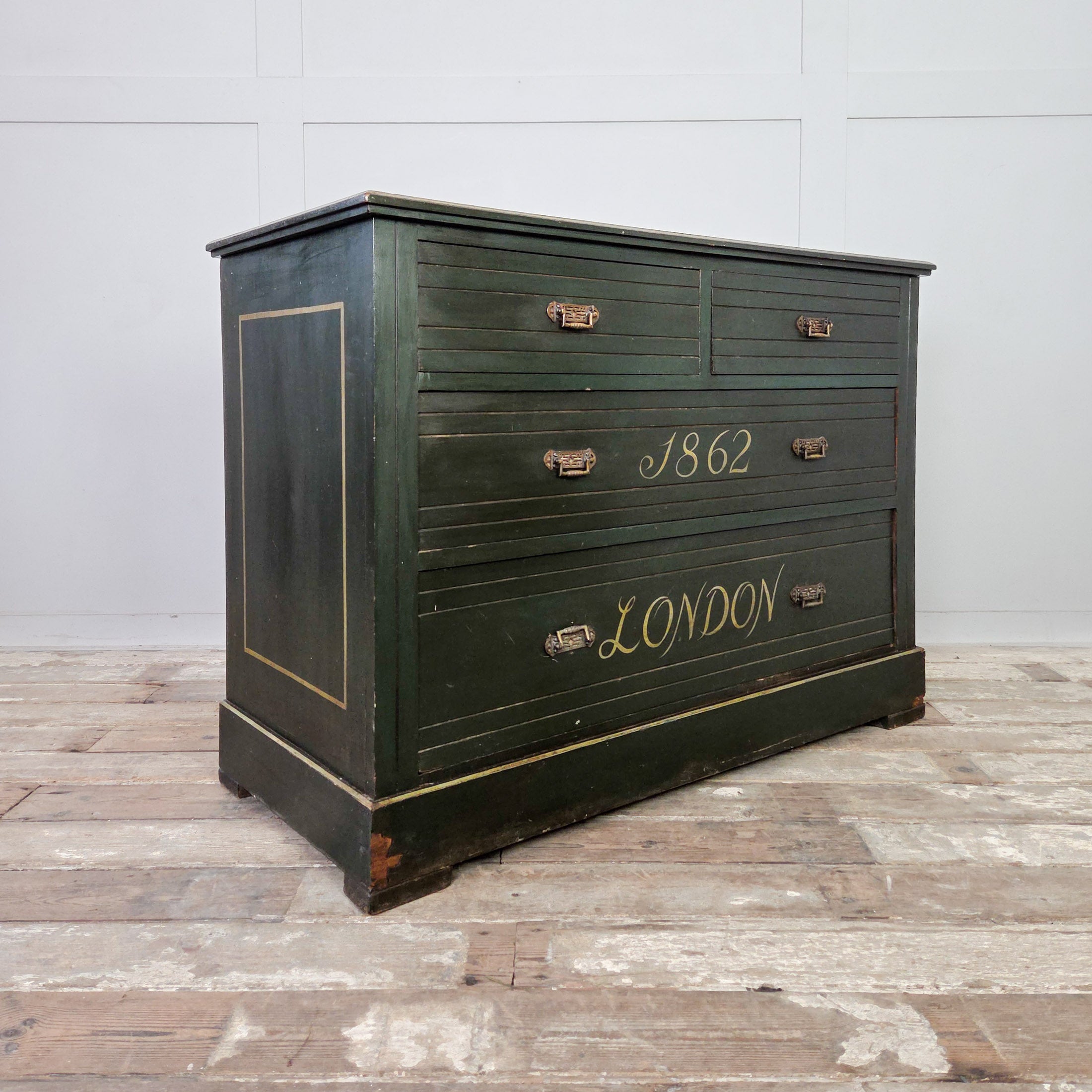 The chest is features a rich deep green painted finish, with contrasting running throughout piece with hand-painted lettering across the fronts of the drawers. Each drawer is fitted with decorative brass handles.