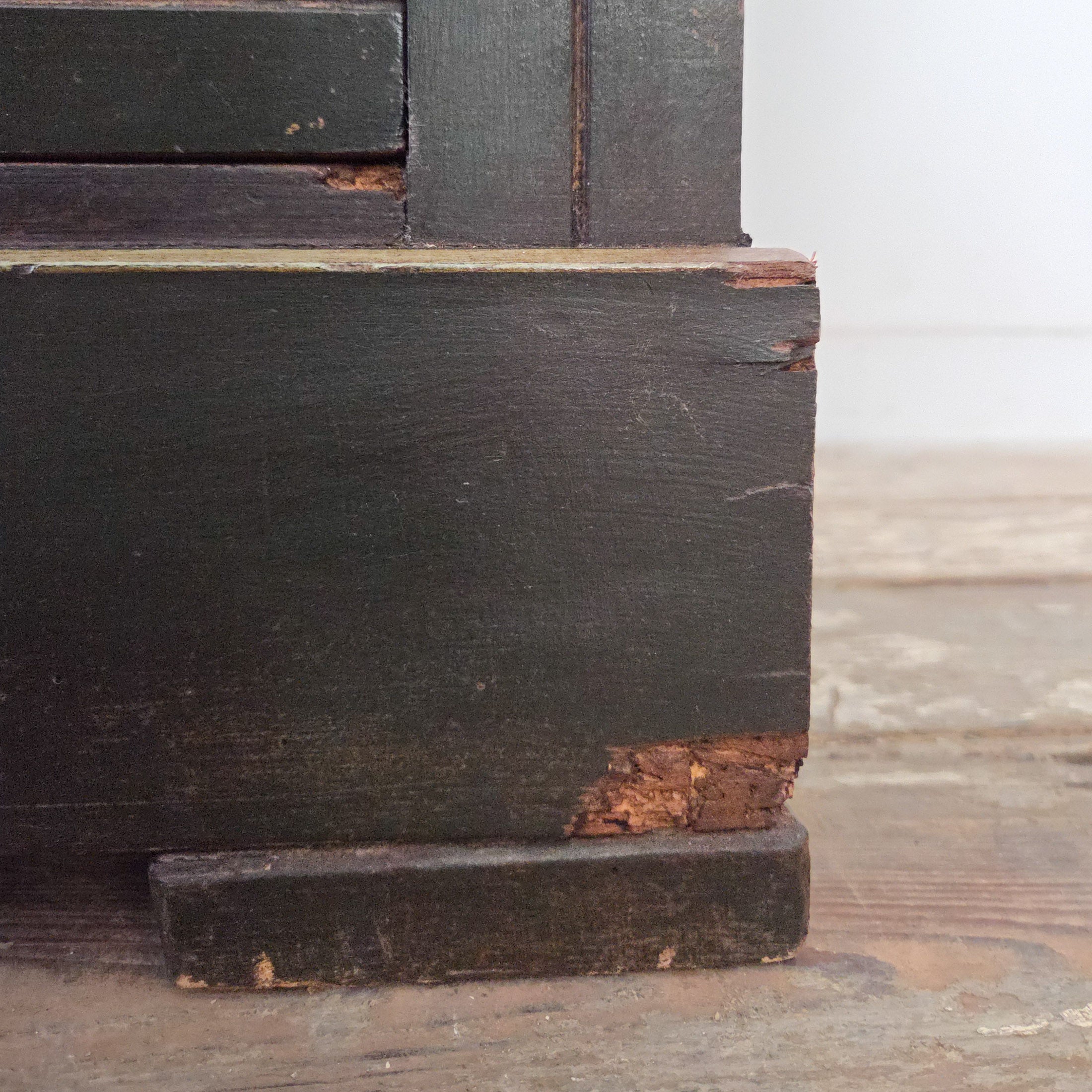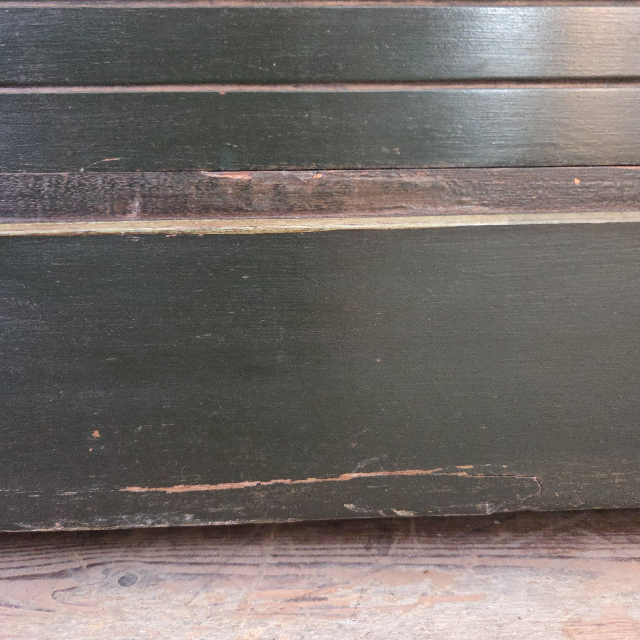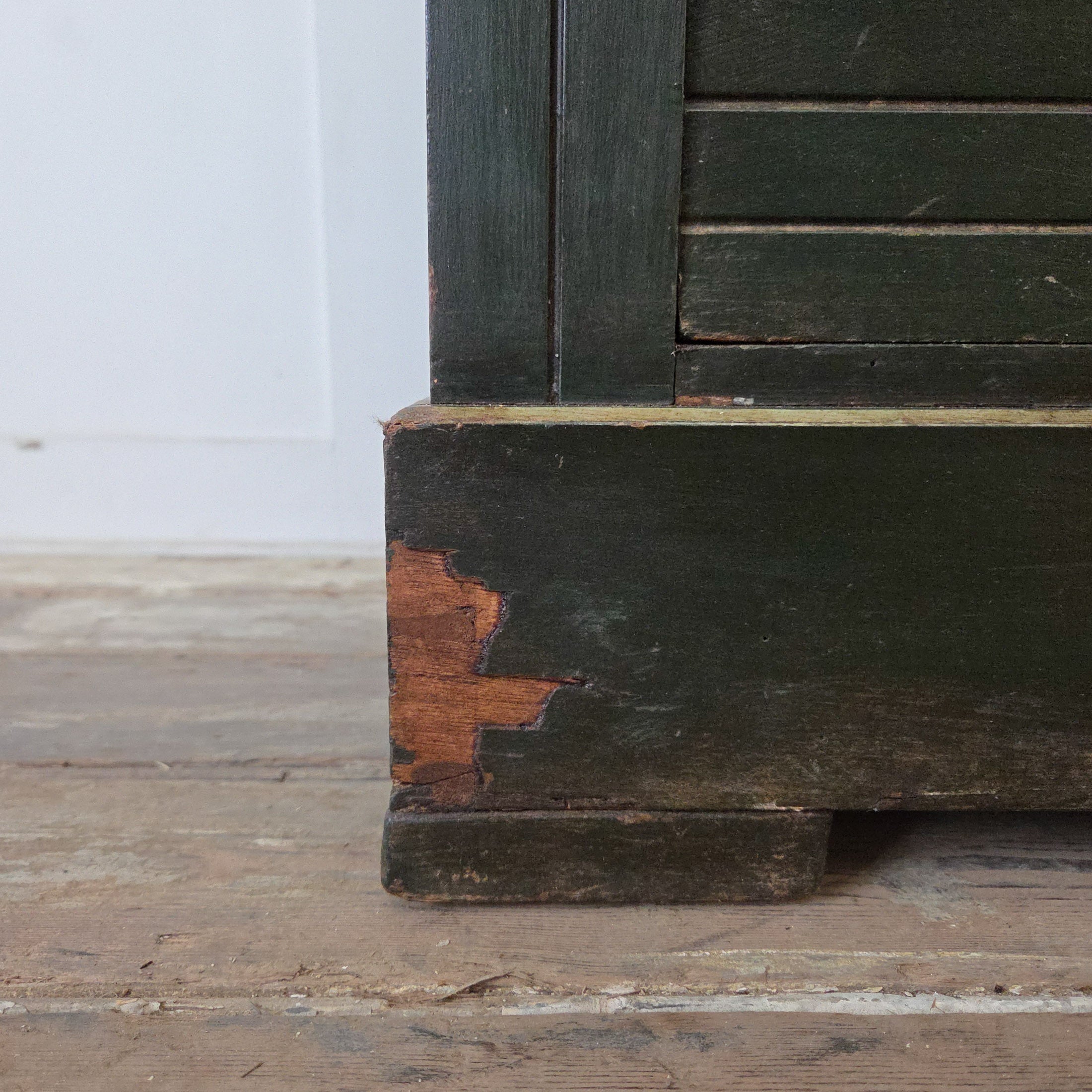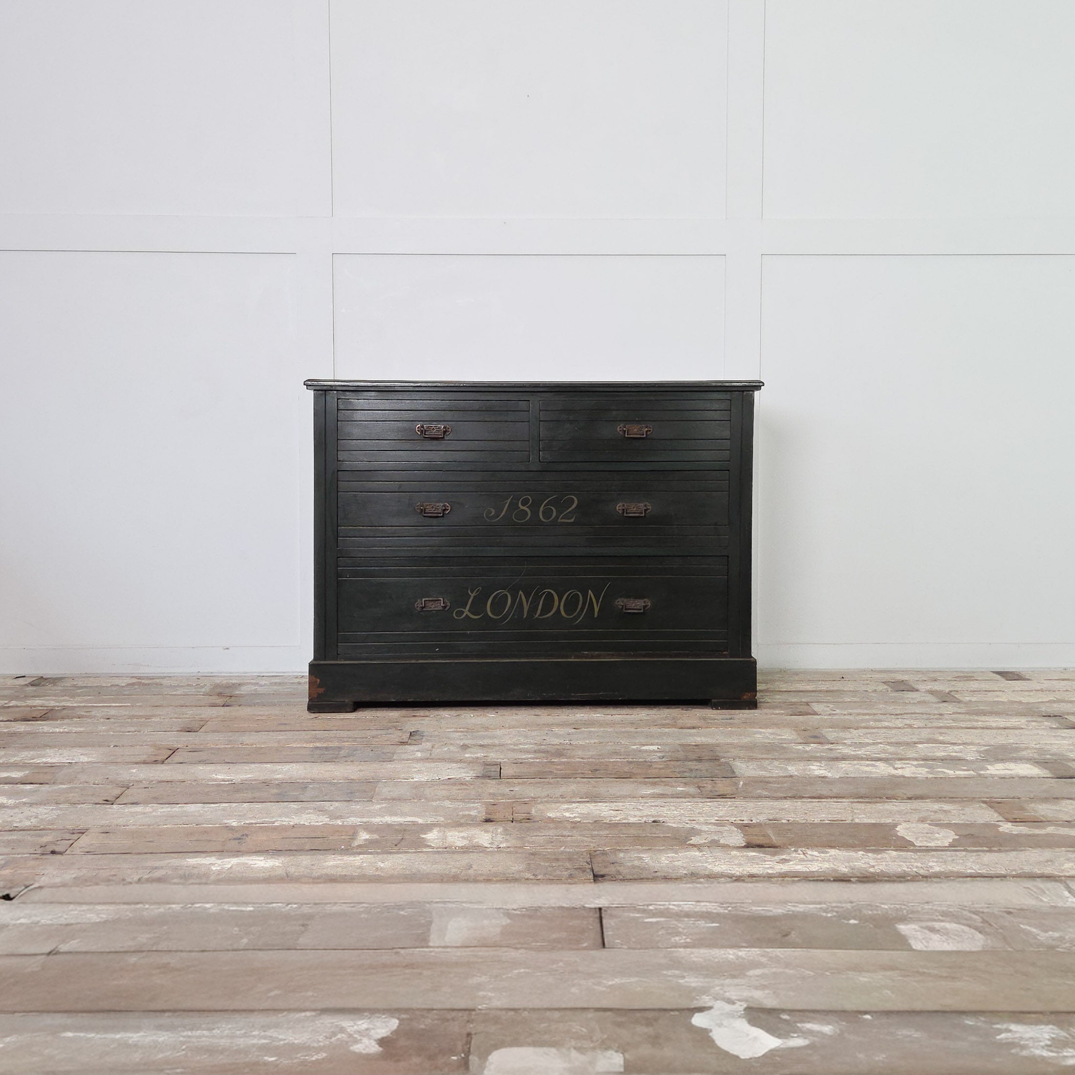 The chest is features a rich deep green painted finish, with contrasting running throughout piece with hand-painted lettering across the fronts of the drawers. Each drawer is fitted with decorative brass handles.