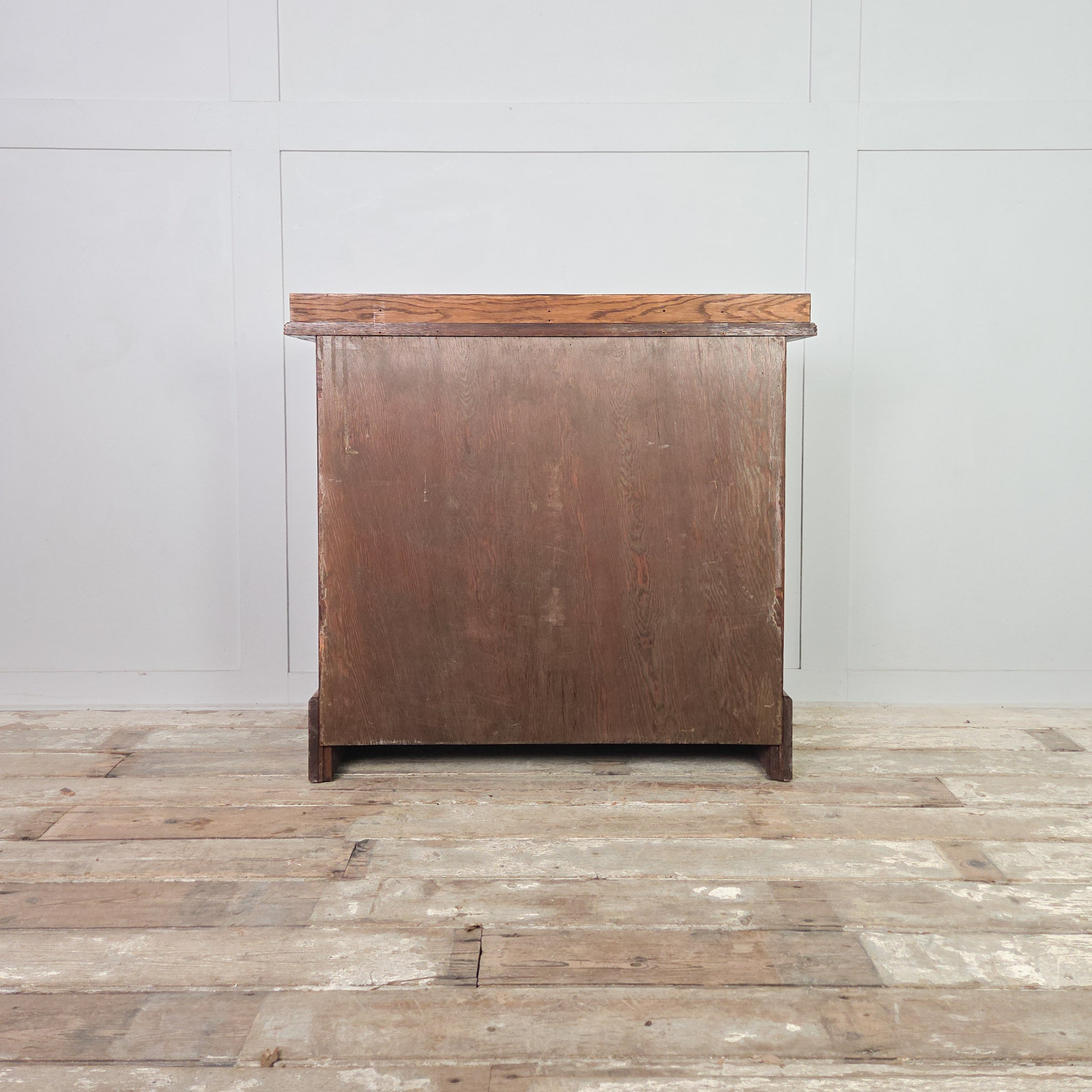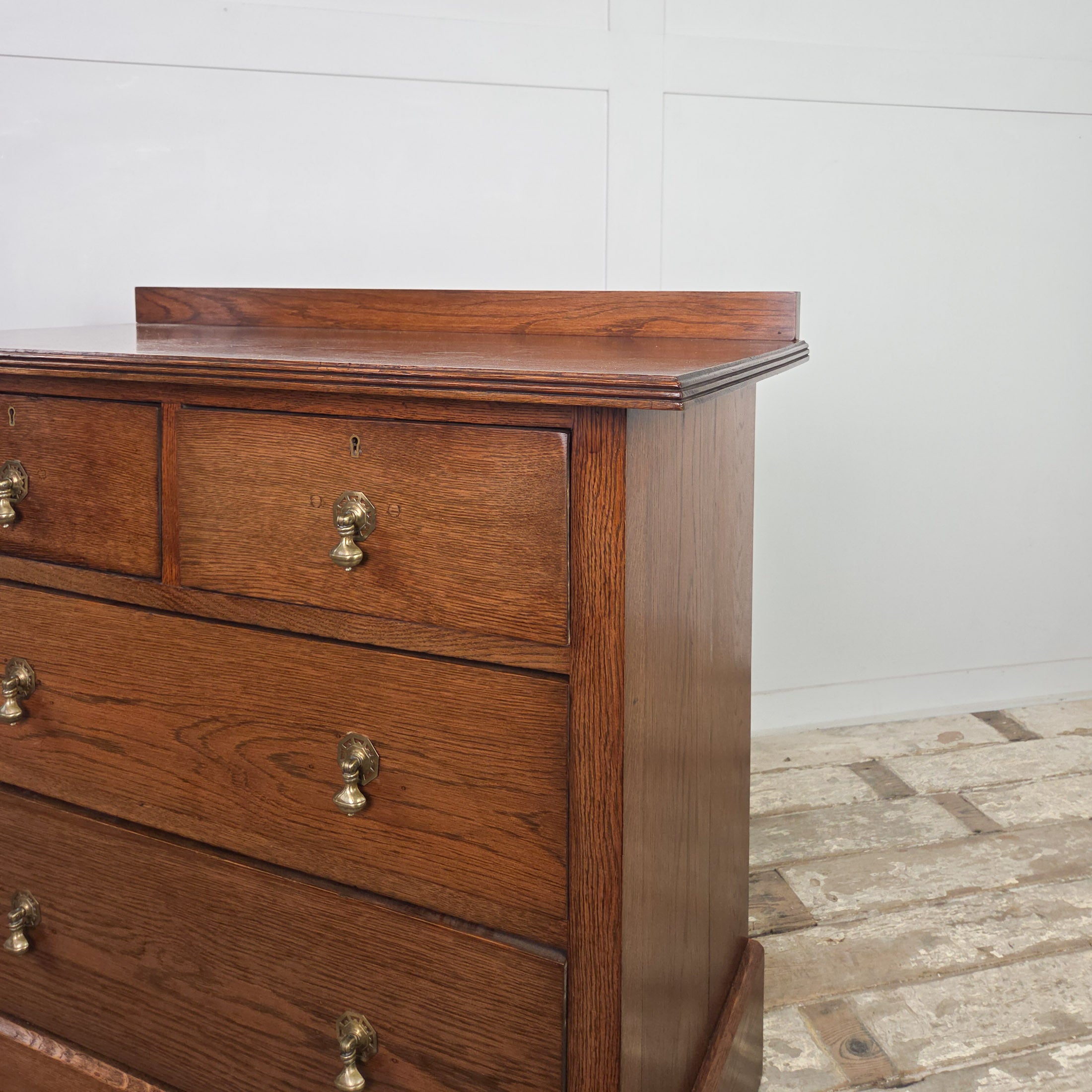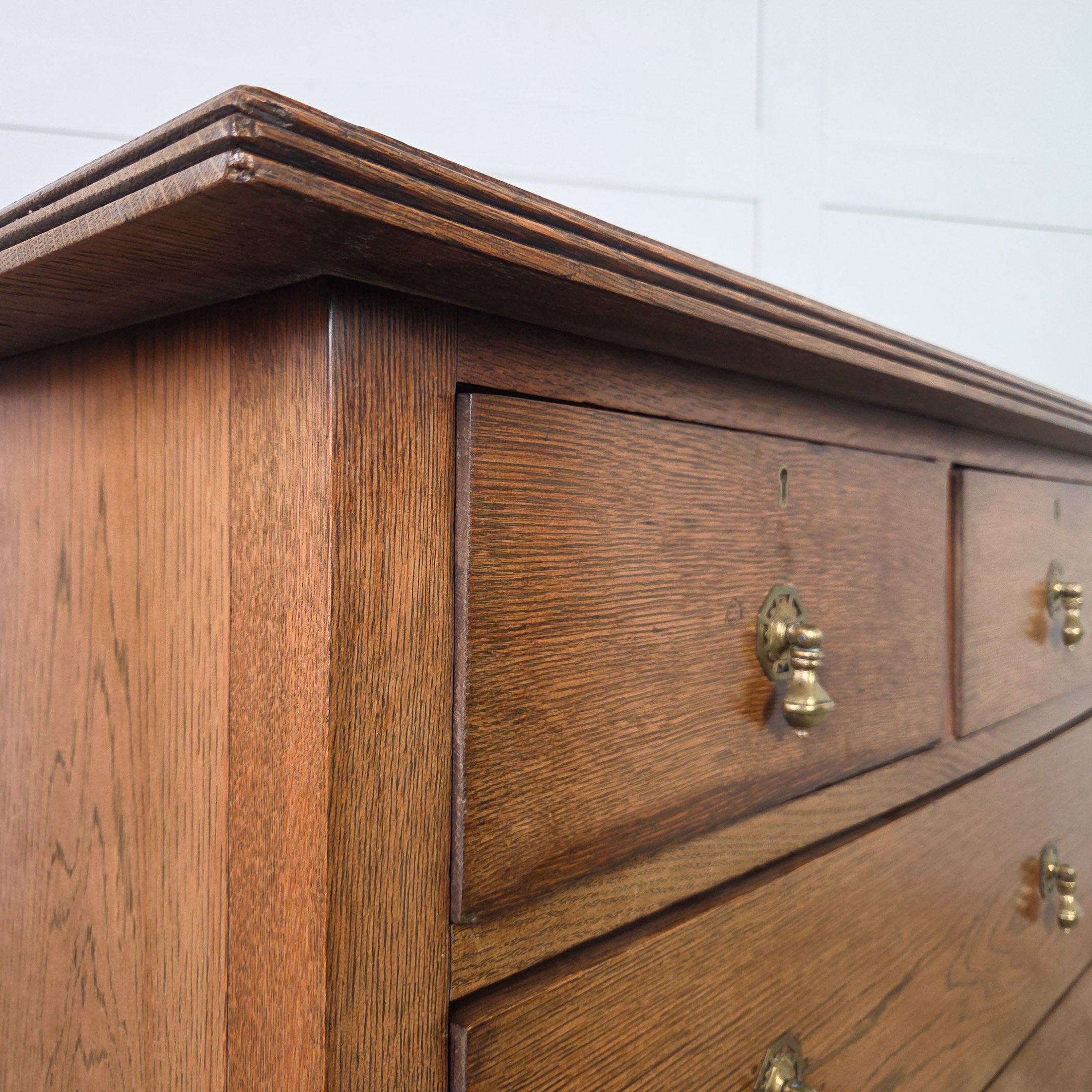 A classic oak chest featuring a versatile four-drawer layout that provides ample storage. The top is finished with moulded edging and includes a small raised upstand at the back. It is fitted with decorative brass drop handles throughout and is supported by a sturdy shaped plinth base.