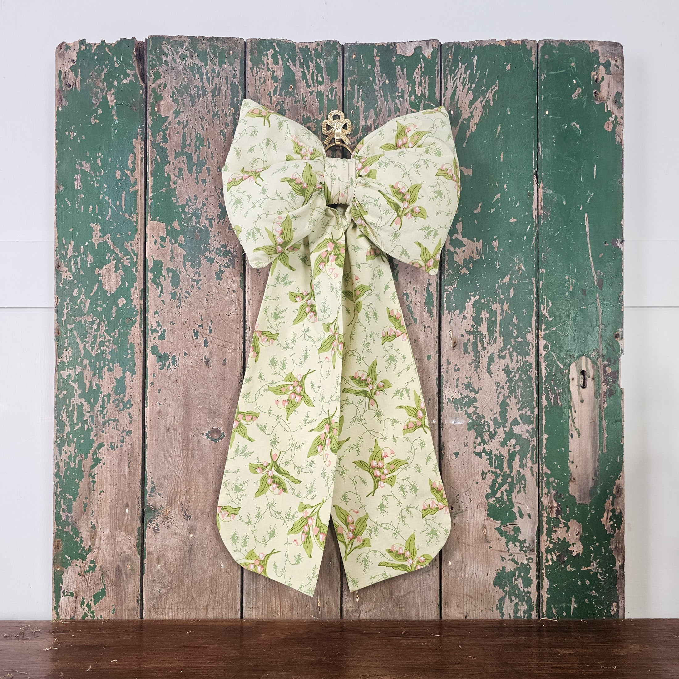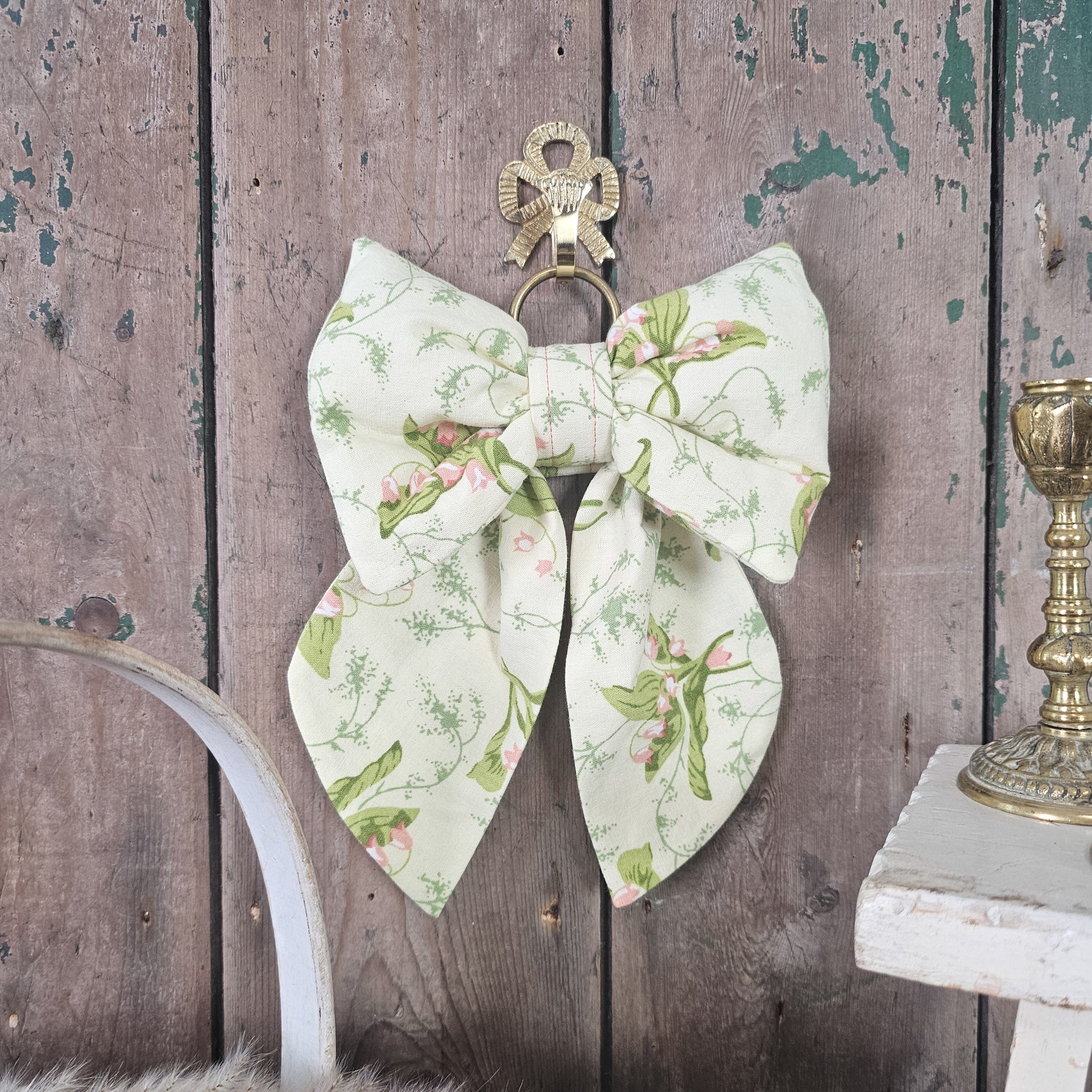 Each bow is padded for a full, structured shape with gently tapering tails. Finished with a removable antiqued brass ring, it can be easily hung anywhere—whether you’re dressing a door, styling a shelf, or decorating a special space.