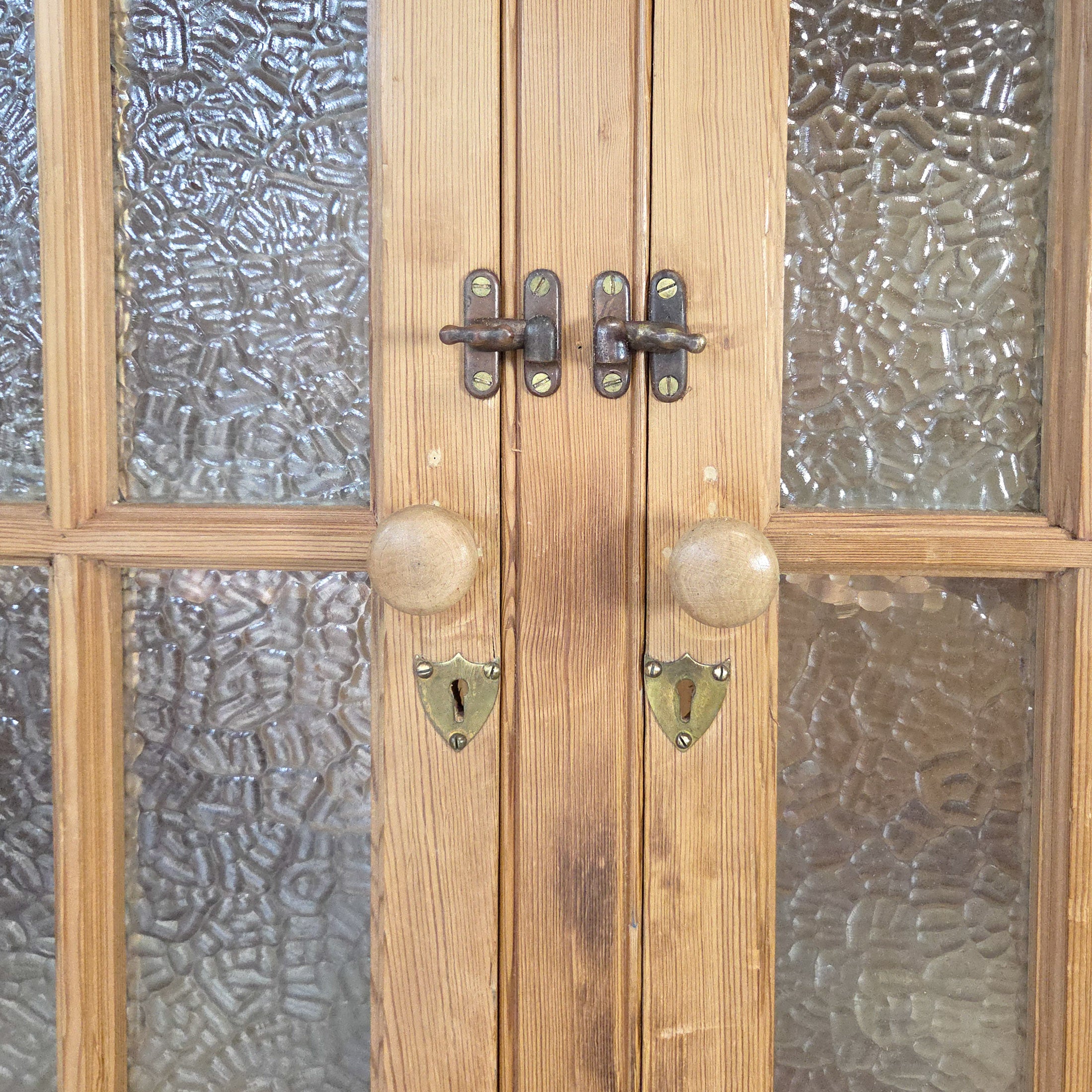 A large antique pine glazed cupboard with double doors and a waxed finish. Made from solid pine, it offers generous internal storage behind two full-length glazed doors fitted with frosted glass panels.