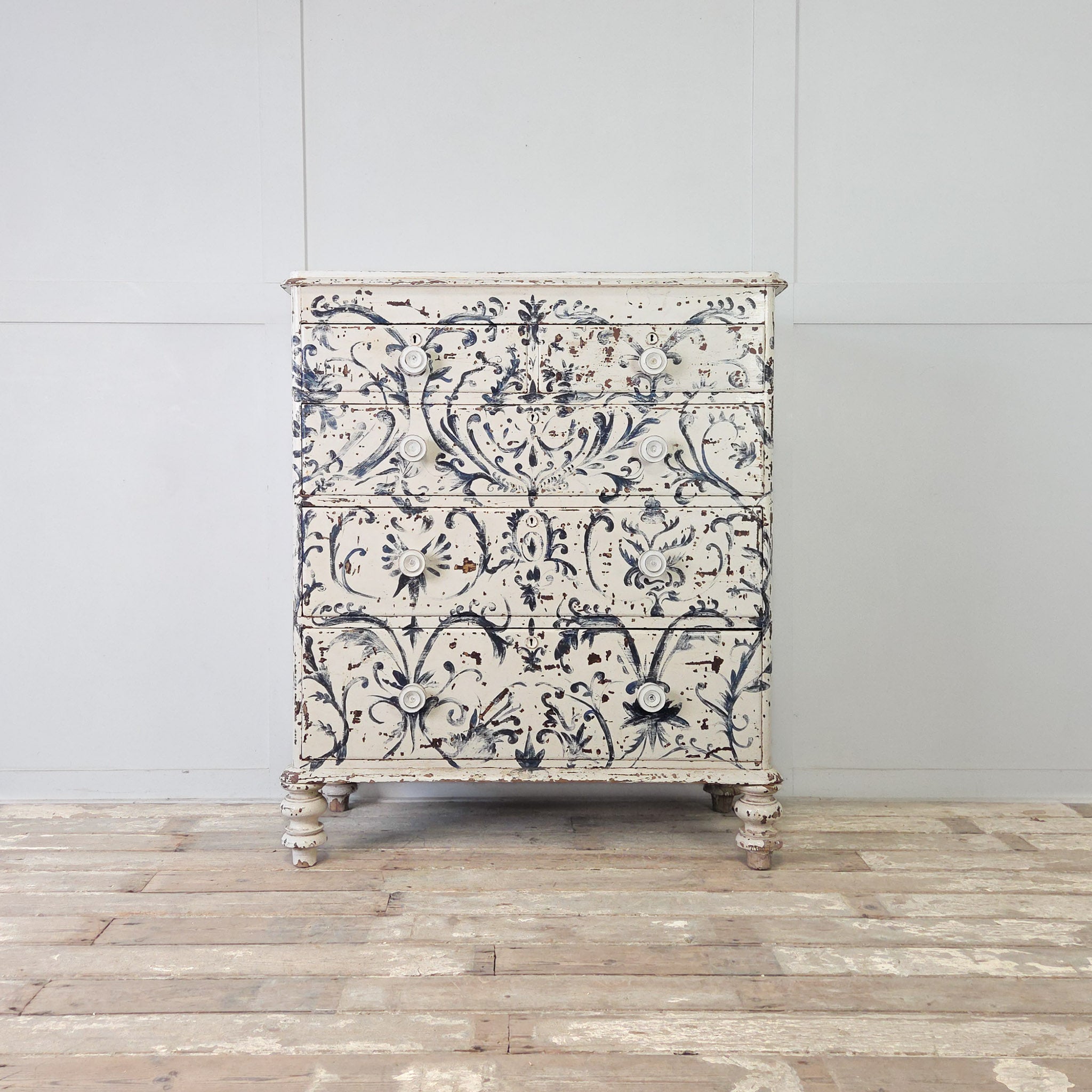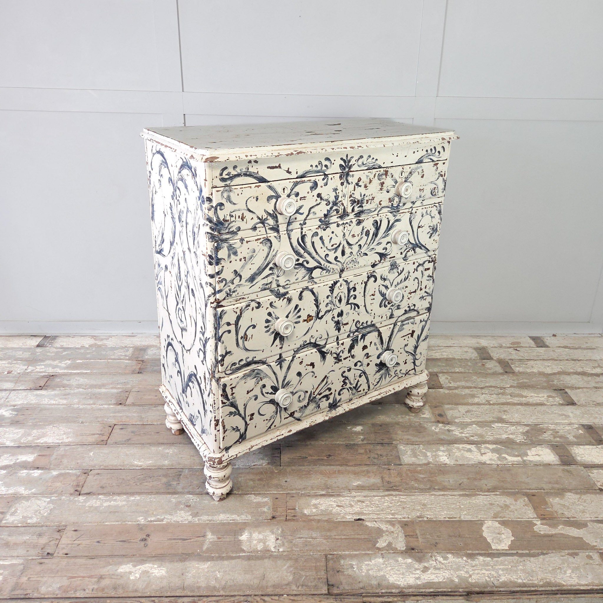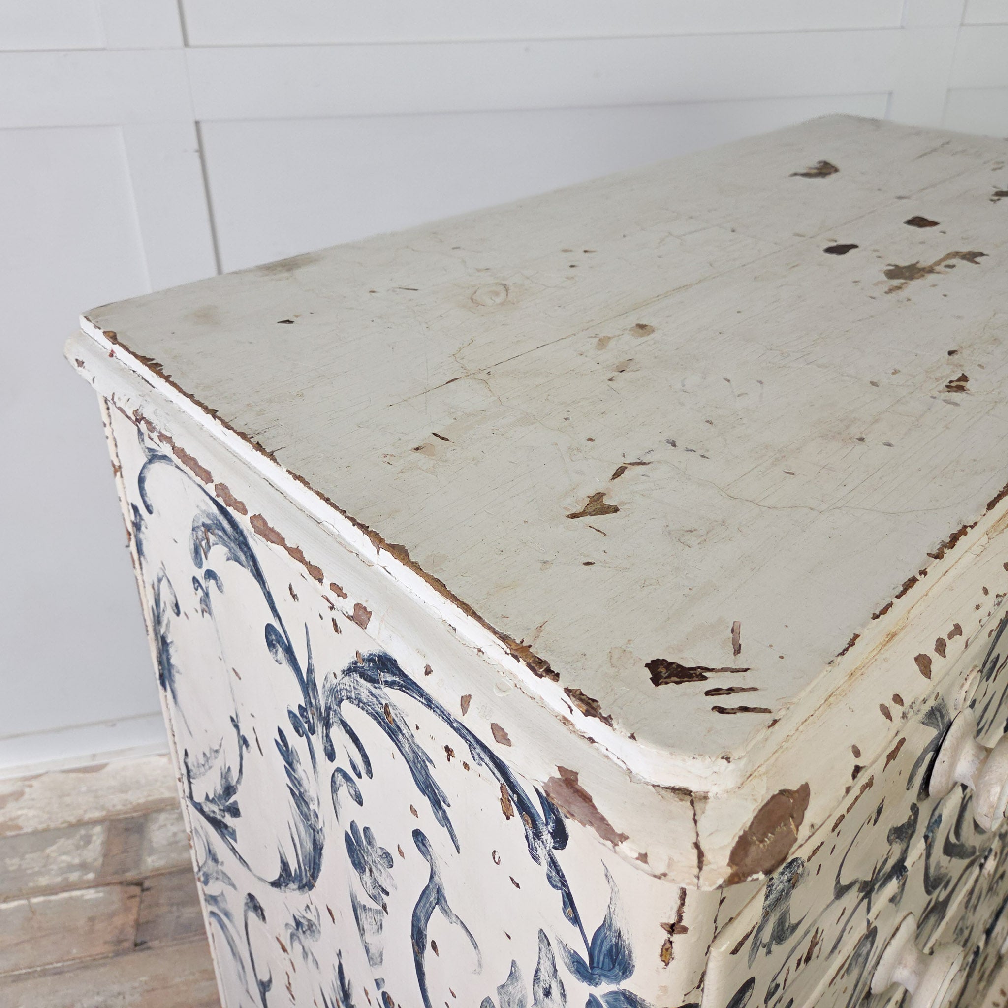 The piece has been later painted freehand in a beautiful blue and white Florentine-style design throughout, with a wonderful chippy finish that reveals the original scumble paintwork peeping through in places.