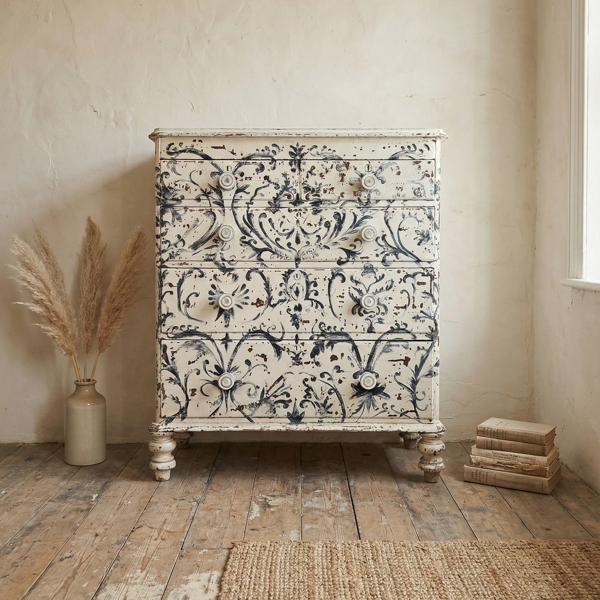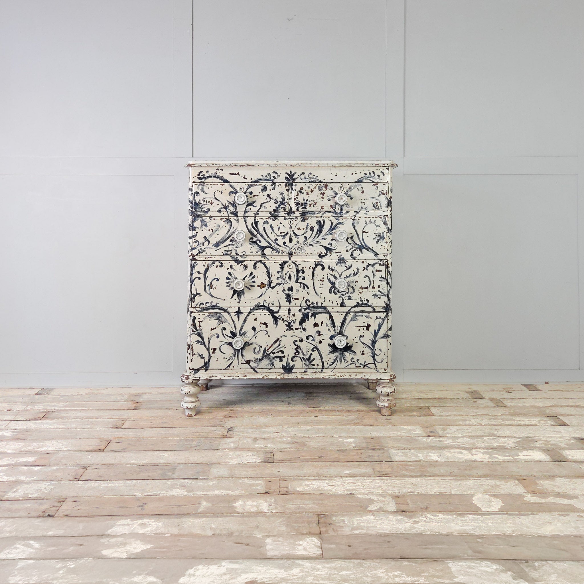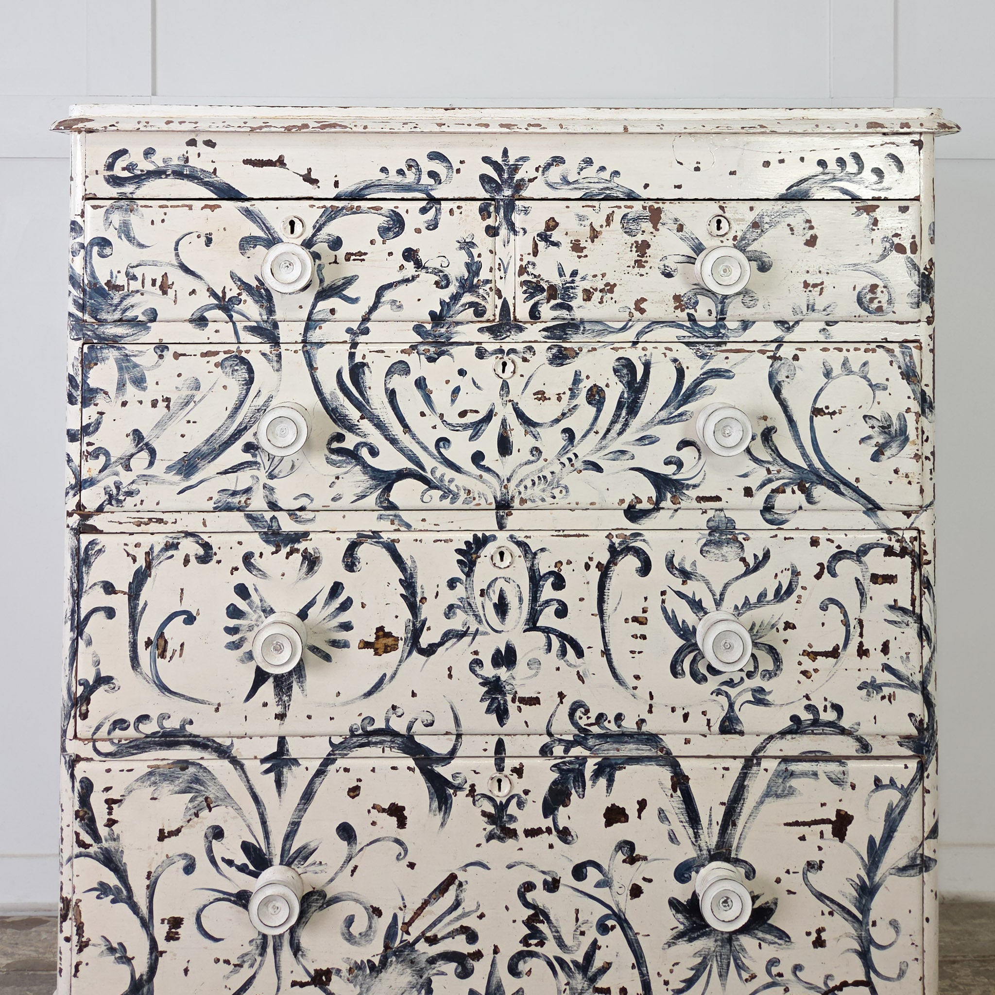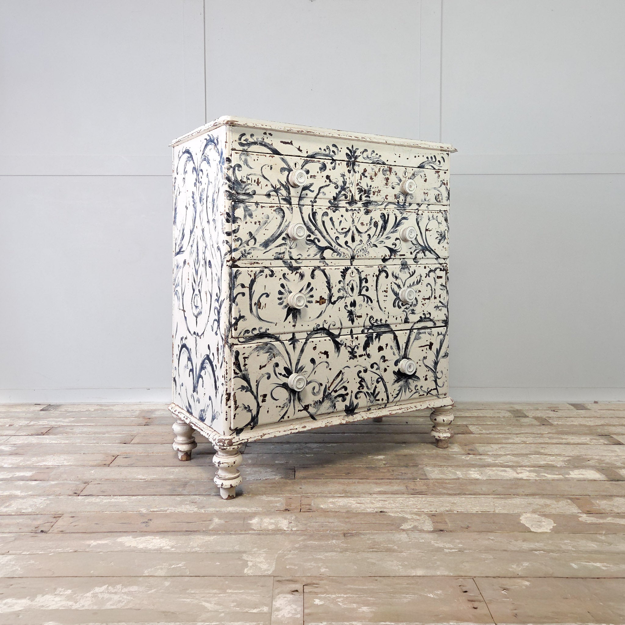 The piece has been later painted freehand in a beautiful blue and white Florentine-style design throughout, with a wonderful chippy finish that reveals the original scumble paintwork peeping through in places.