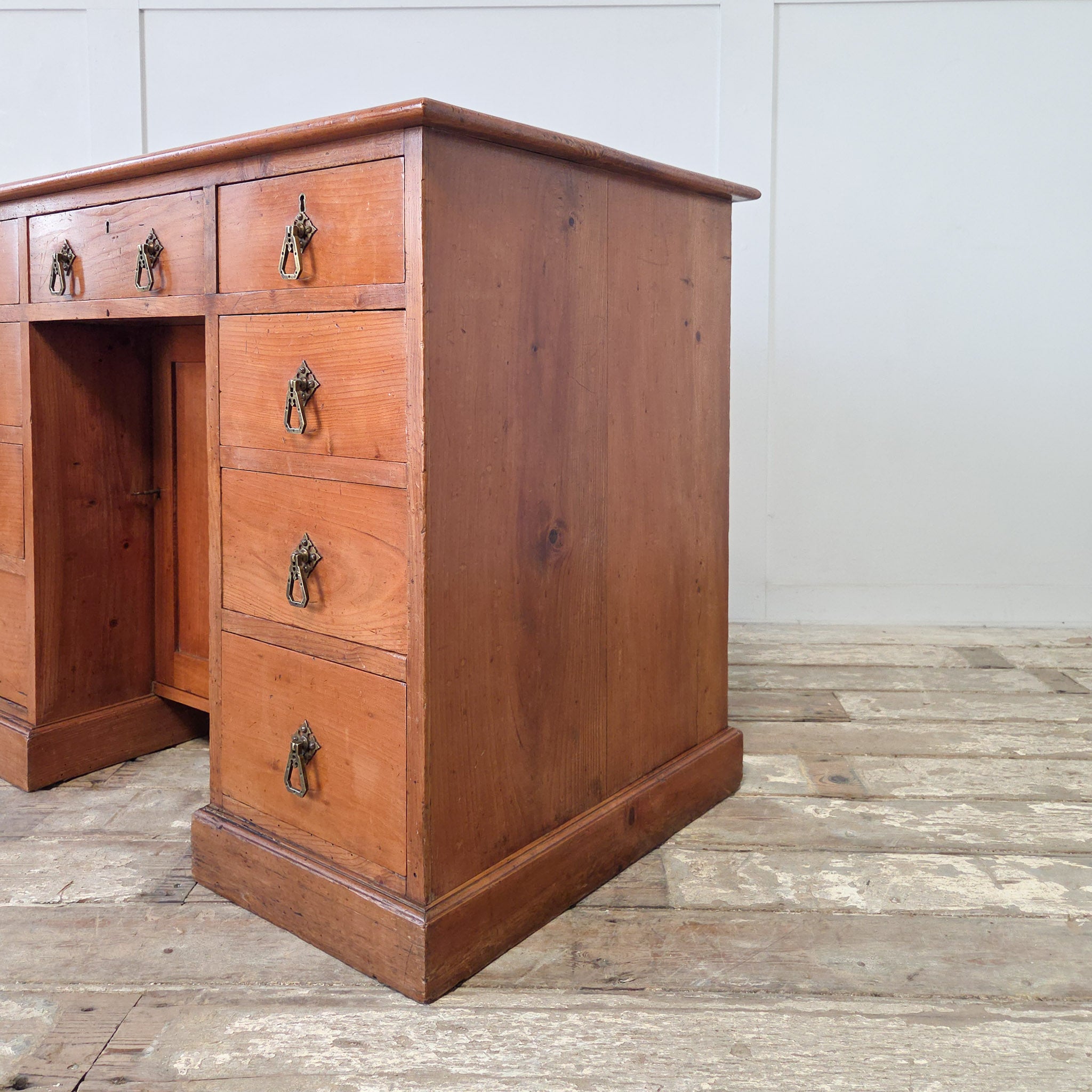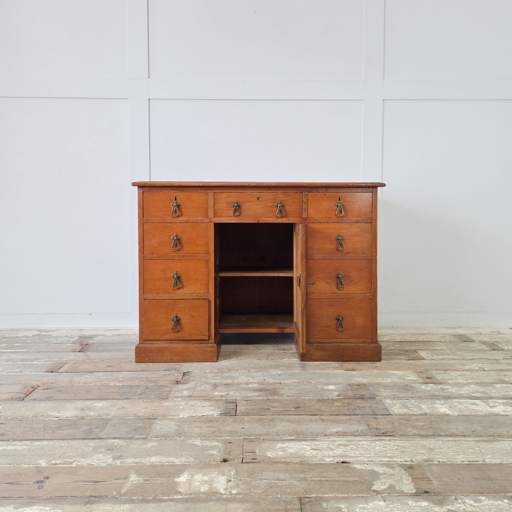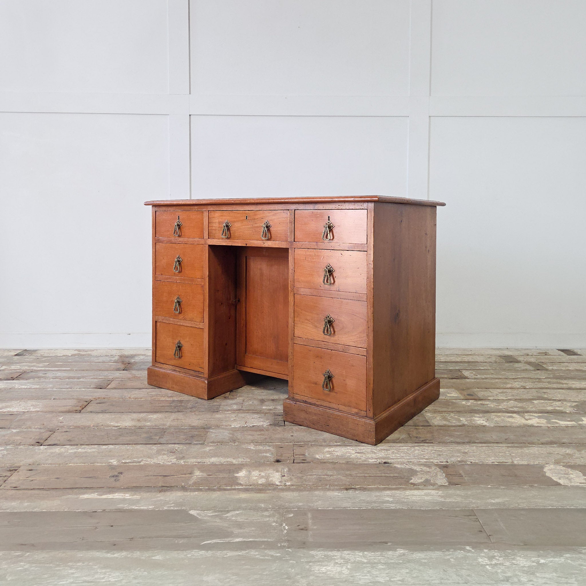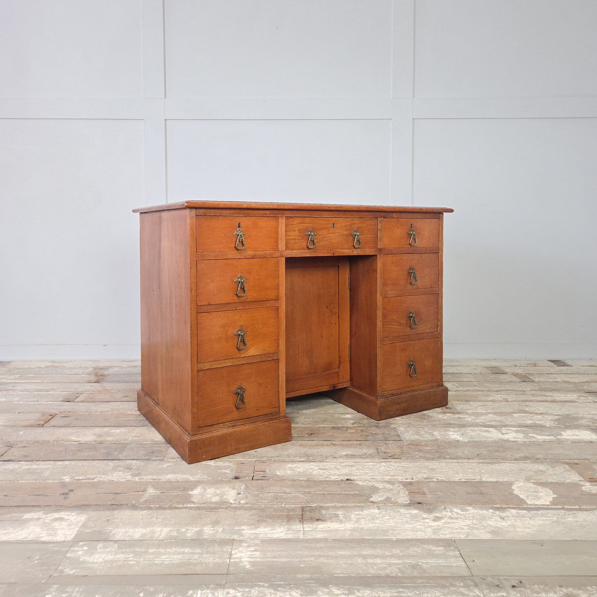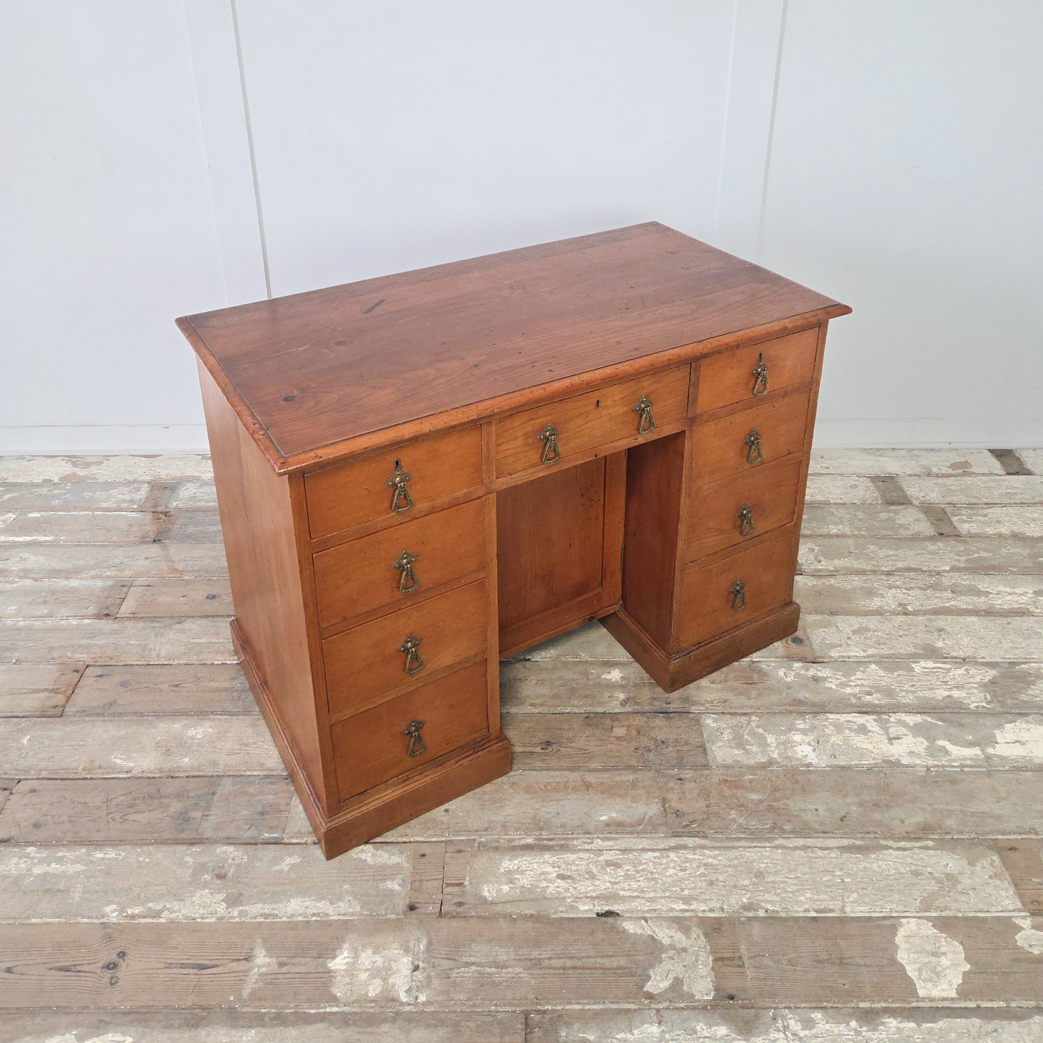 The layout features three drawers across the top and three down each side, centred around a recessed kneehole cupboard with an internal shelf. All nine drawers retain their original brass Aesthetic Movement handles - distinctive drop pendants that date the piece to between 1870 and 1900.