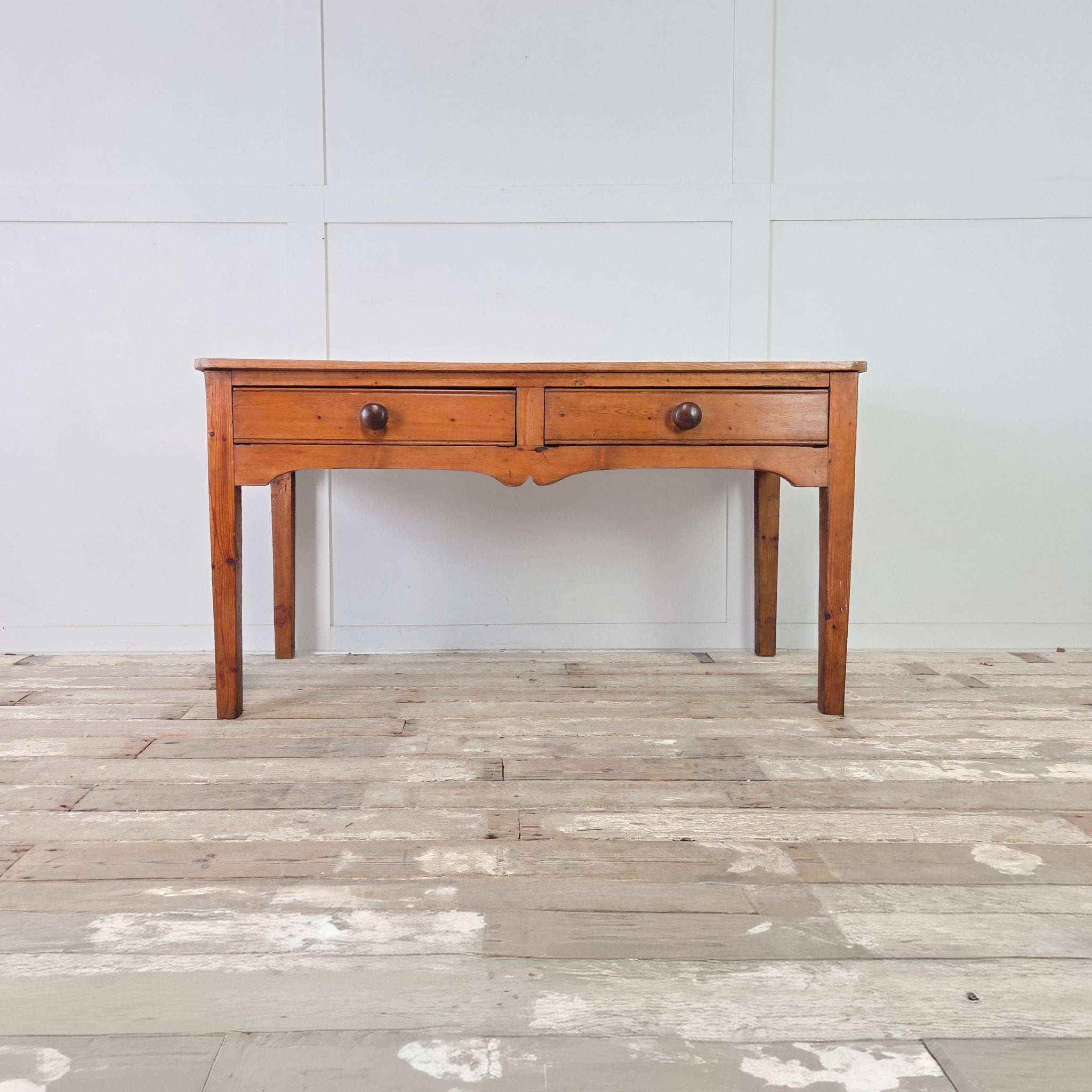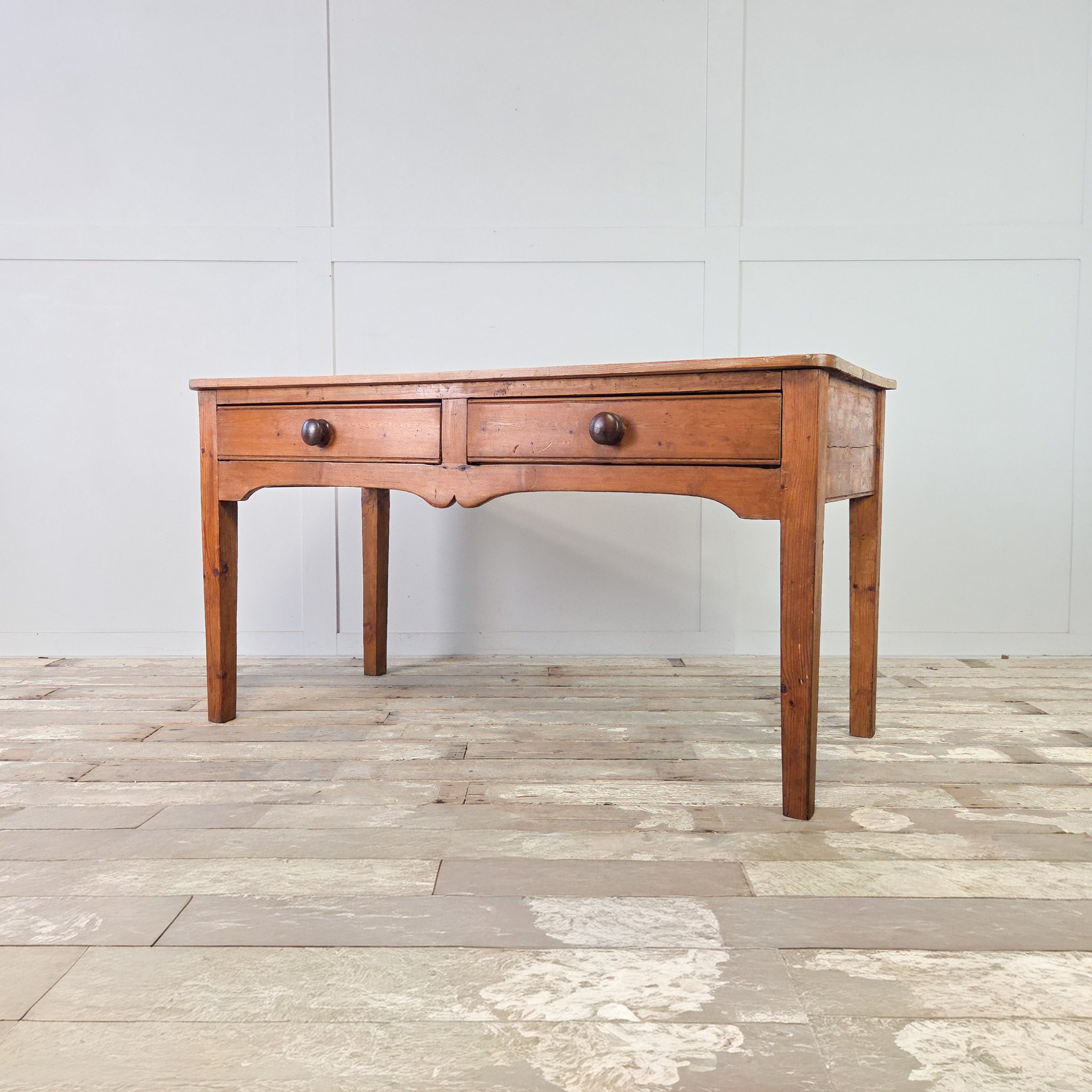 Dating from the mid to late 19th century, this rustic farmhouse table features a nicely worn scrub pine top which sits above two useful drawers, each fitted with a matching turned wooden knob. The whole piece stands on sturdy square legs and is finished with a decorative shaped apron to the front.