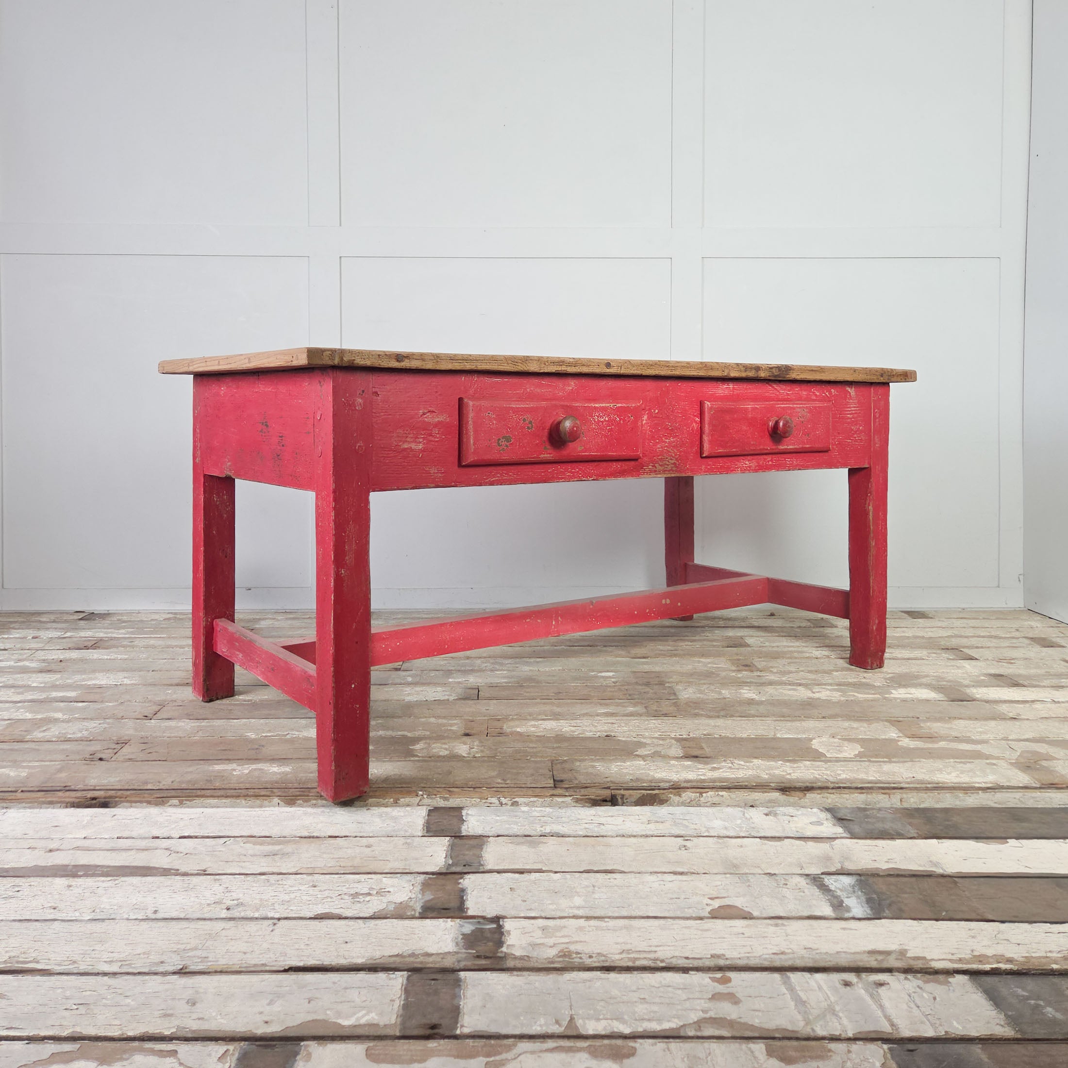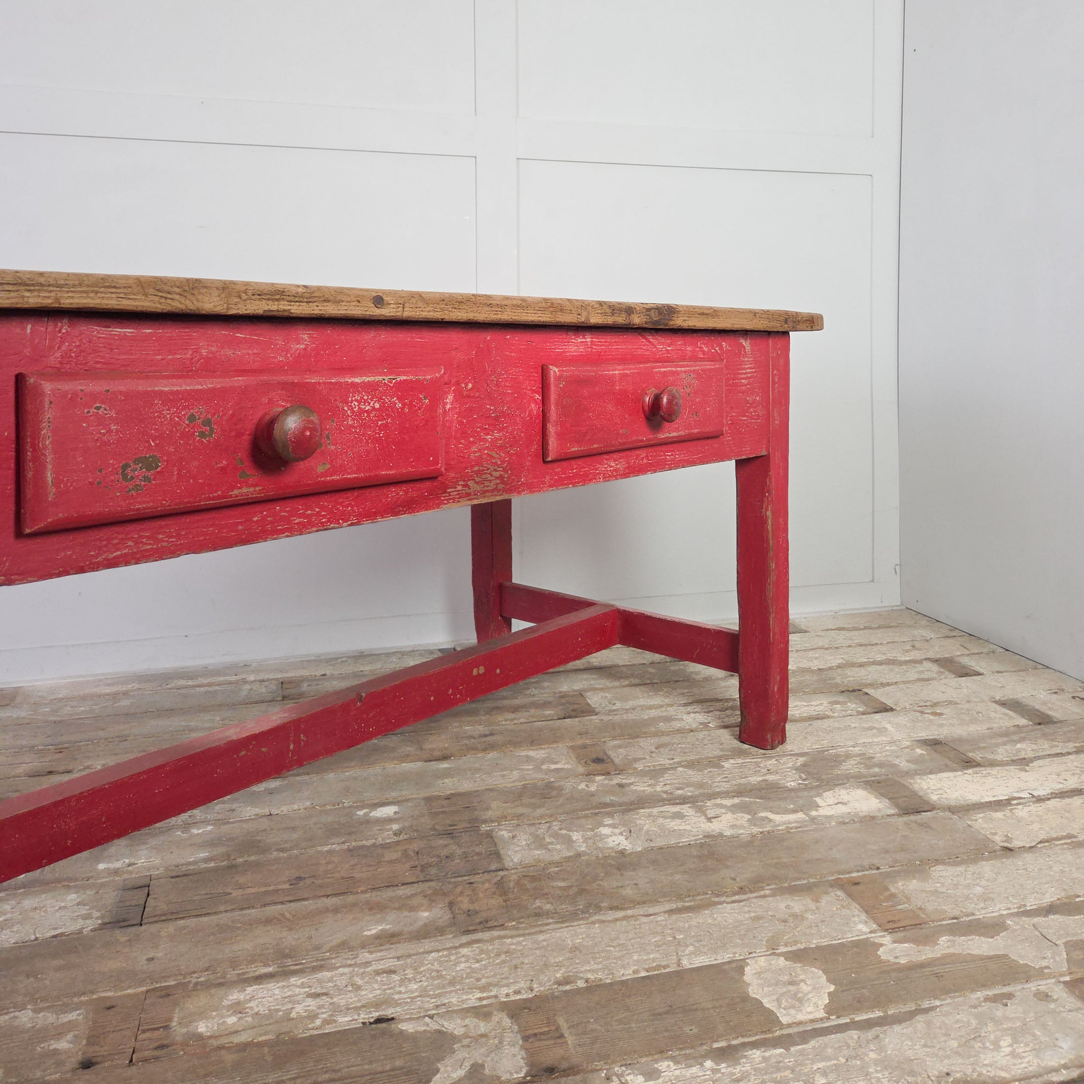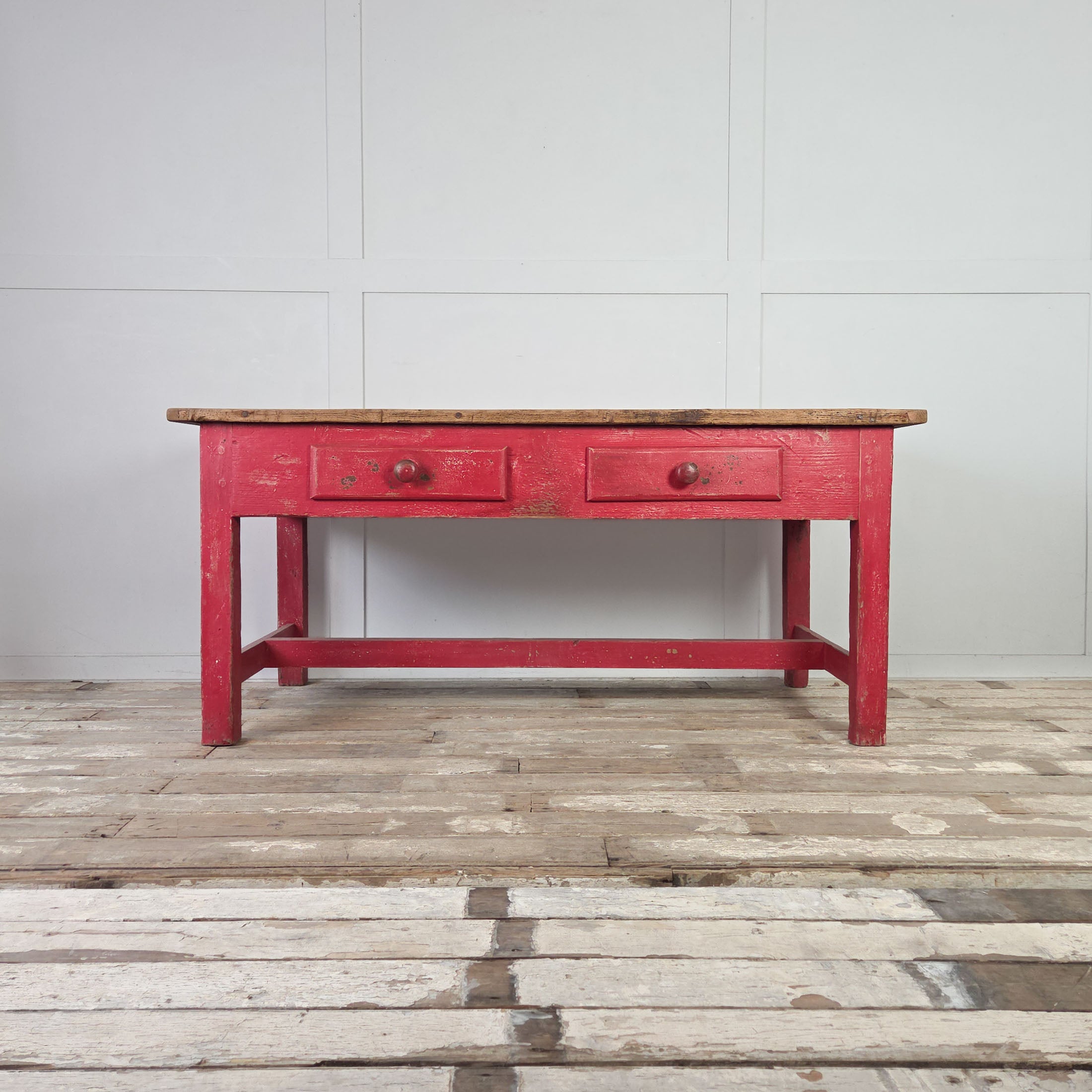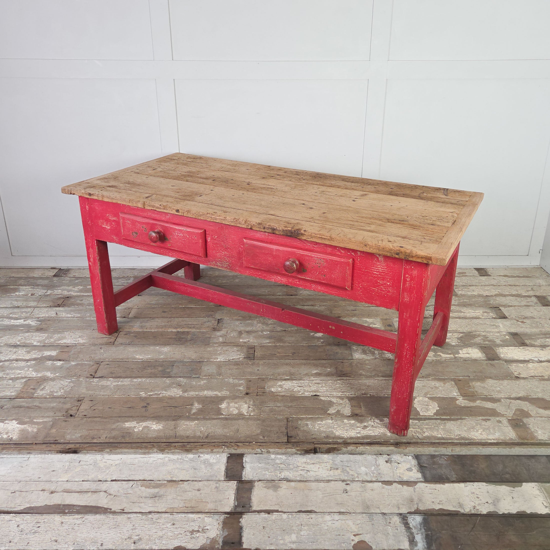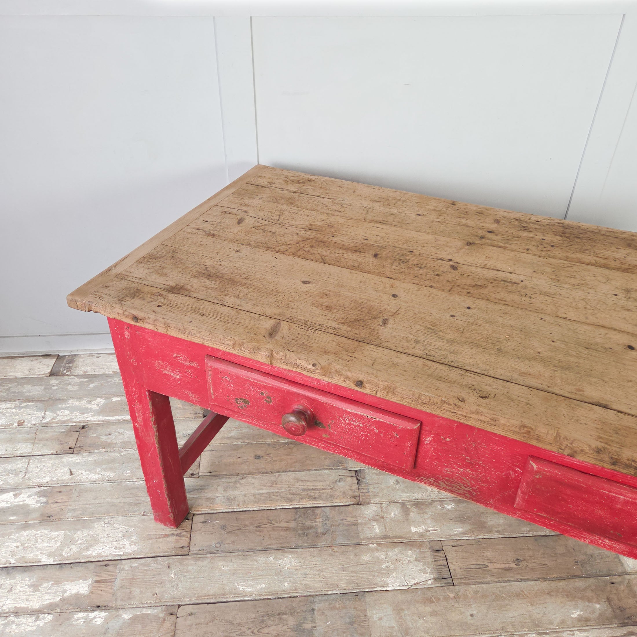 Dating from the late 19th century, this is a good sized farmhouse table. The scrubbed pine top is made from four planks with cleated ends, a practical design feature from the period that prevents the boards from warping. Below, the red painted base features two drawers, each with a turned wooden knob.
